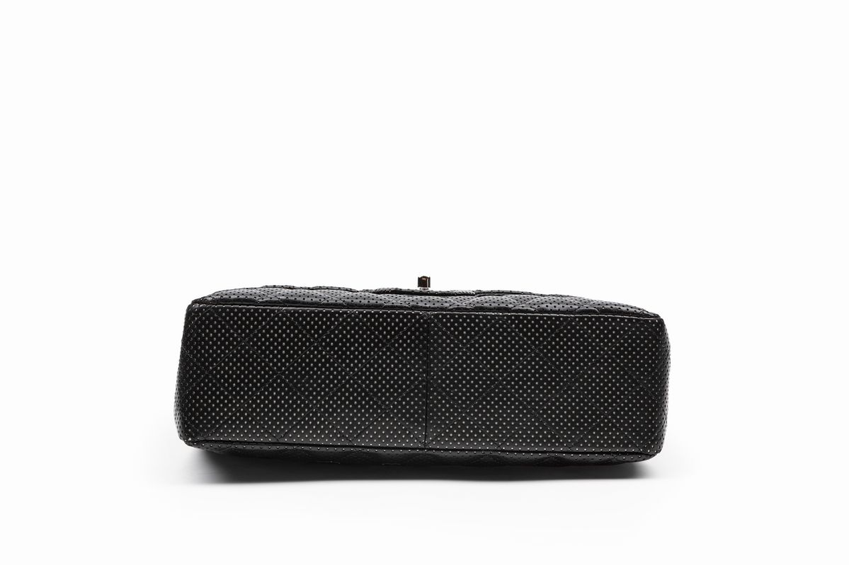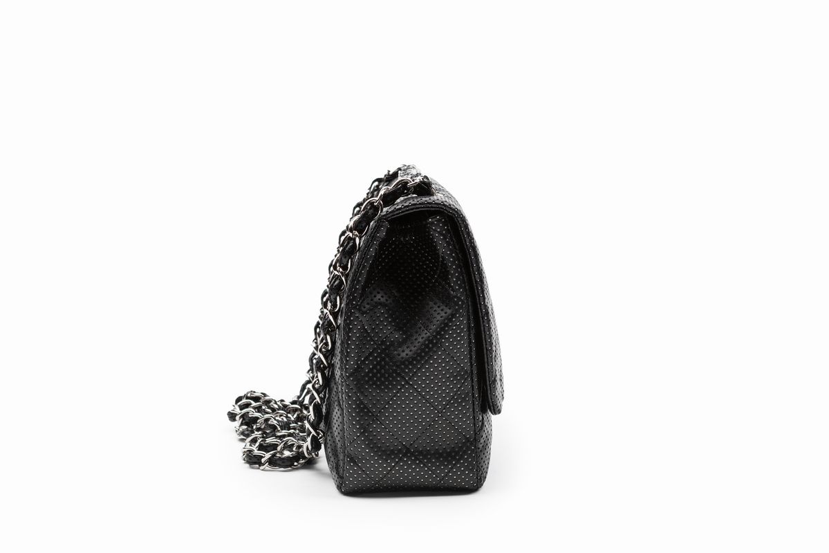 in pelle matelassé traforata color nero, con tracolla a catena, cm 30, con sacchetto