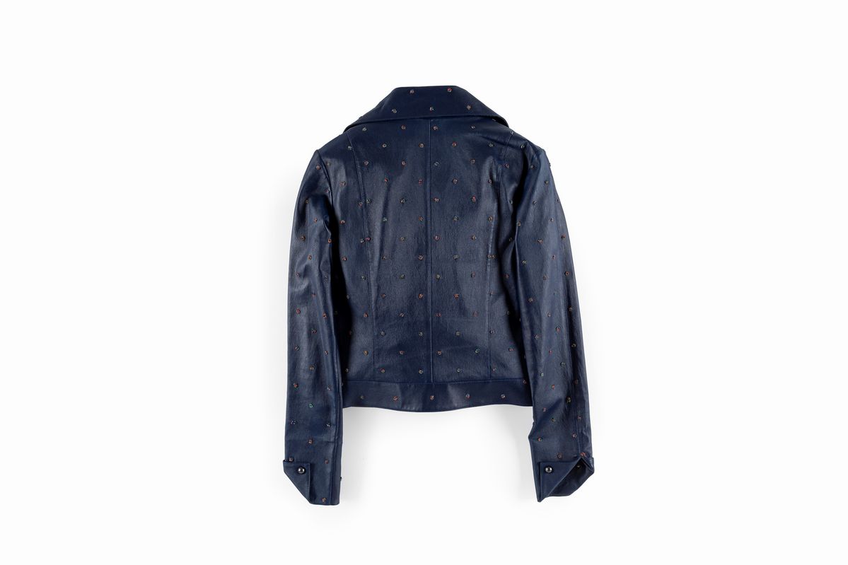 a manica lunga in pelle di agnello color blu con applicazioni colorate in lana bouclé, taglia 34 francese, con custodia (nuovo e mai indossato)Base d'asta