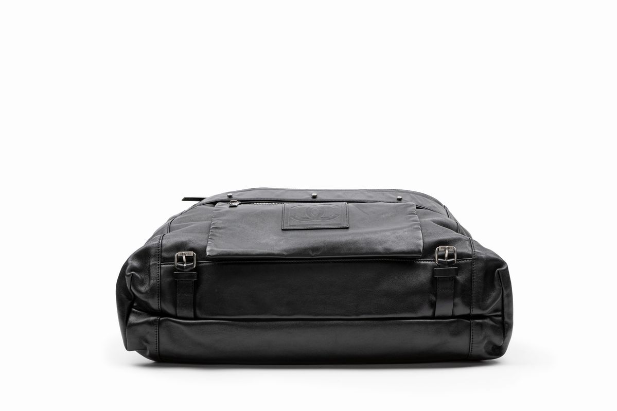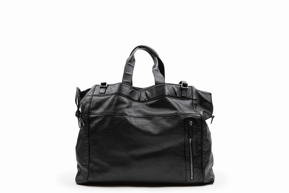 in pelle color nero, vari scomparti con chiusura a cerniera, doppi manici e tracolla staccabile, cm 50, con sacchetto (nuova e mai usata)Base d'asta