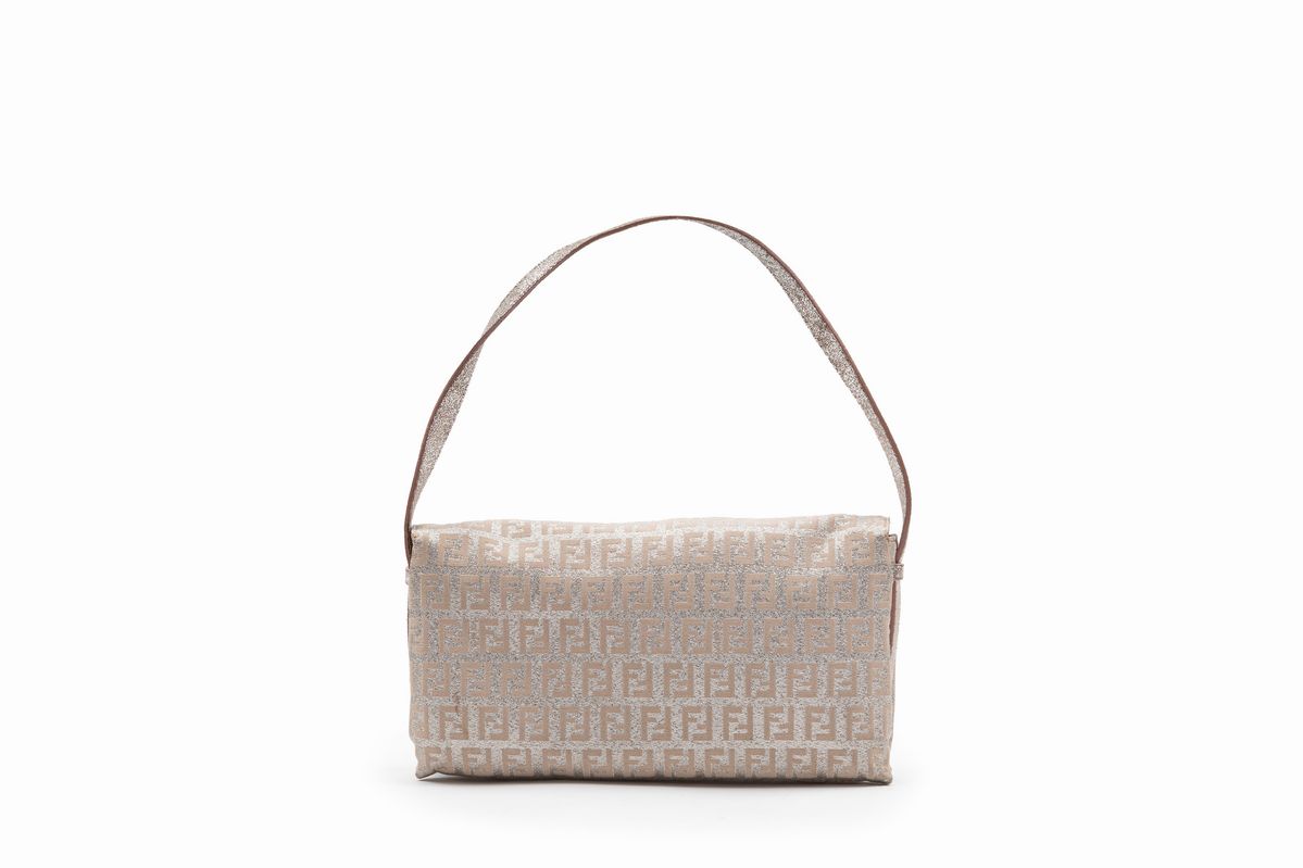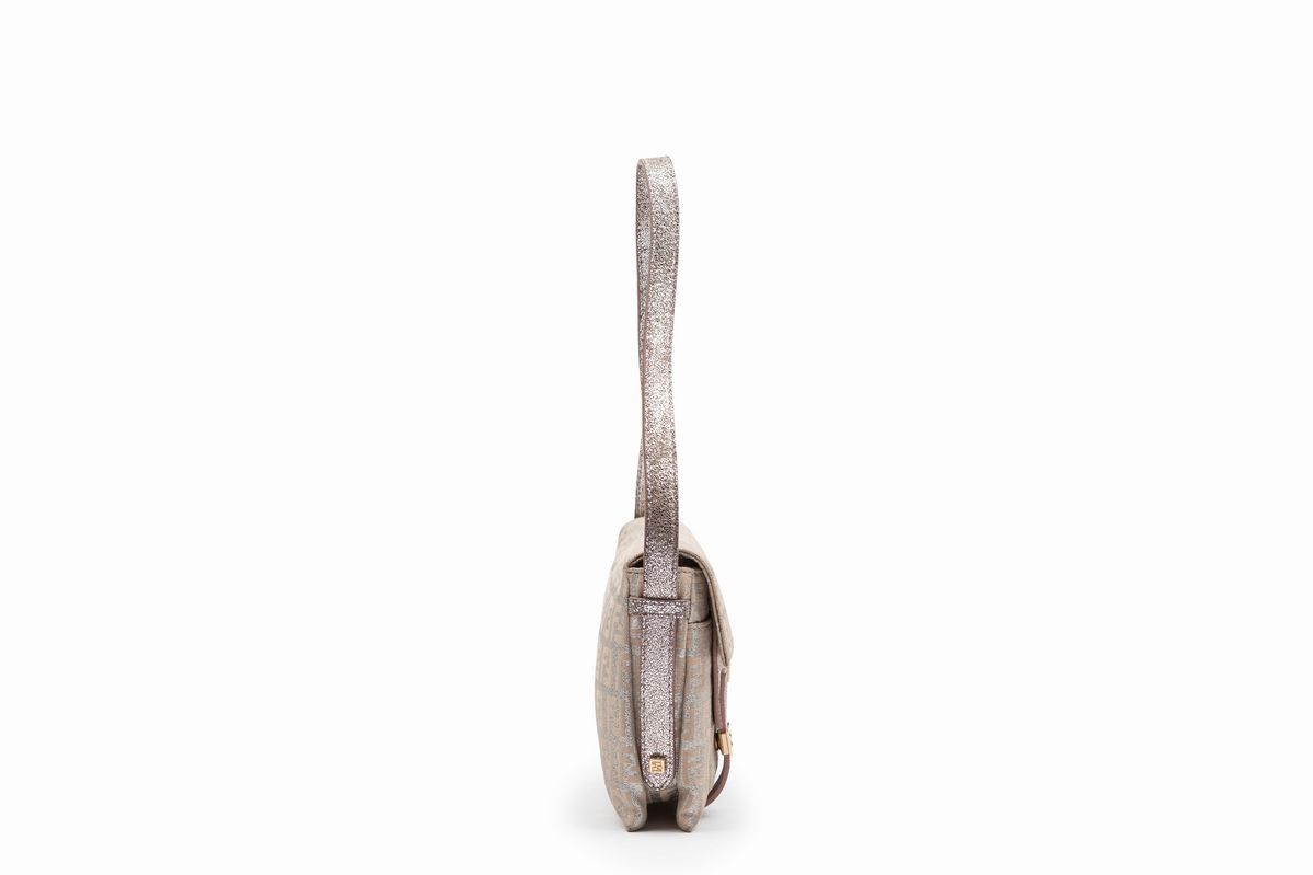 in tessuto logato bicolore rosa cipria e argento, dettagli in metallo dorato, cm 24 (lievi difetti)Base d'asta