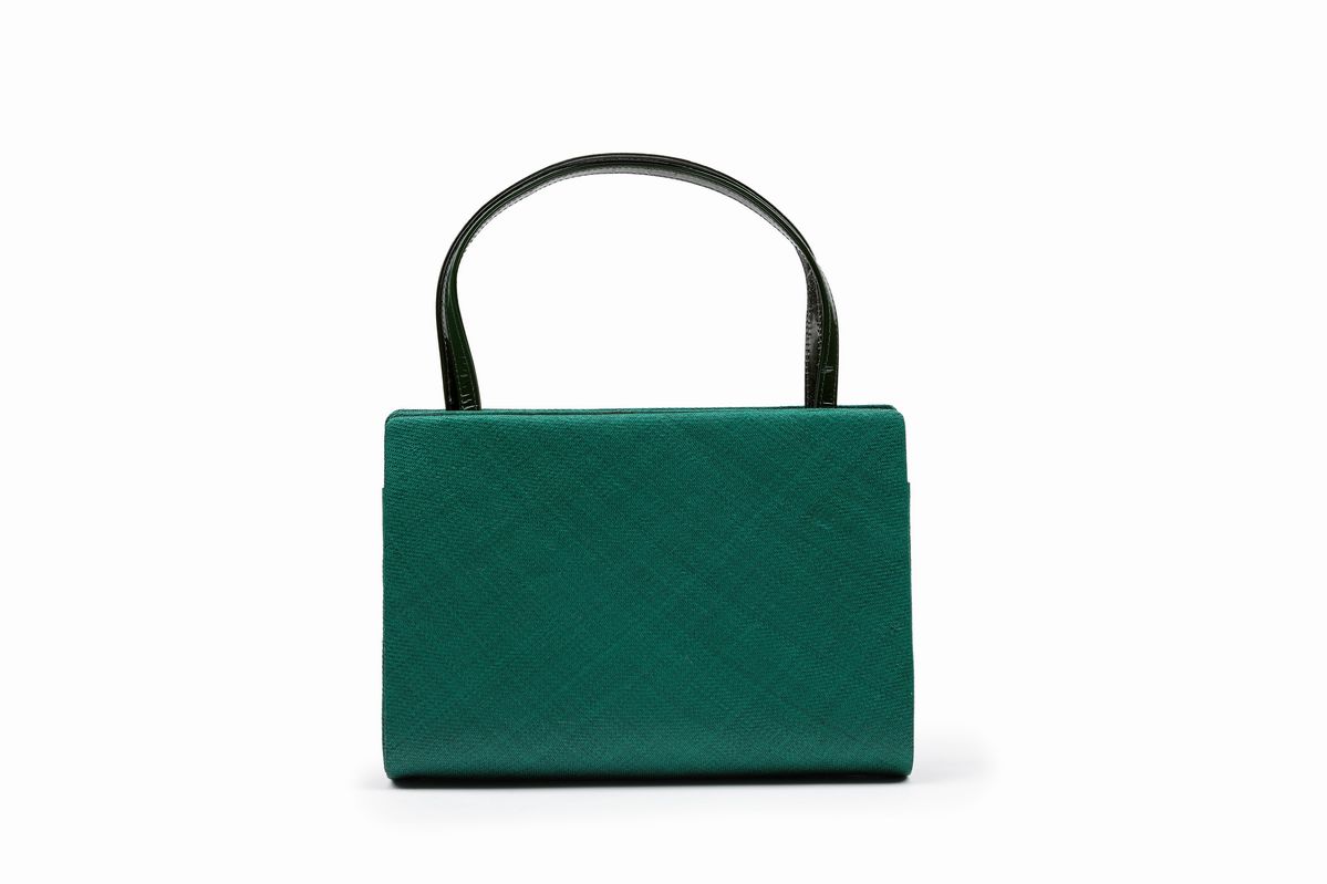 in rafia e pelle color verde smeraldo, doppi manici in vernice, cm 23, con sacchetto (lievissimi difetti)Base d'asta