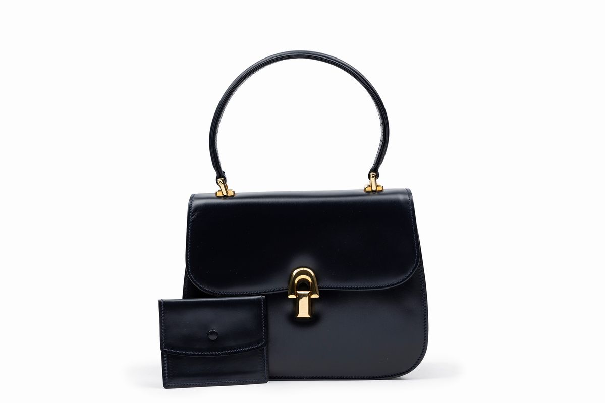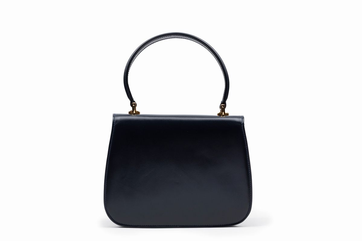 in pelle blu, manico stondato, dettagli in metallo dorato, cm 22, con sacchettoBase d'asta