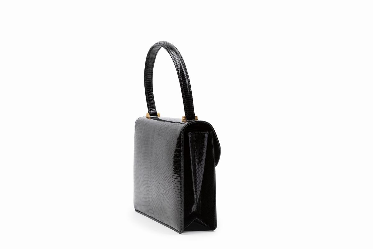 in pelle di lucertola color nero, manico stondato, dettagli in metallo dorato, cm 22, con sacchetto.