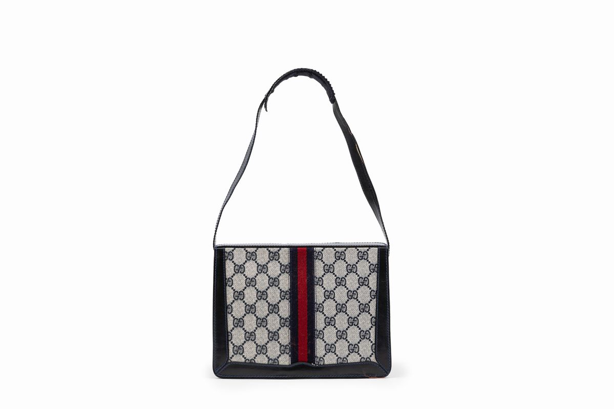 in tessuto GG plastificato bicolore bianco e blu, tracolla e profili in pelle, banda web rossa e blu, dettagli in metallo dorato, cm 23 (lievissimi difetti)Base d'asta
