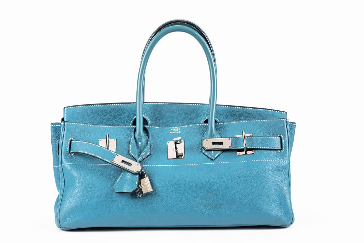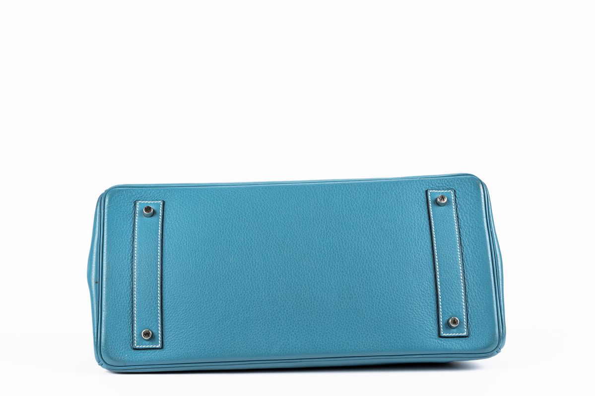 in pelle taurillon clemence color blue jean, dettagli in palladio, cm 40, con sacchetto e scatola (lievi difetti)Base d'asta