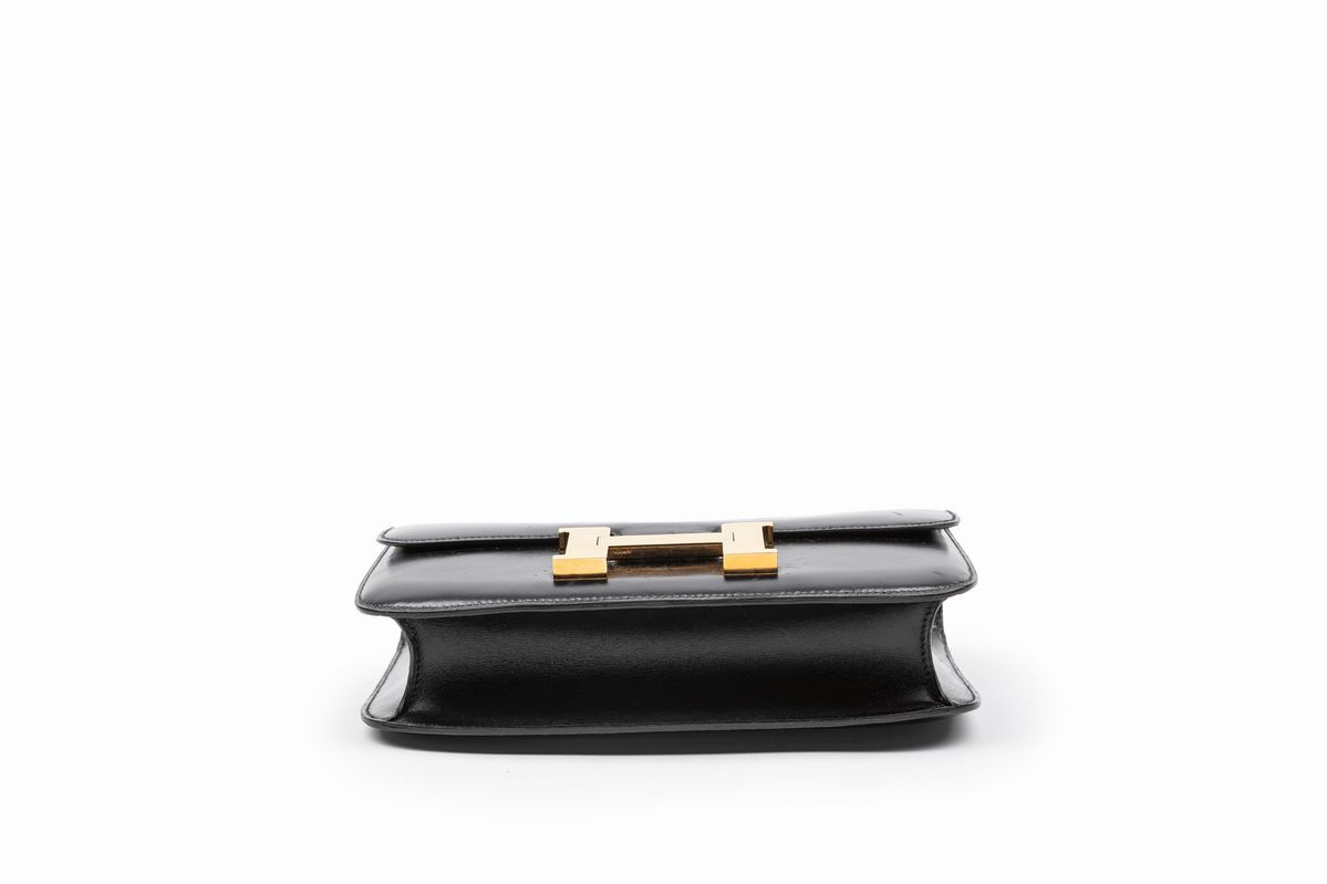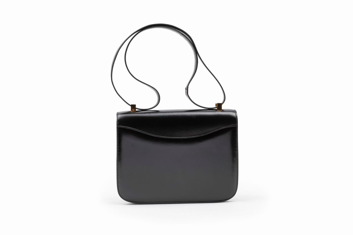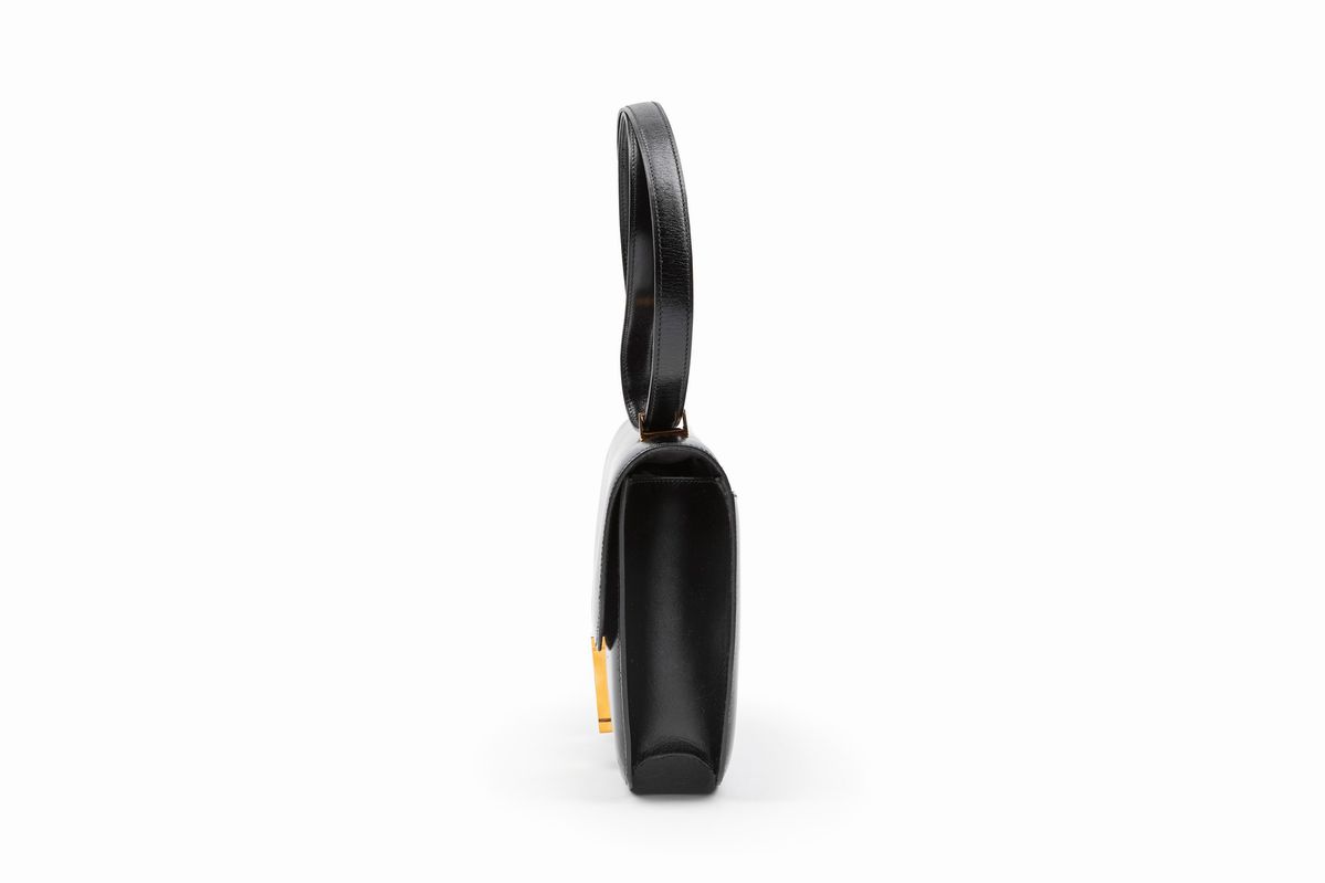 in pelle box color nero, dettagli in metallo dorato, cm 23 (lievi difetti)Base d'asta