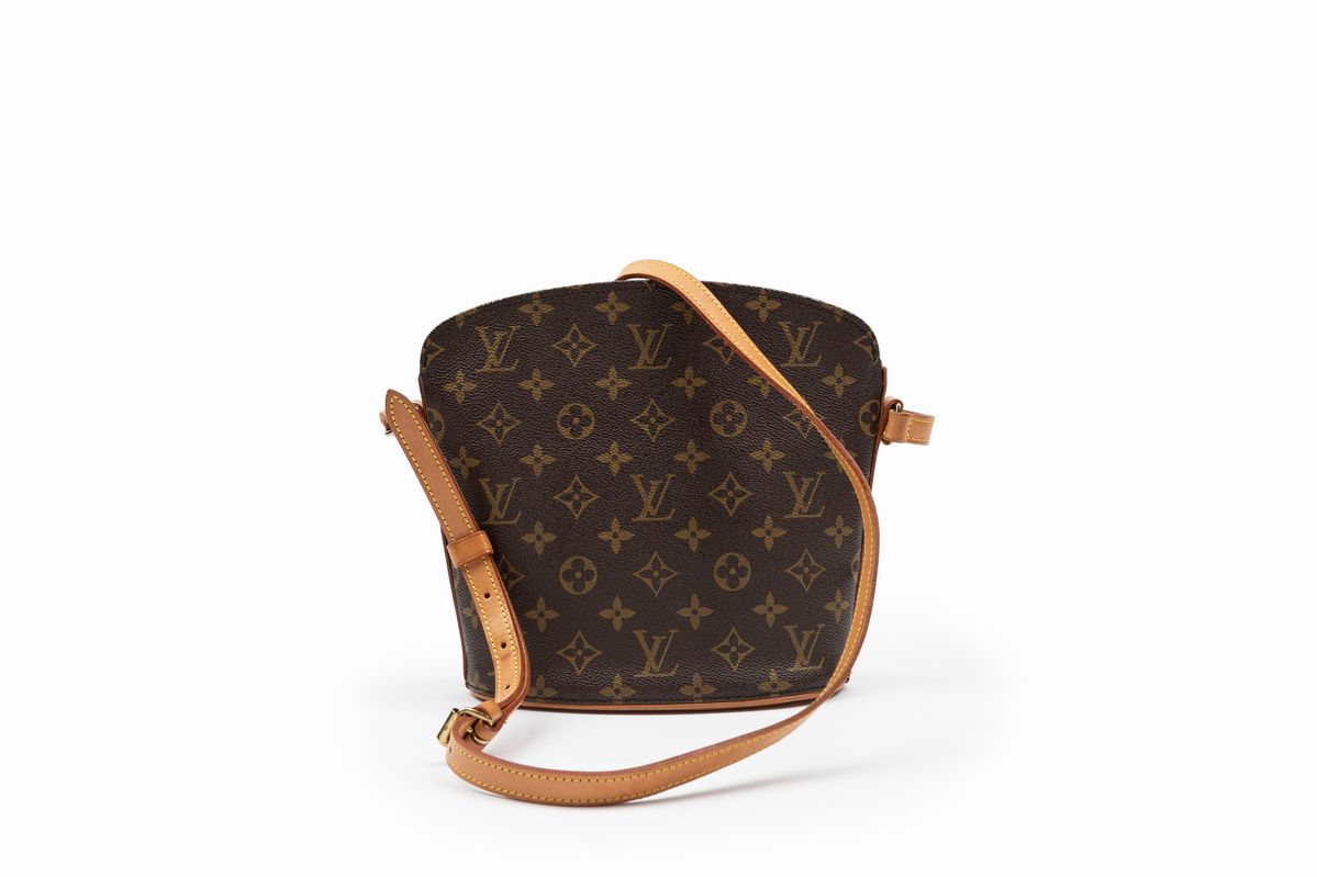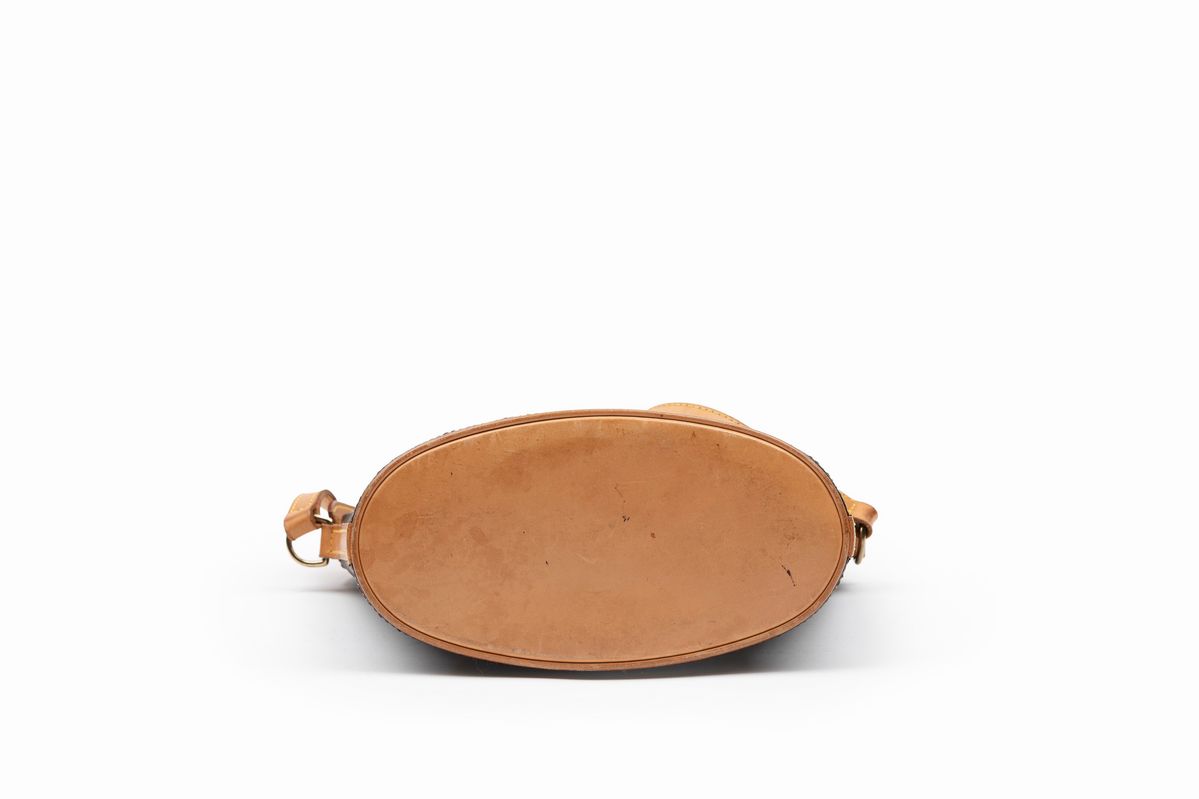 con base ovale in tela monogram, tracolla in pelle regolabile, cm 20 (difetti importanti nella bustina interna)Base d'asta