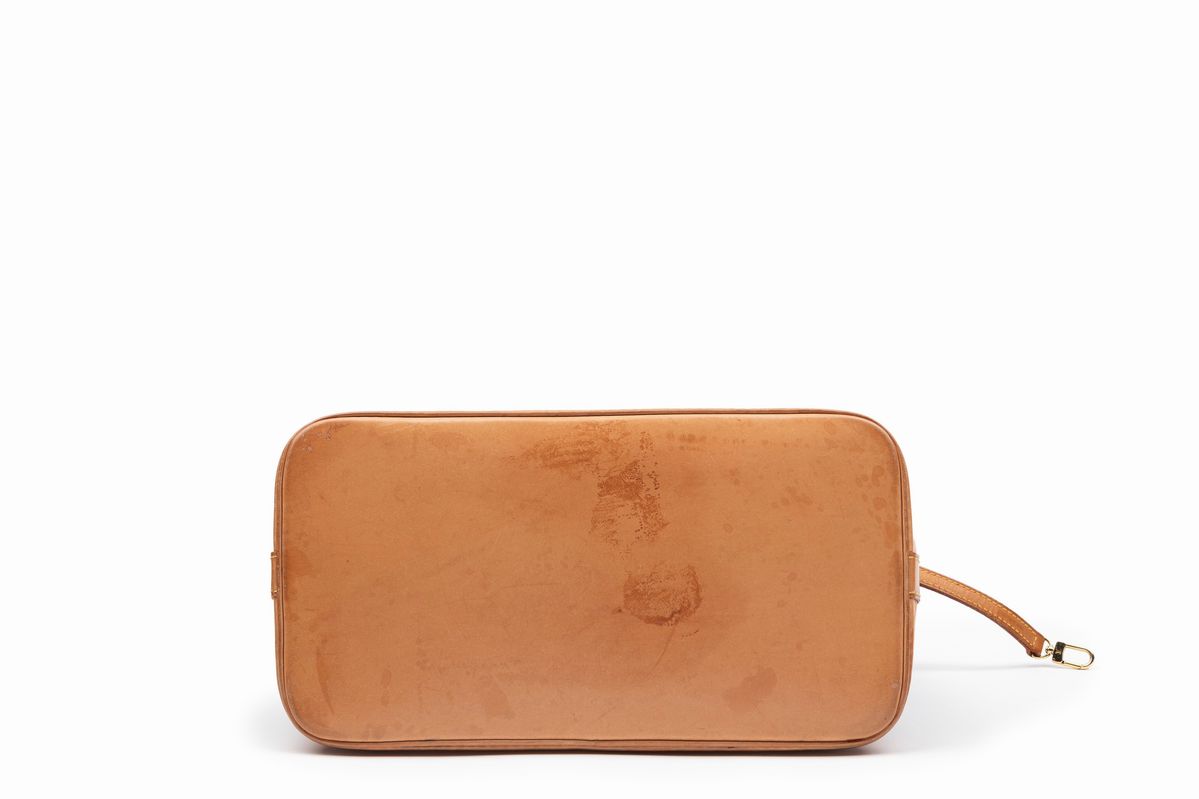 in tela monogram, doppi manici, profili in pelle, dettagli in metallo dorato, cm 30 (difetti, mancante di chiave)
