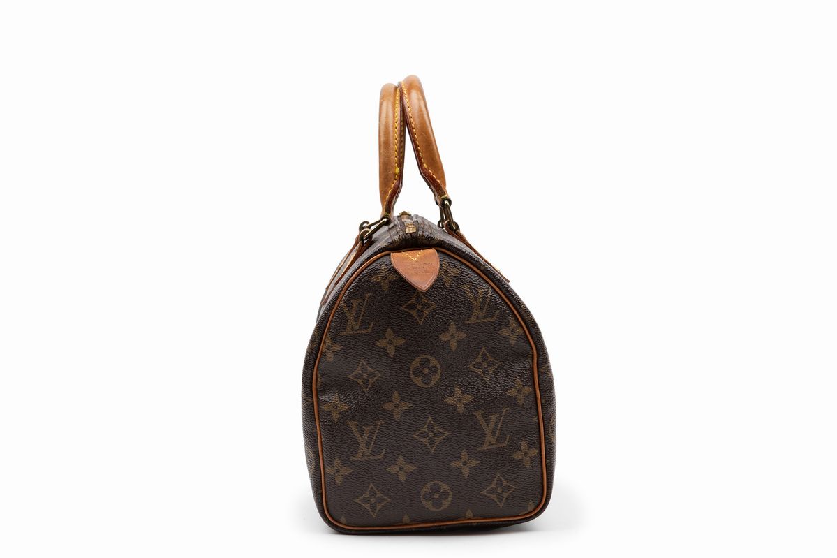in tela monogram, doppi manici, profili in pelle, cm 25 (difetti, mancante di chiave)Base d'asta