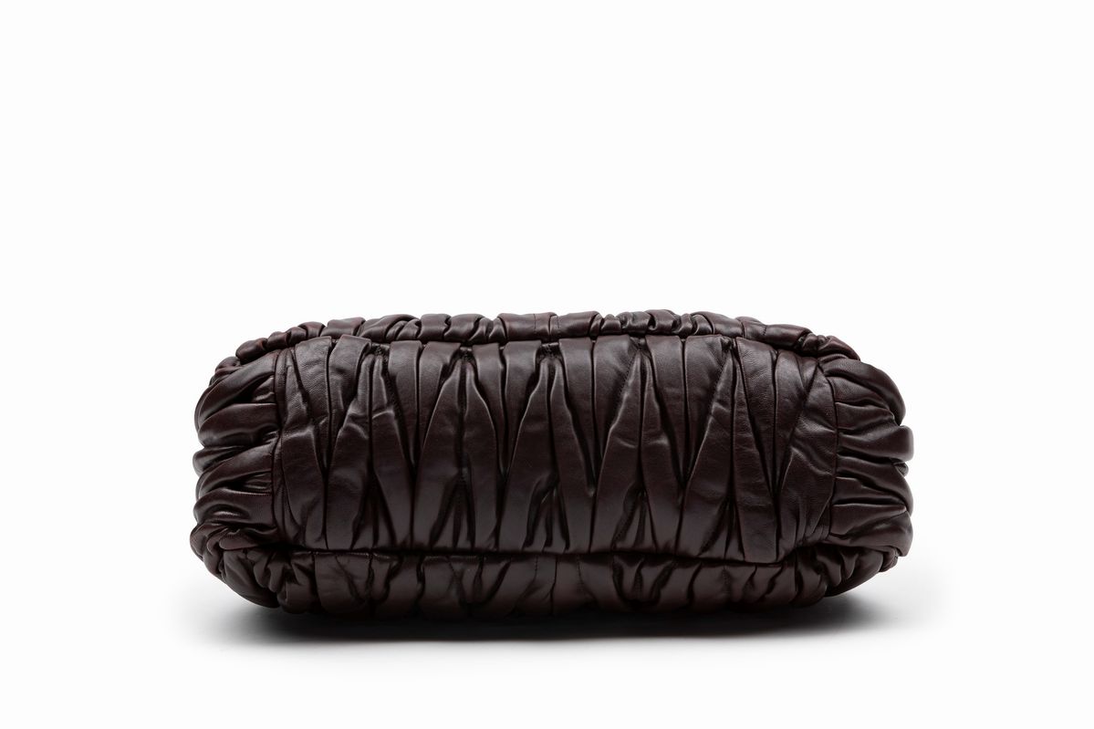 in pelle goffrata matelassé color prugna, doppi manici intrecciati, dettagli in metallo dorato satinato, cm 40, con sacchetto (lievi difetti)Base d'asta