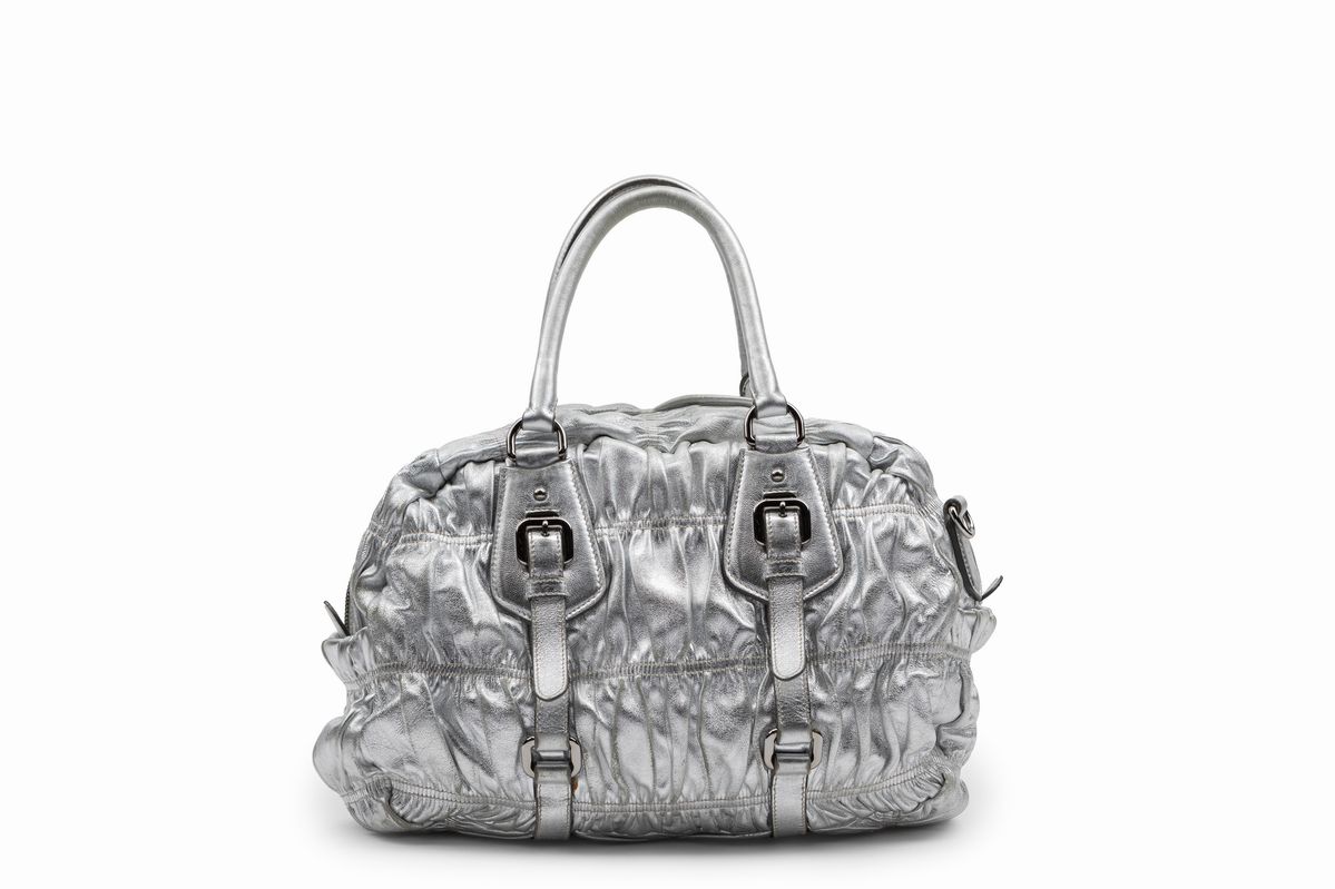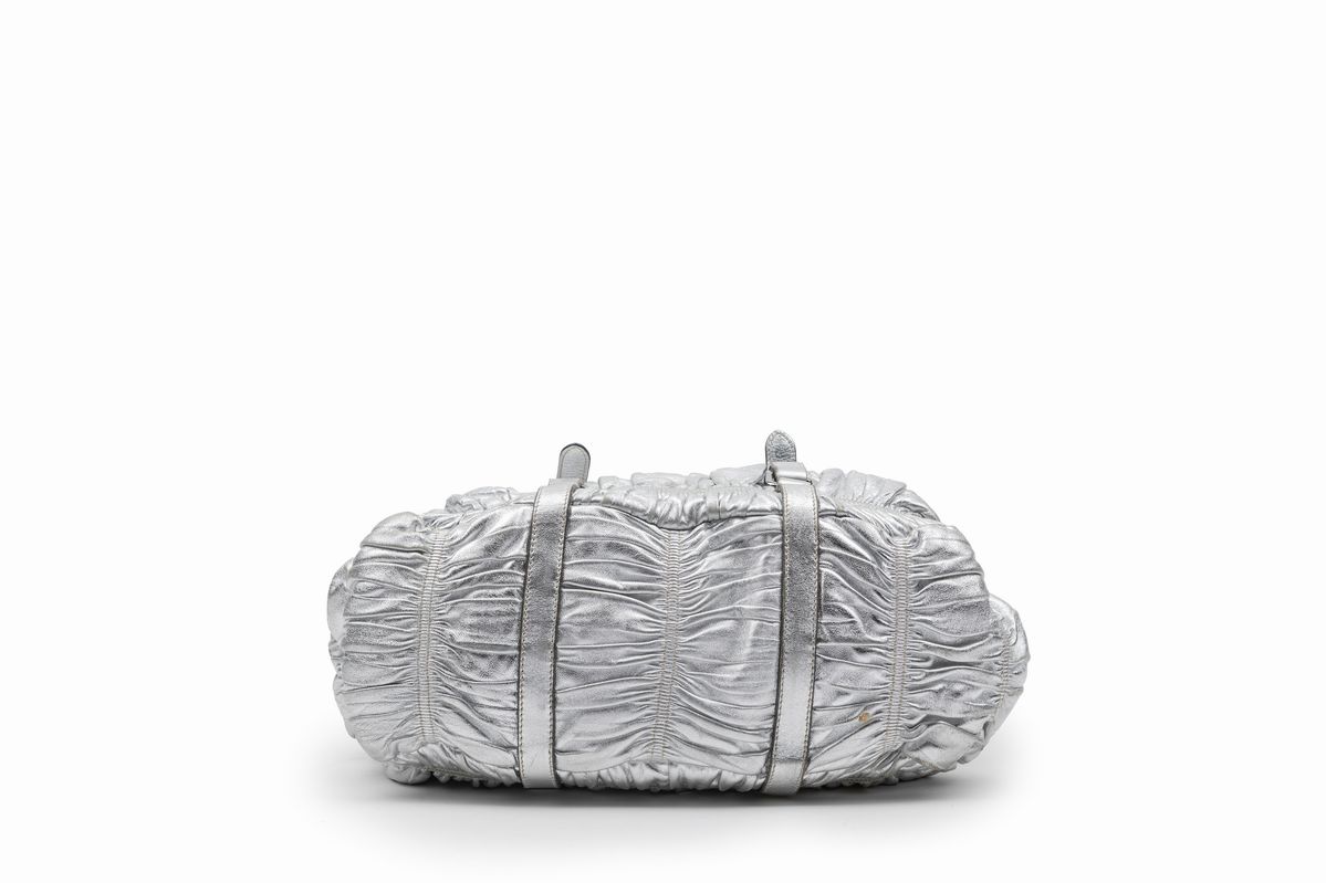 in pelle goffrata argentata e arricciata, doppi manici, dettagli in metallo, tracolla staccabile, cm 30 (difetti)Base d'asta