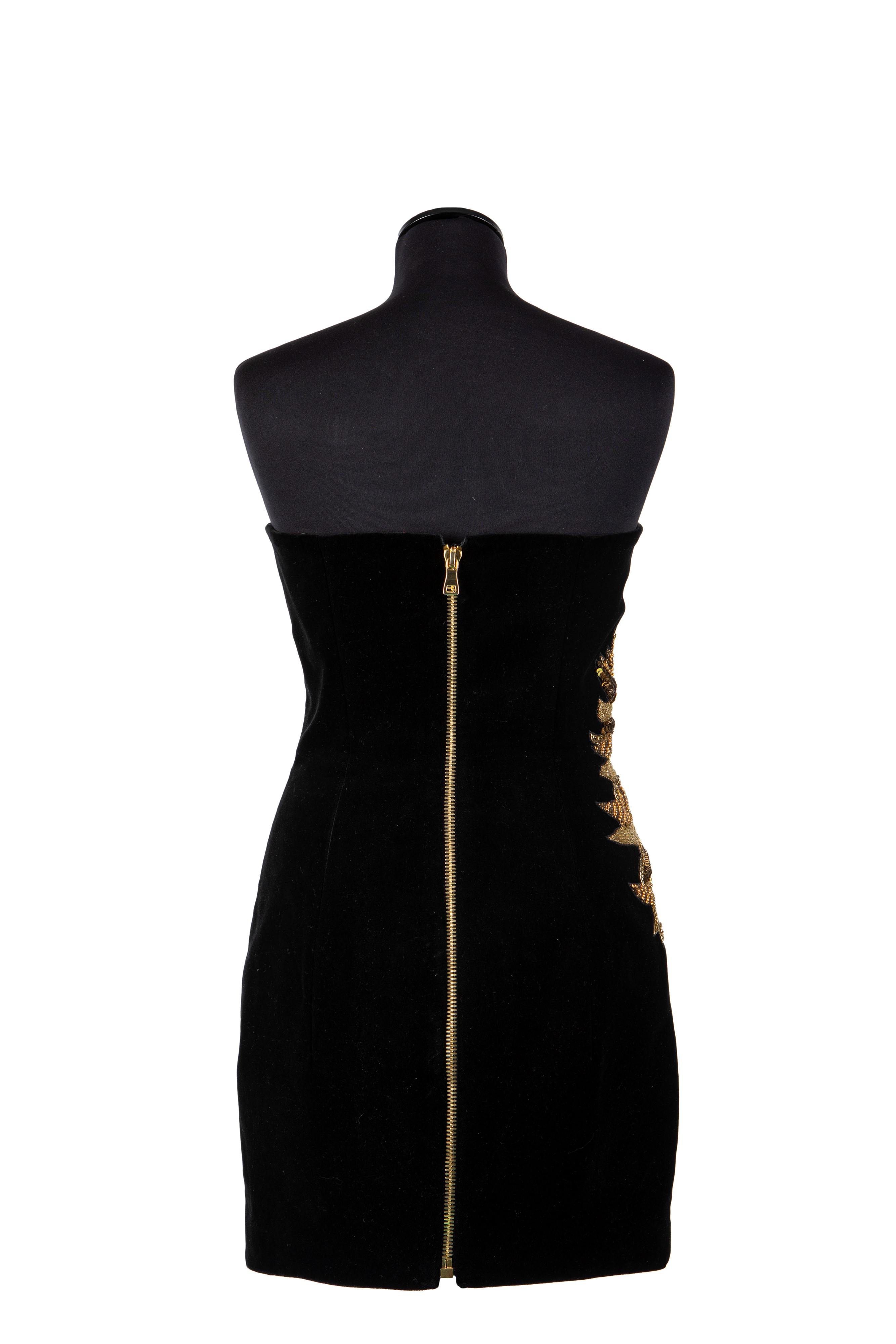 in velluto color nero con un grande leone ricamato a mano con perline e canottiglie di vetro, elementi in metallo dorato e paillettes, taglia 38, altezza cm 63 (lievissimi difetti)Base d'asta