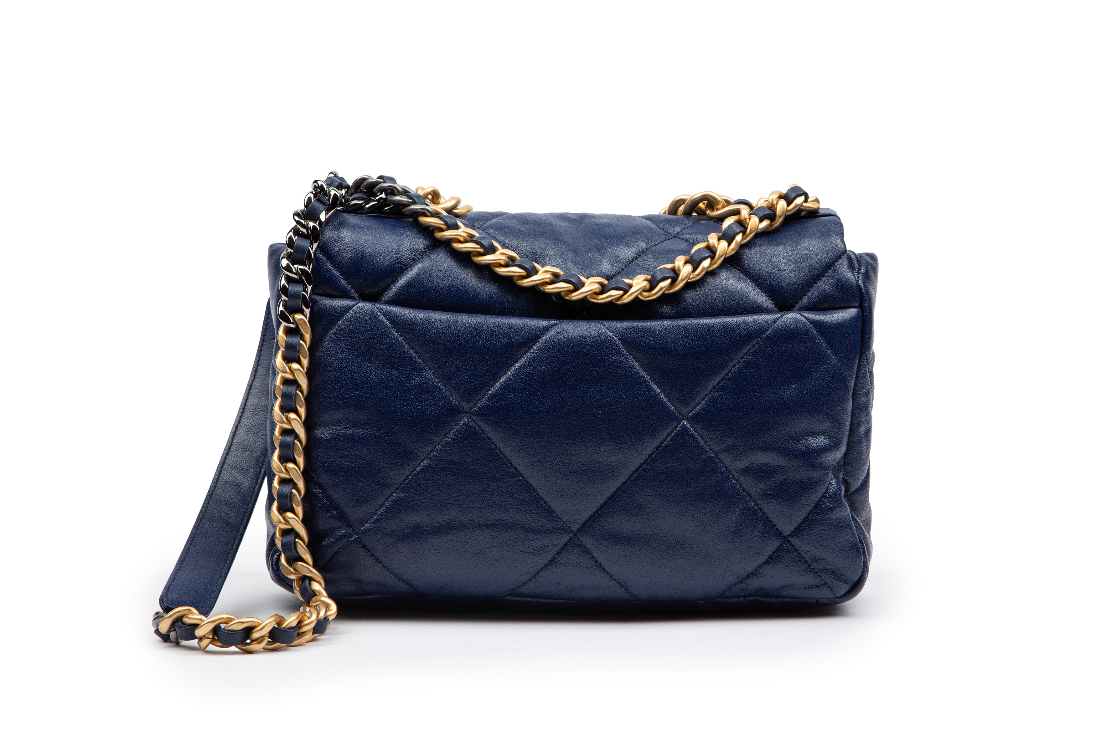 in pelle color bluette trapuntata, dettagli e tracolla a catena in metallo bicolore, cm 30, con sacchettoBase d'asta