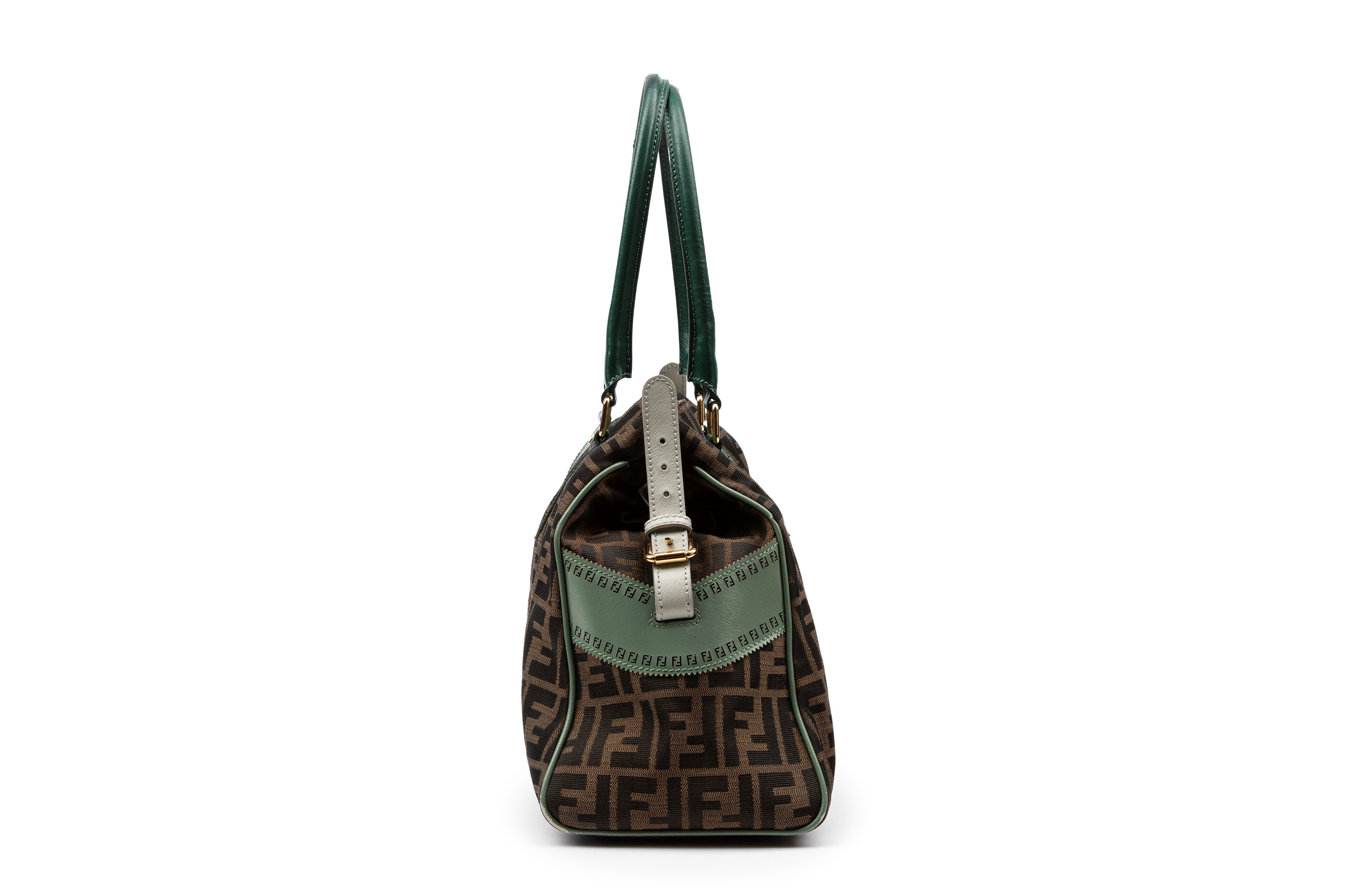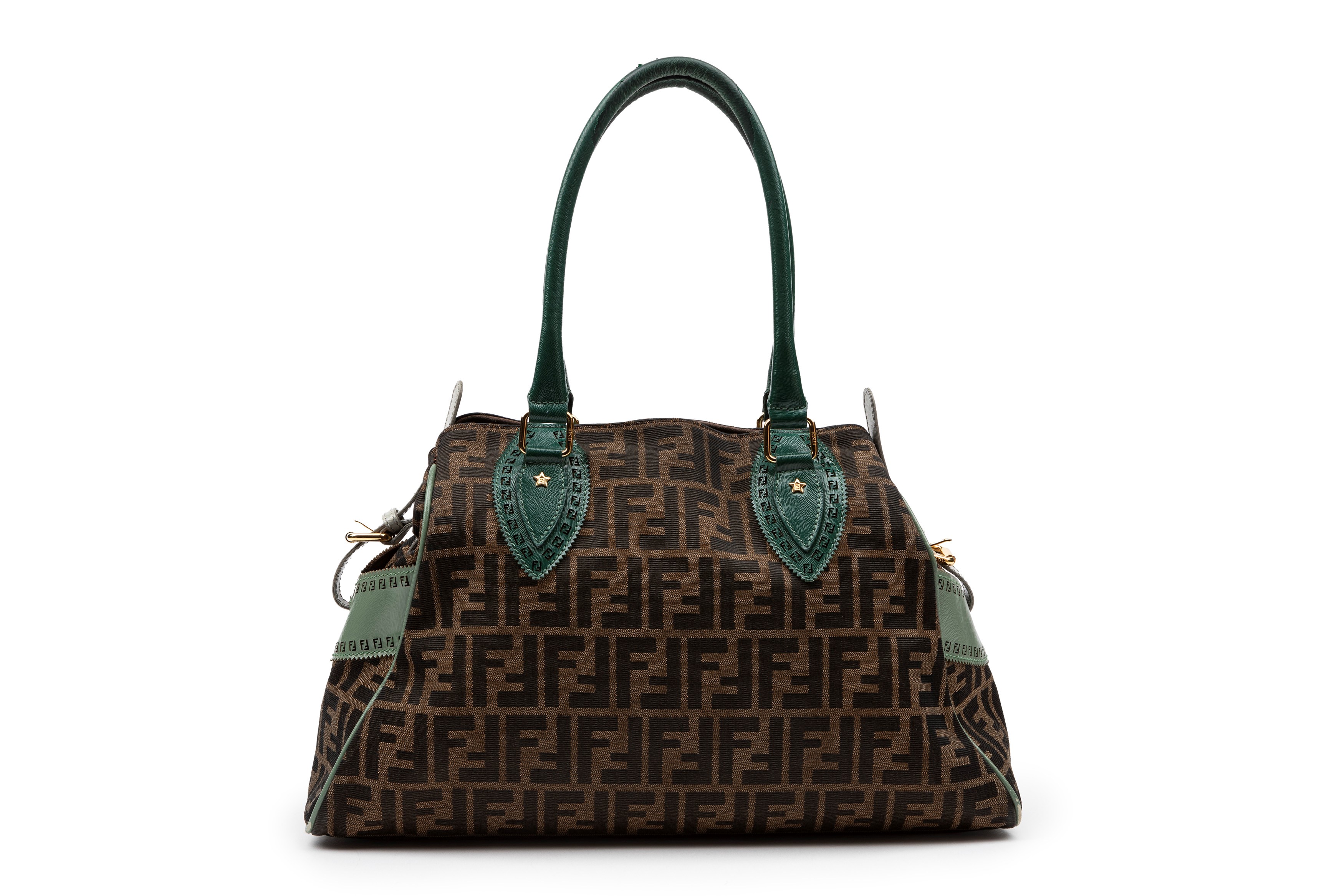 in tela monogrammata, interno in suede e tela, manici e profili in pelle color verde in nuances diverse, borchie sul fronte, dettagli in metallo dorato, cm 40 (difetti)Base d'asta
