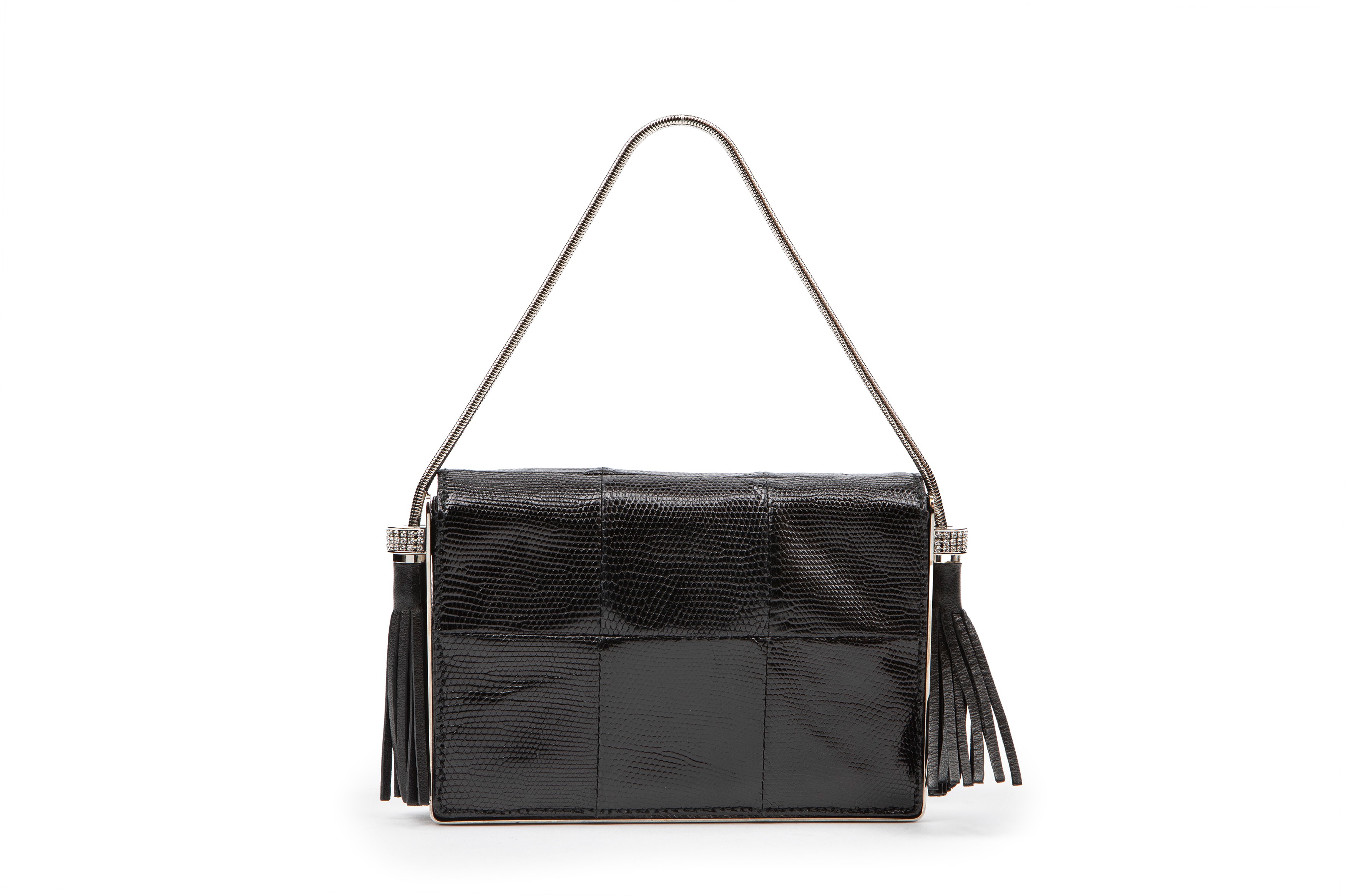 in pelle color nero, dettagli in metallo e strass, nappe laterali pendenti, cm 16,5, con sacchettoBase d'asta