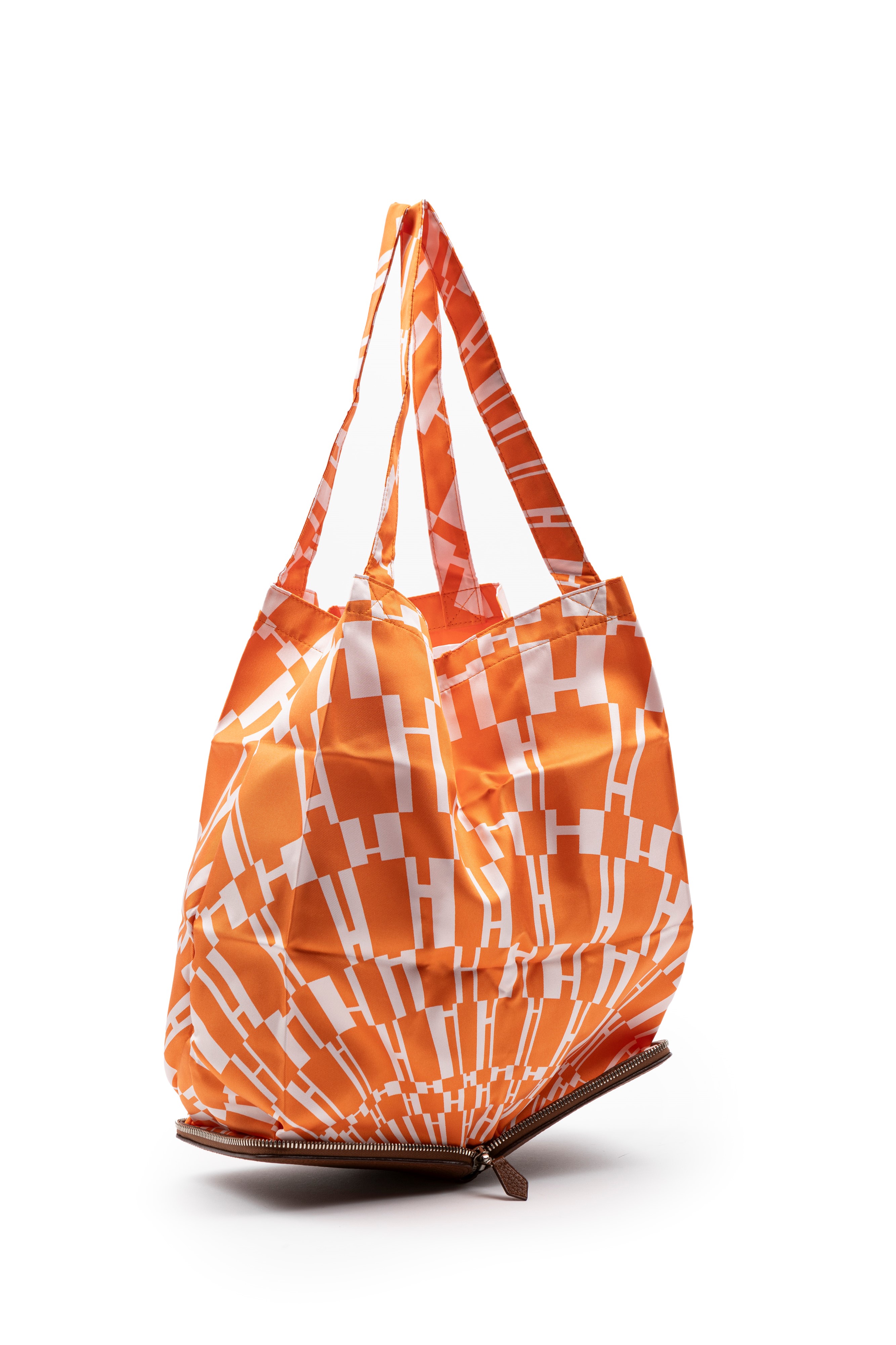 in seta color bianco e arancio, astuccio in pelle color marrone, borsa cm 26 x 32, astuccio cm 14 x 13, con sacchettoBase d'asta
