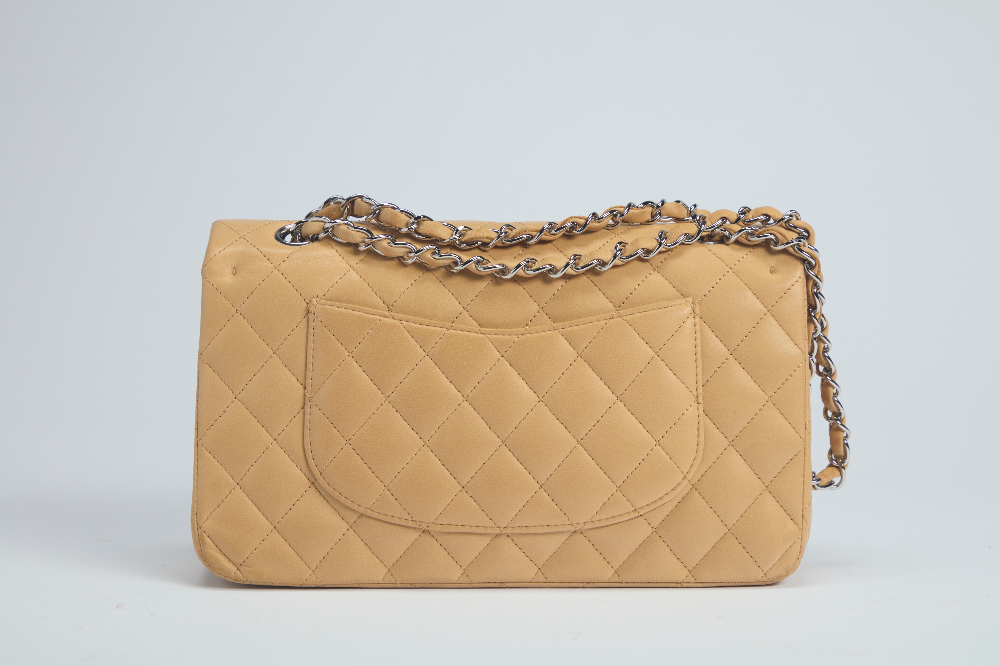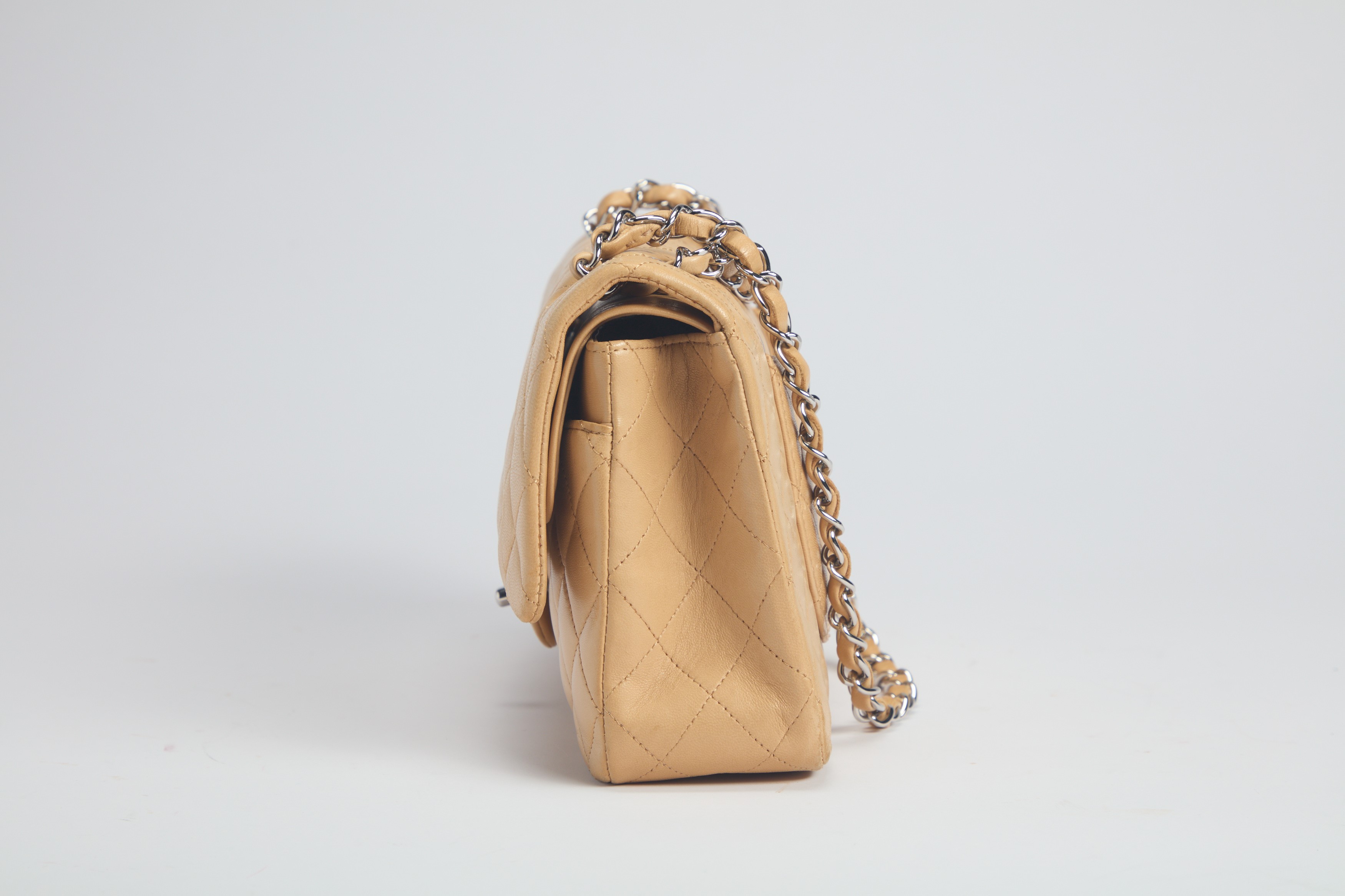 in pelle matelassé color caffelatte con tracolla a catena, dettagli in metallo, con sacchetto (lievi difetti)