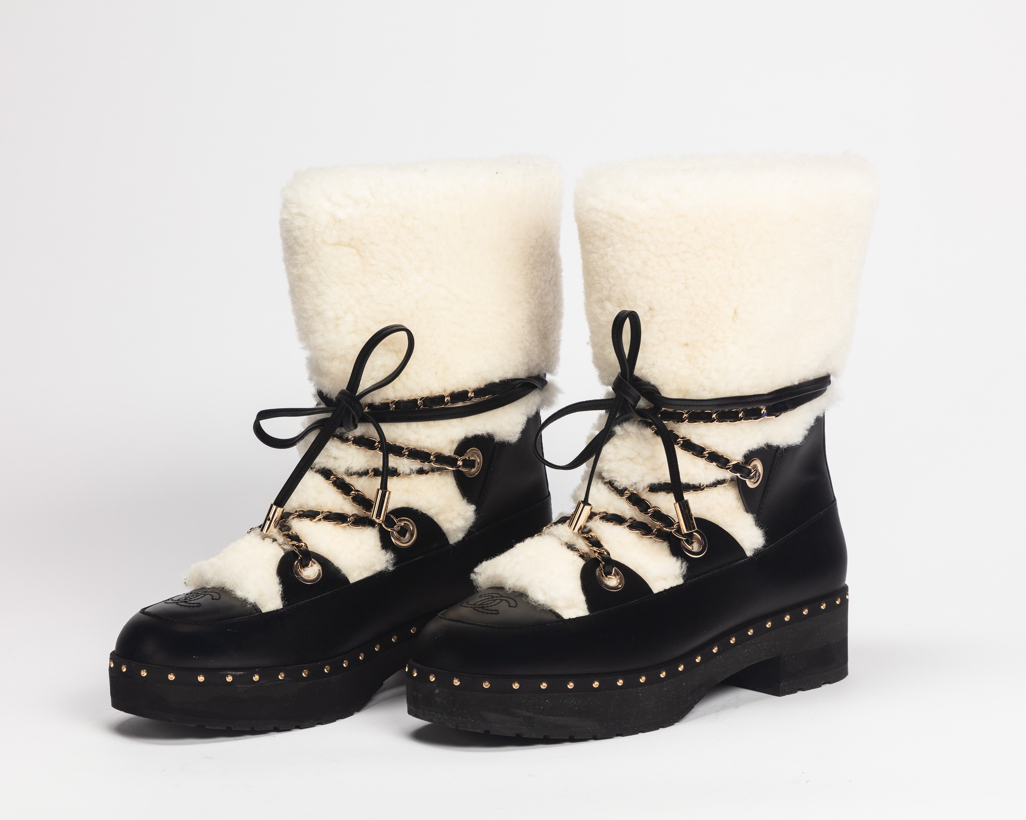 in montone e pelle color nero, dettagli a catena in metallo dorato, misura 39, con sacchetto e scatola (nuovi e mai usati)Base d'asta