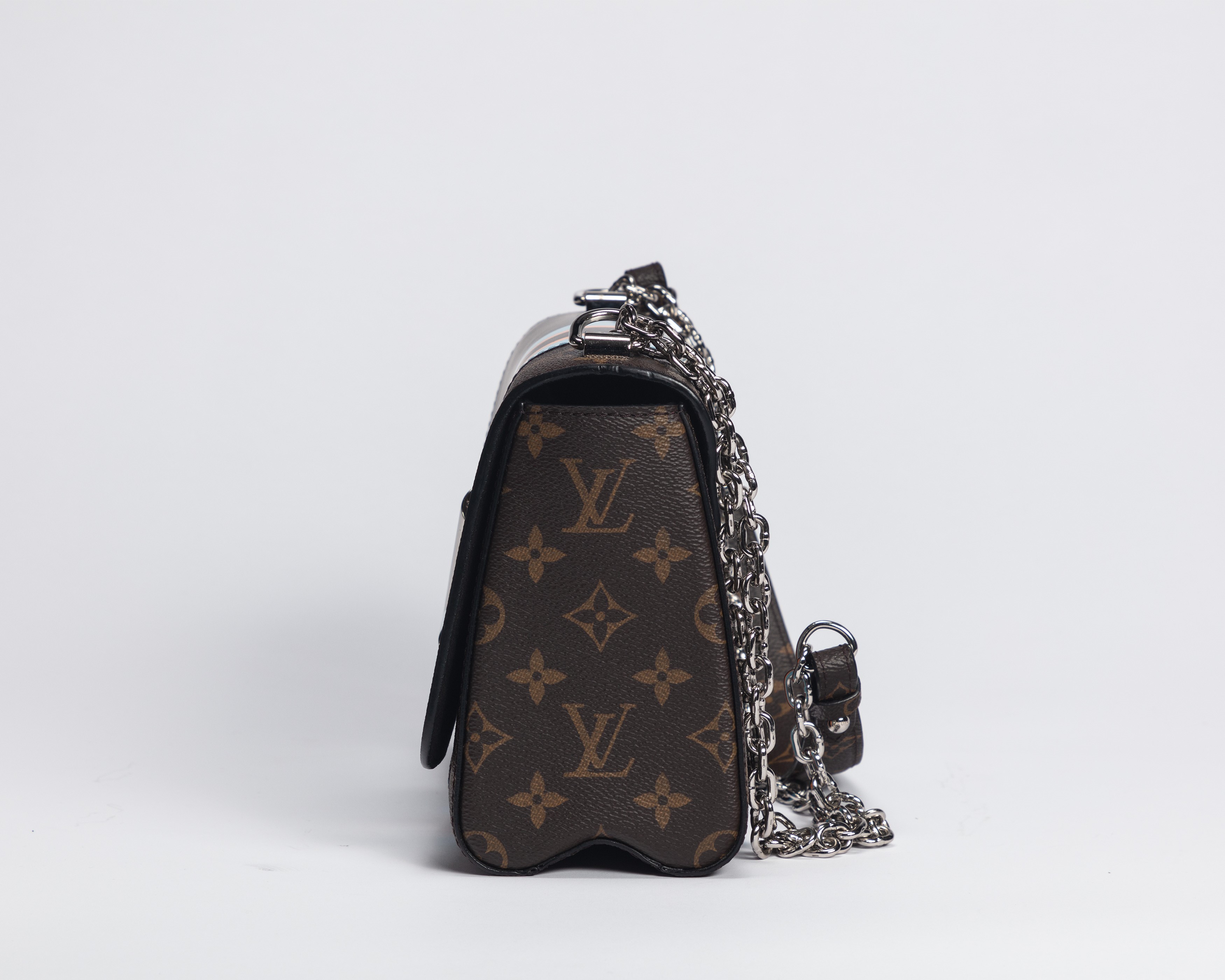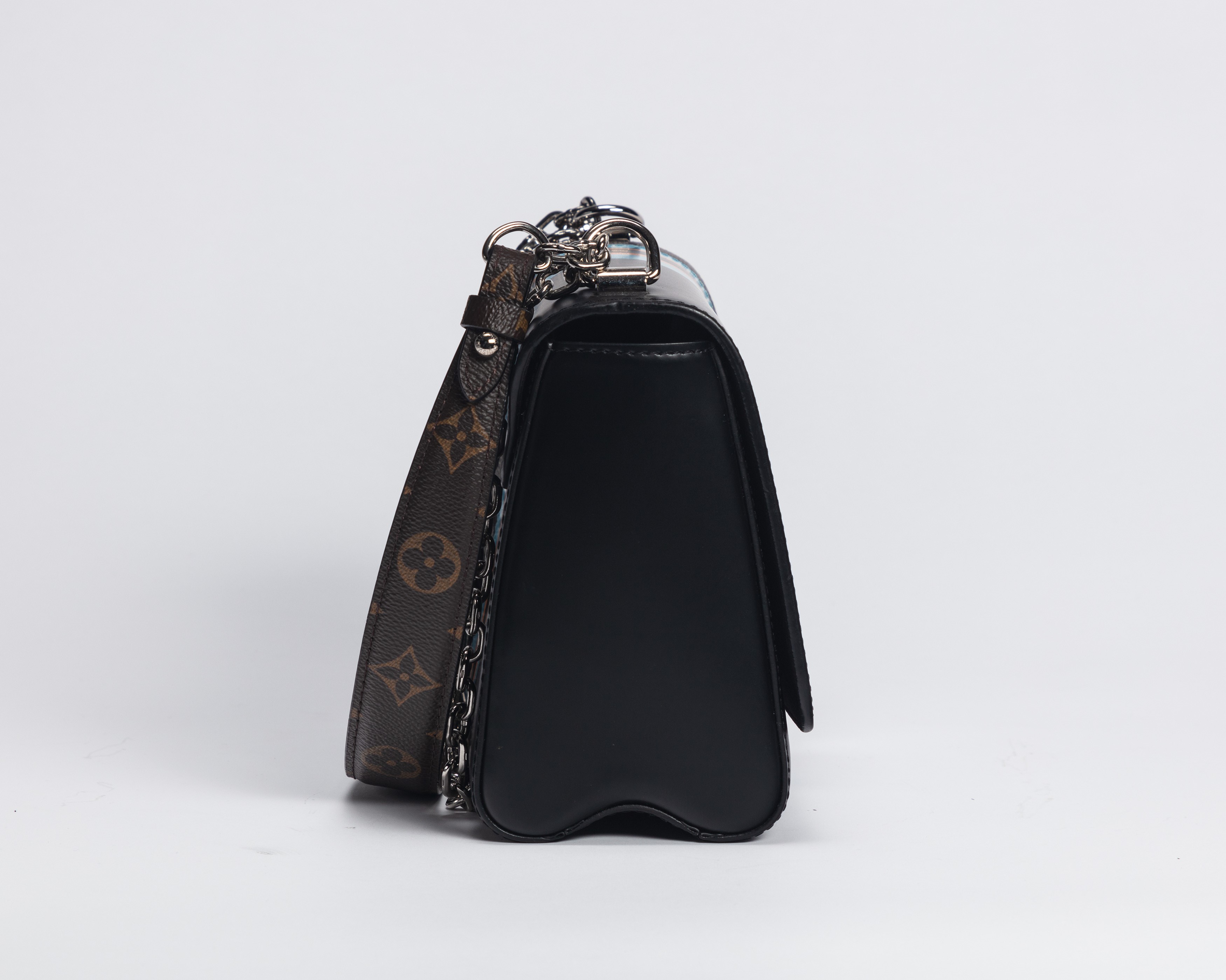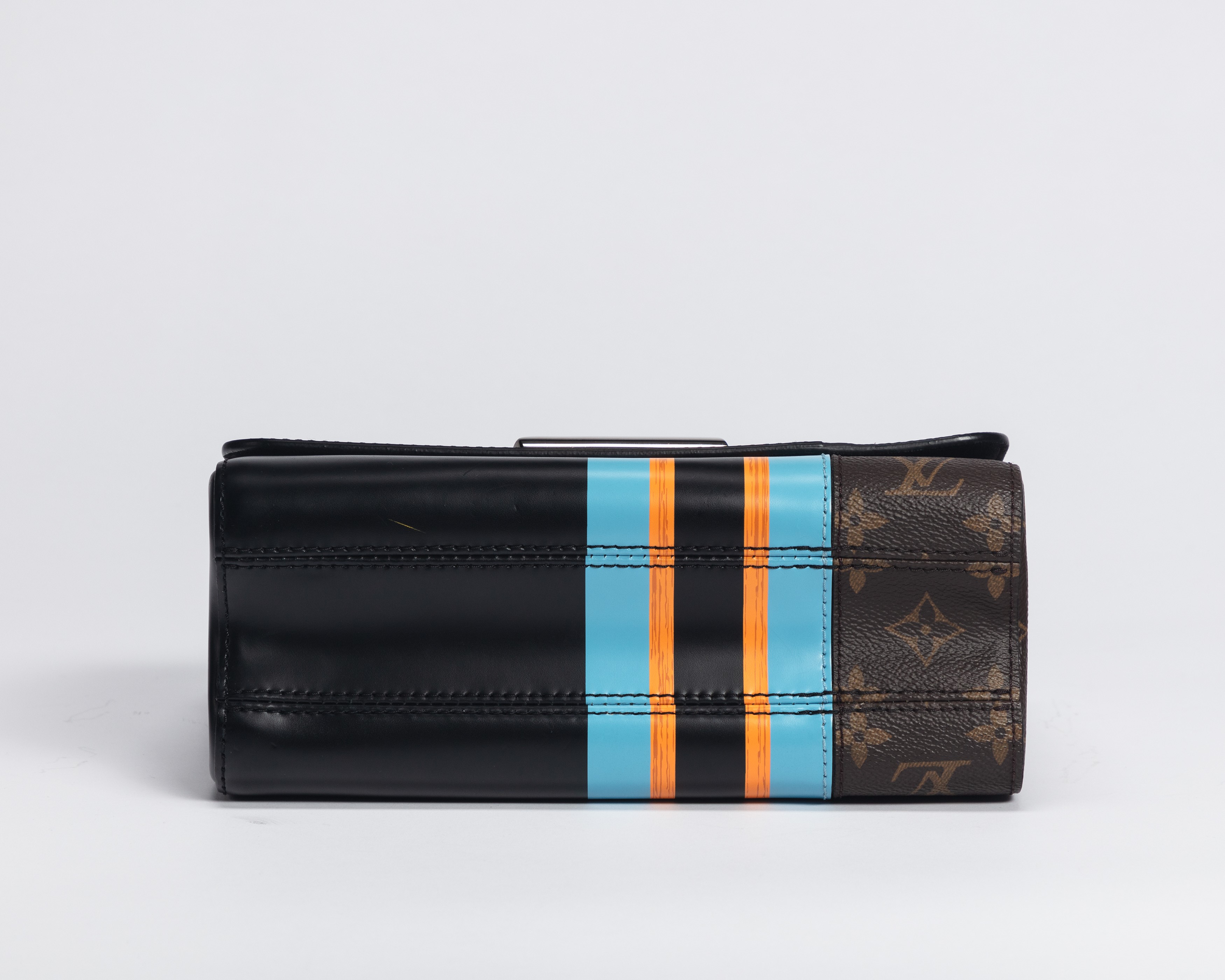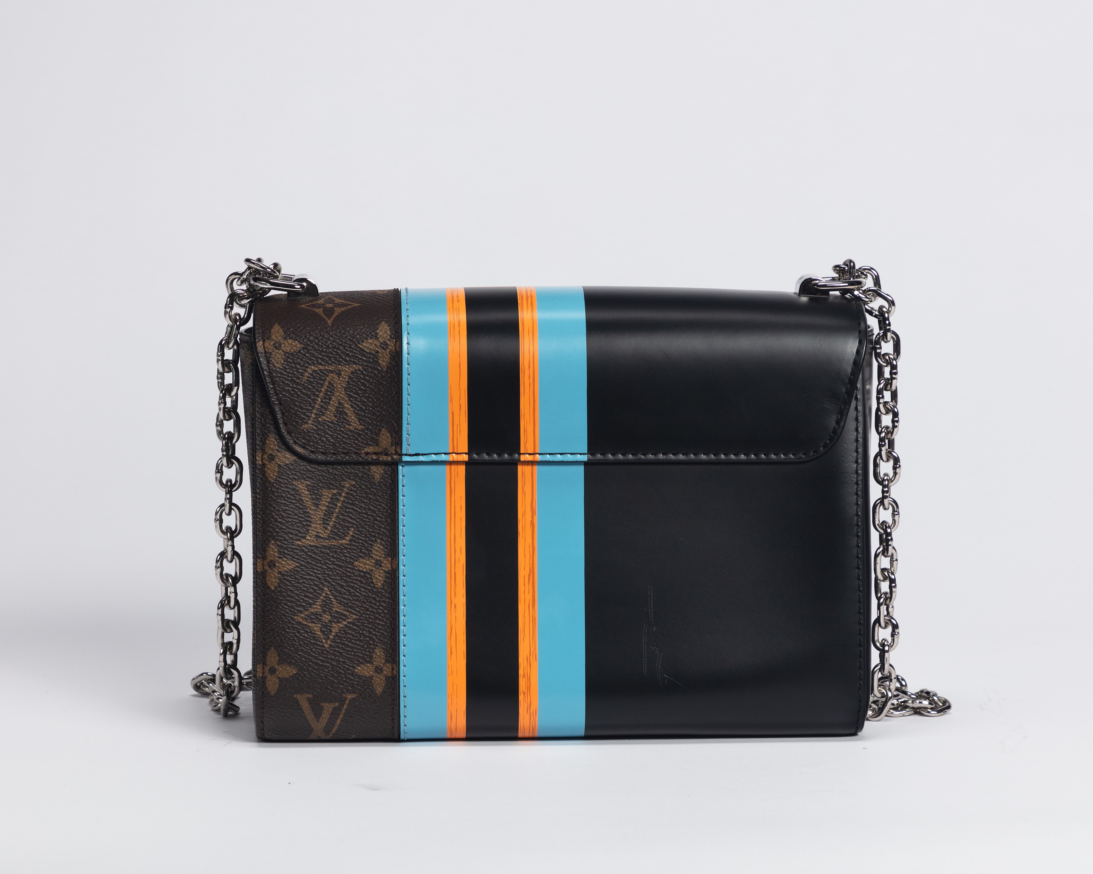 in pelle color nero e tela monogram, banda tricolore, tracolla a catena in metallo, cm 23