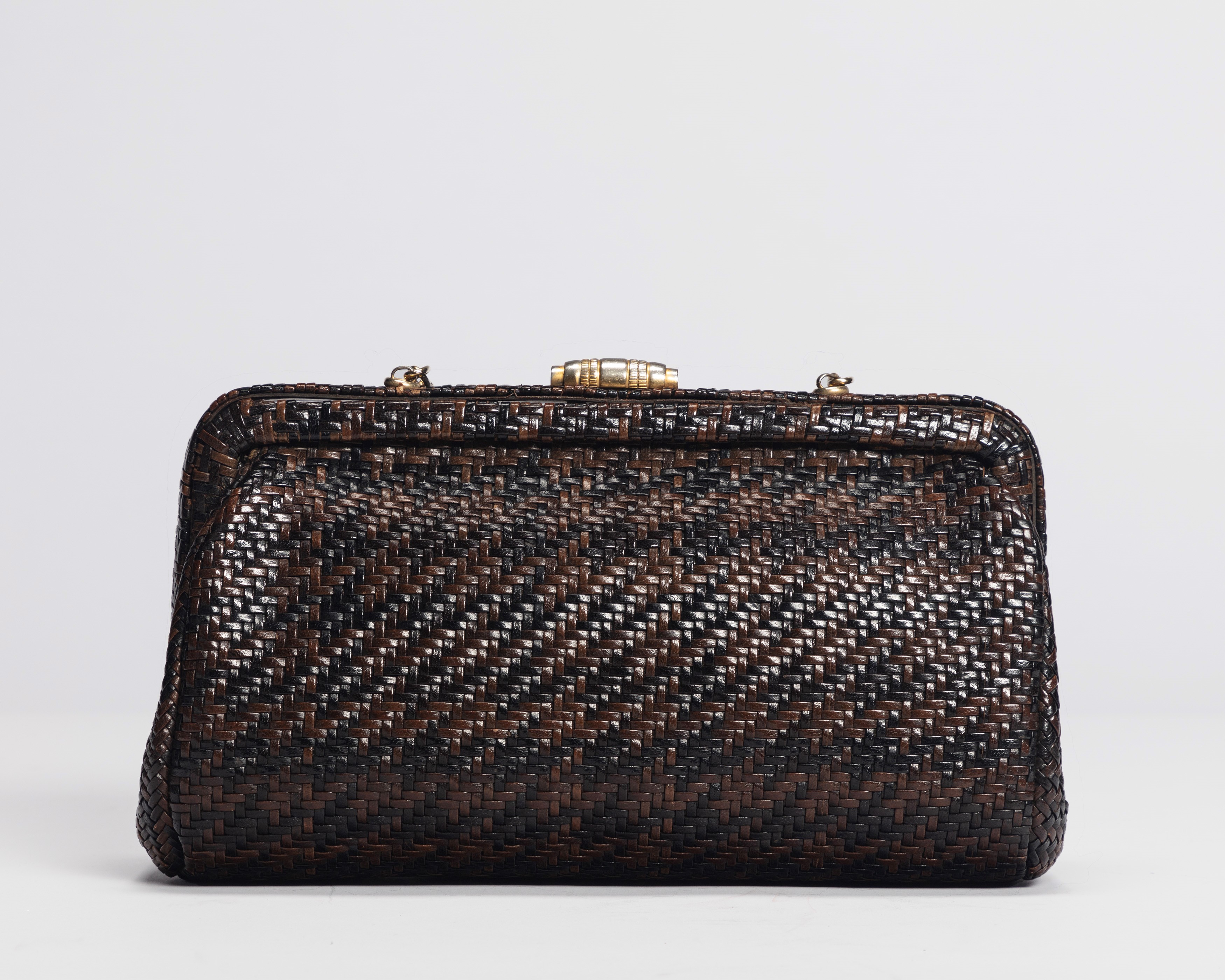 Pelle intrecciata color marrone e nero, tracolla a catena in metallo dorato, cm 26 (lievi difetti)Base d'asta