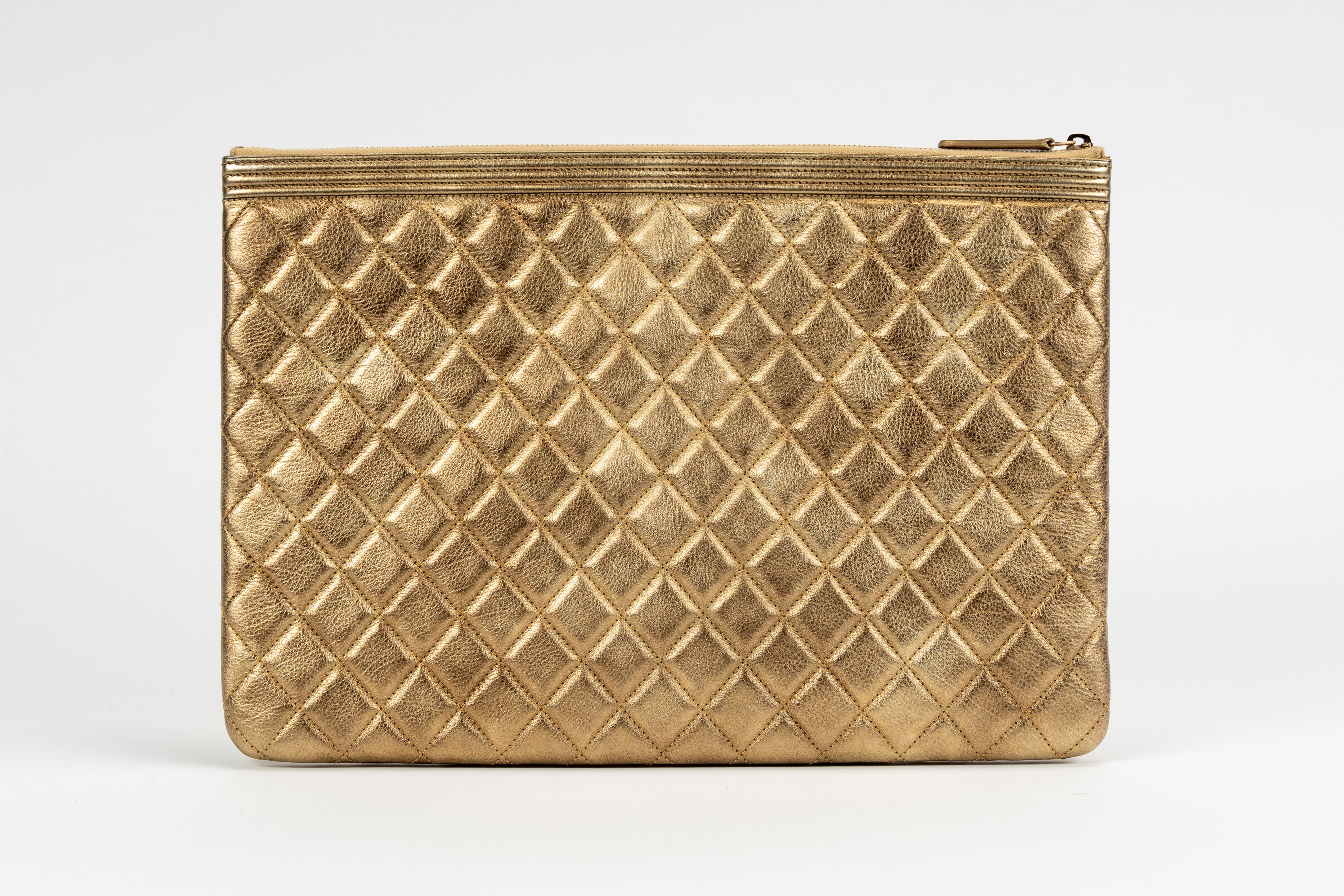 in pelle matelassé color oro, chiusura a cerniera, dettagli in metallo dorato, interno in tessuto impermeabile, cm 34 x 24, con sacchetto