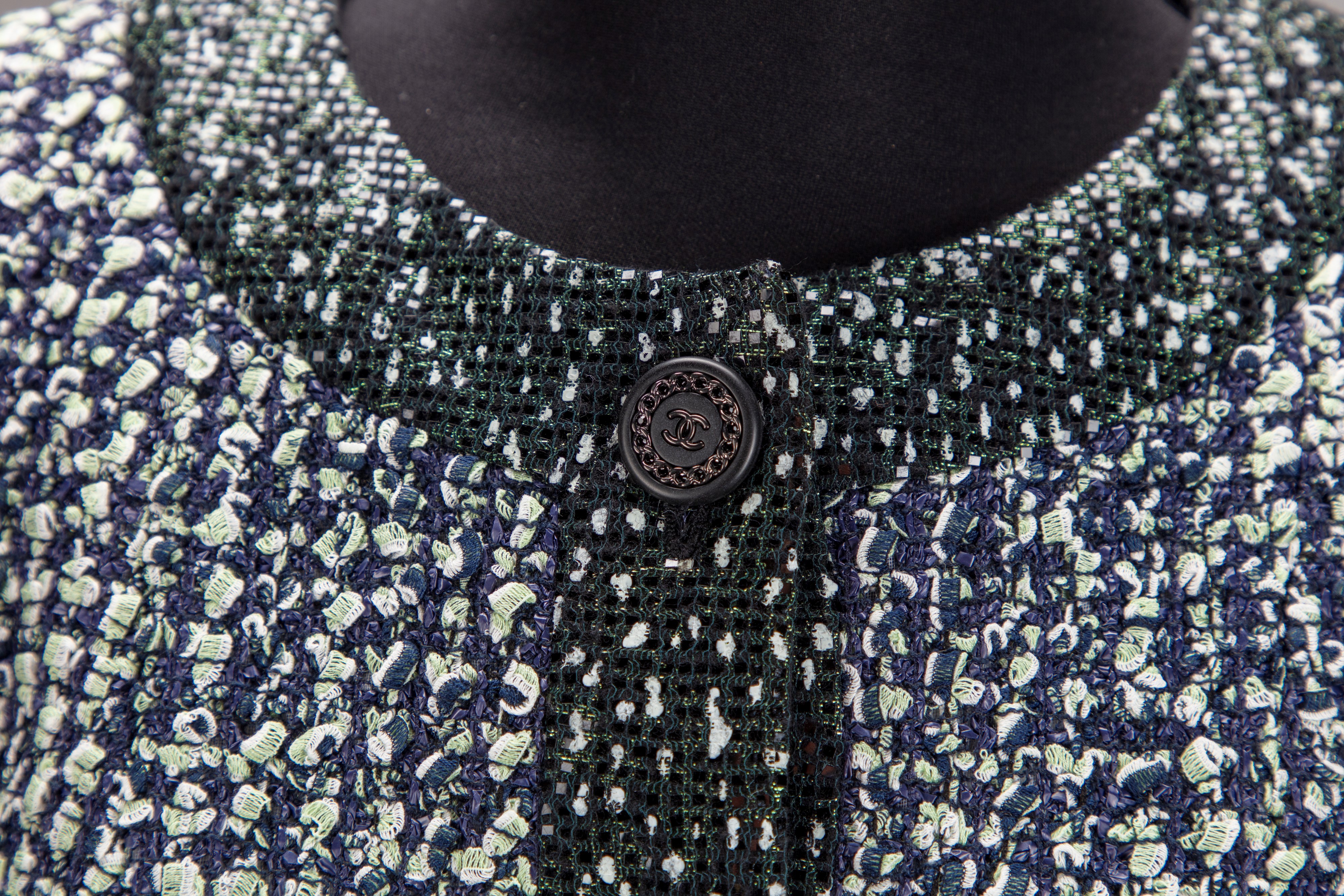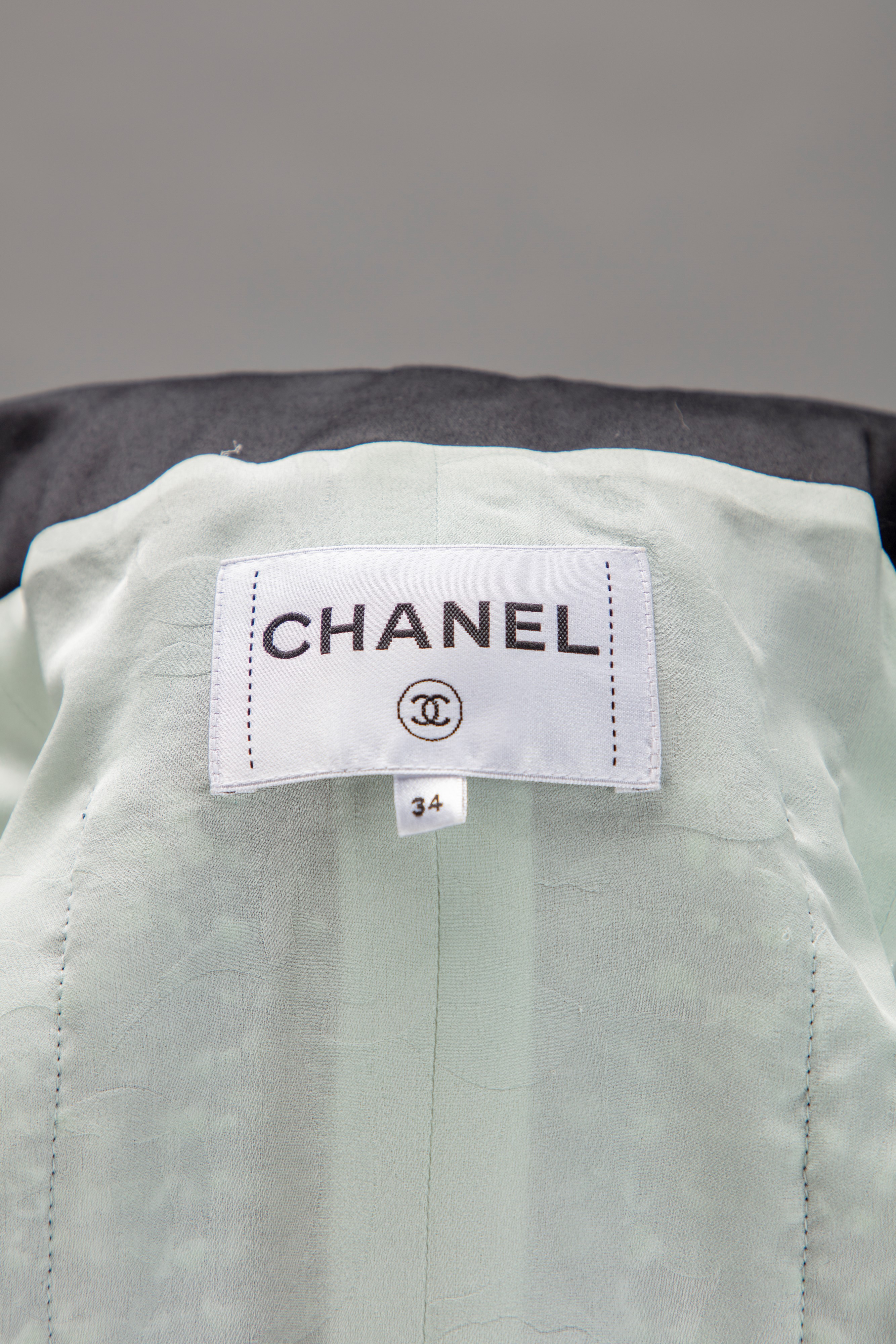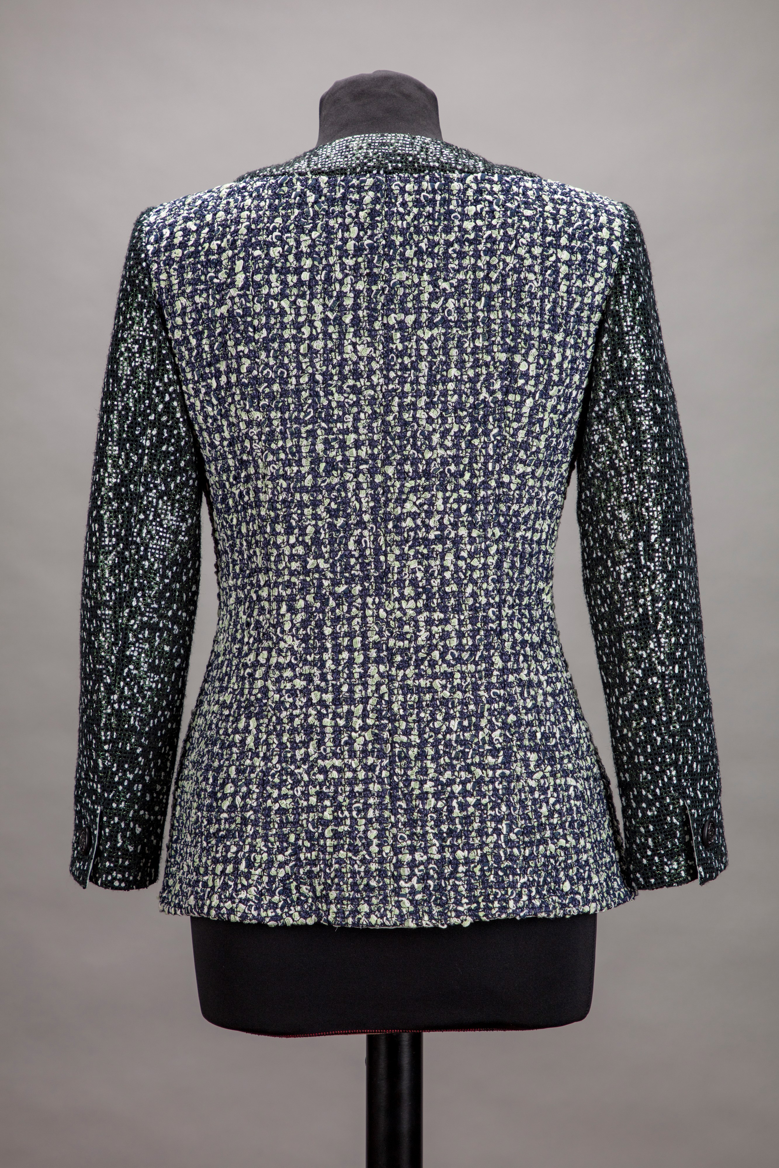 in cotone bianco e nero, maniche e profili con micropaillettes, fodera in seta, bottoni logati, taglia 34 francese, con custodiaBase d'asta