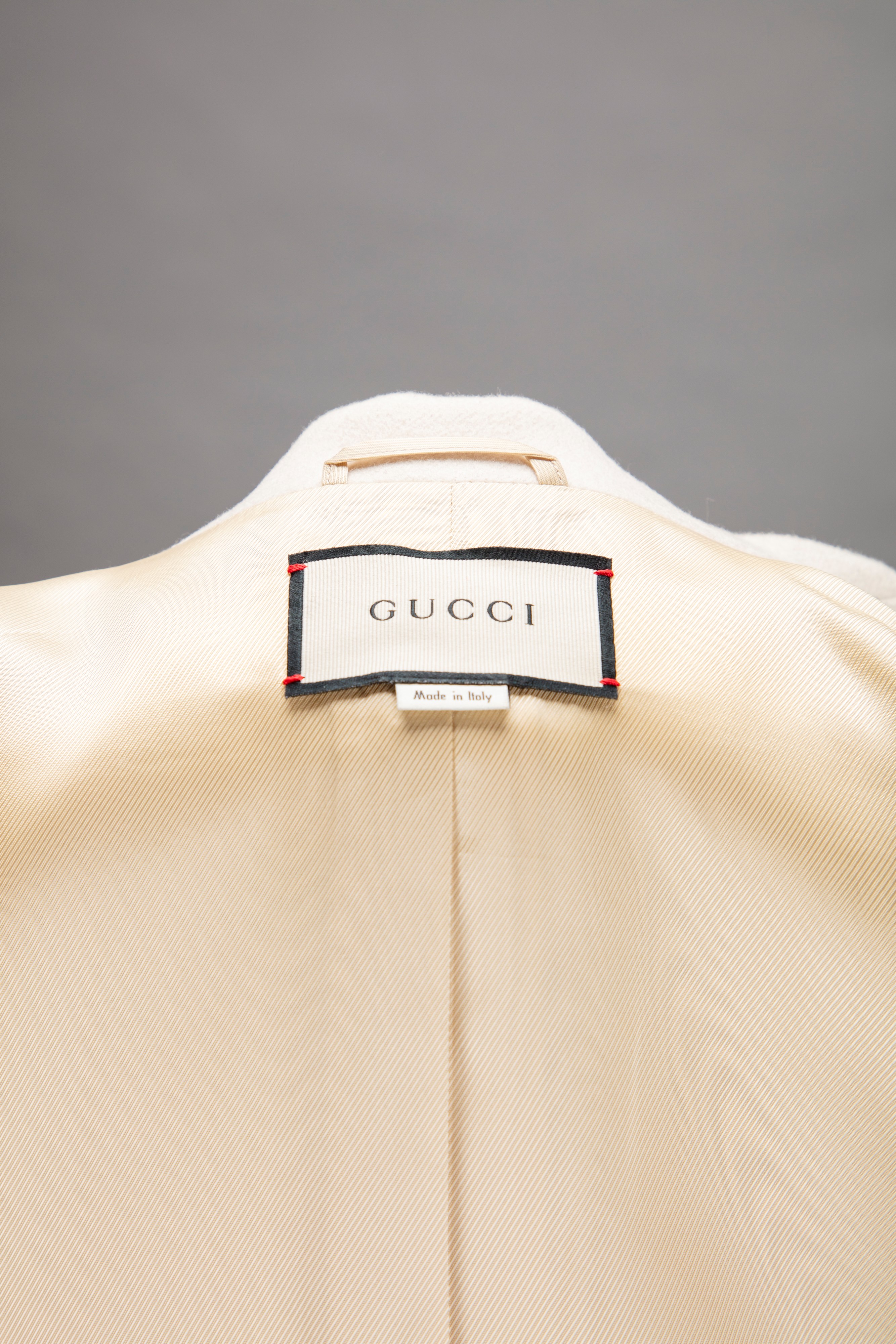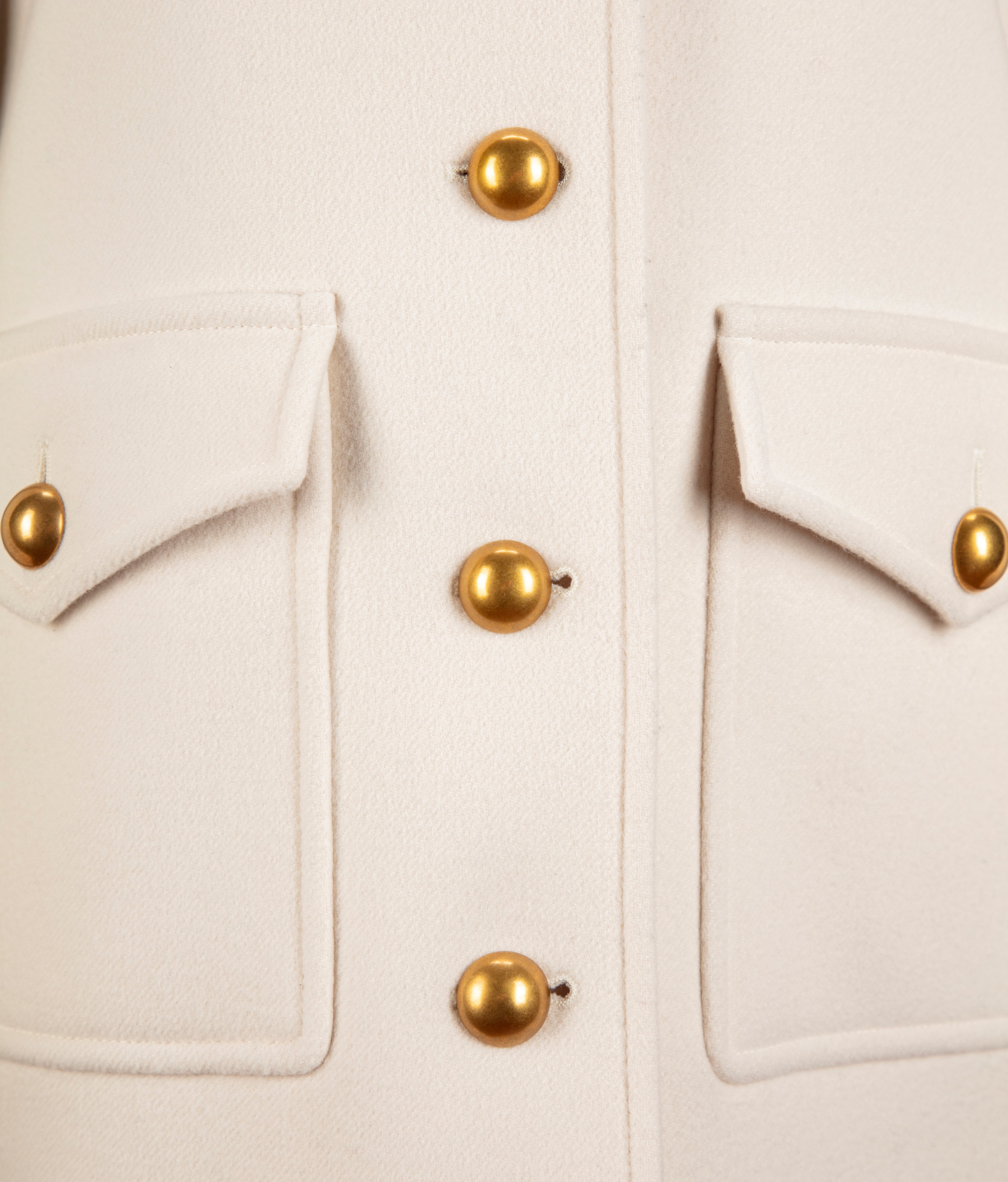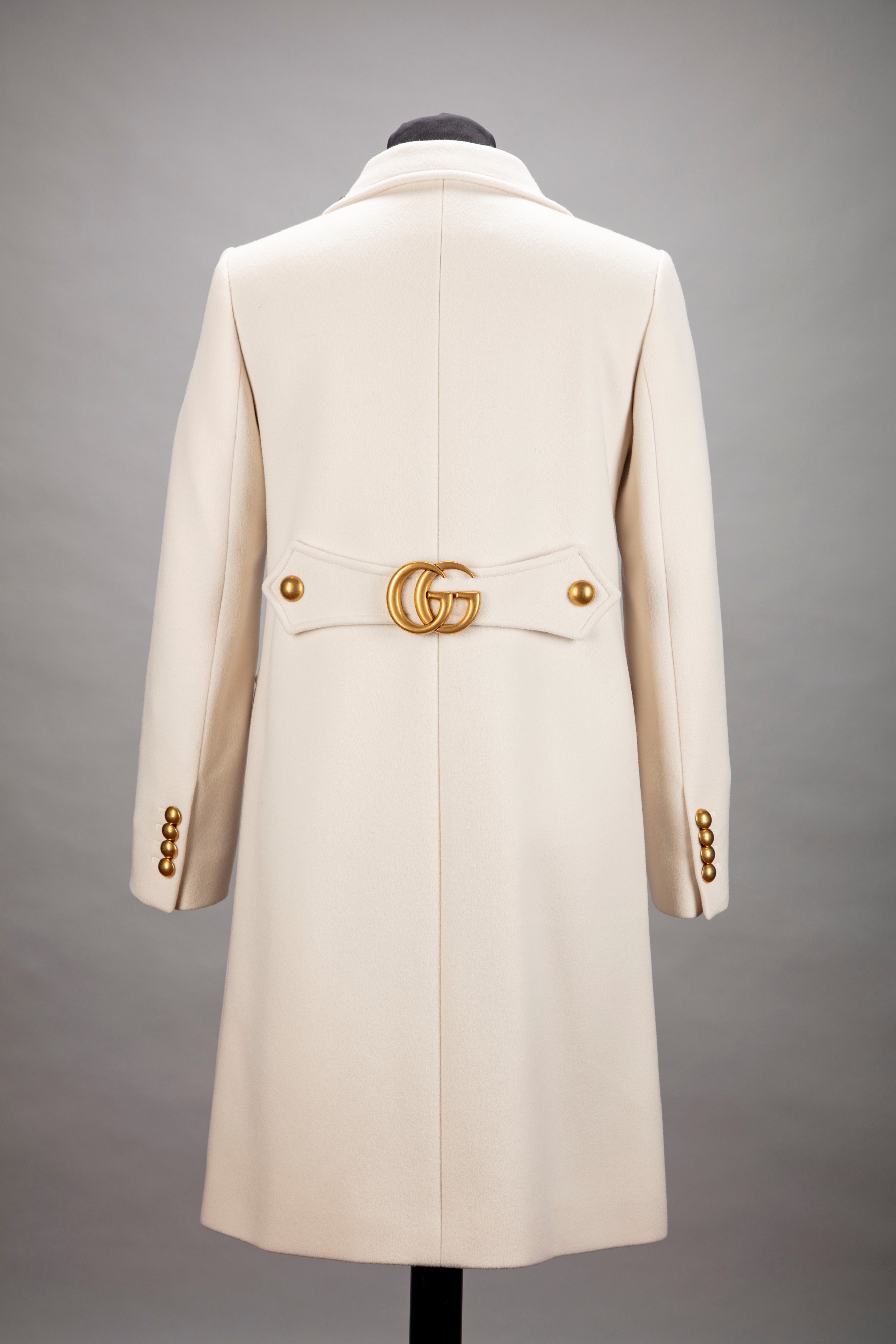 in lana color panna, bottoni bombati in metallo brunito, martingala con fibbia logata, con custodia, taglia 36Base d'asta