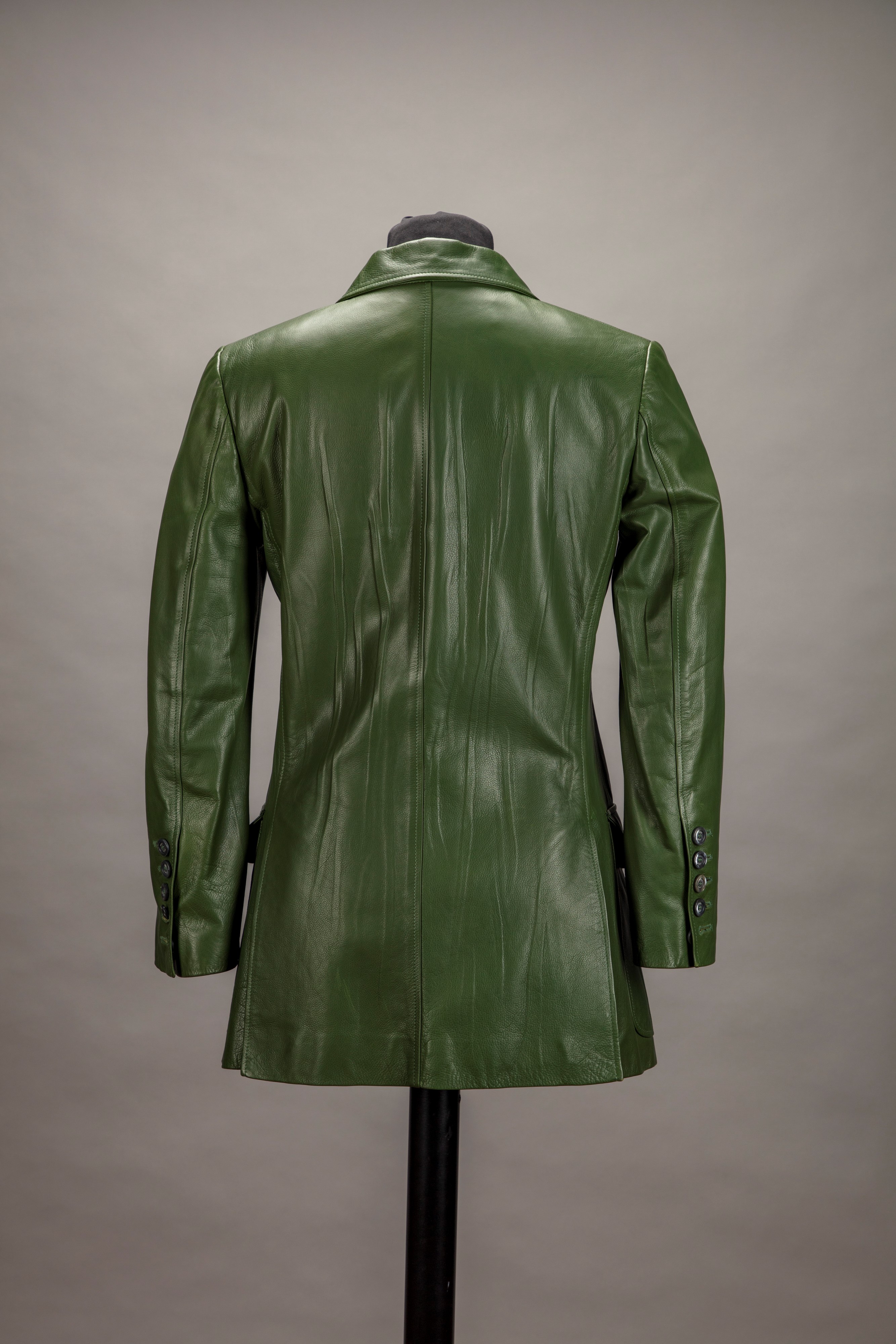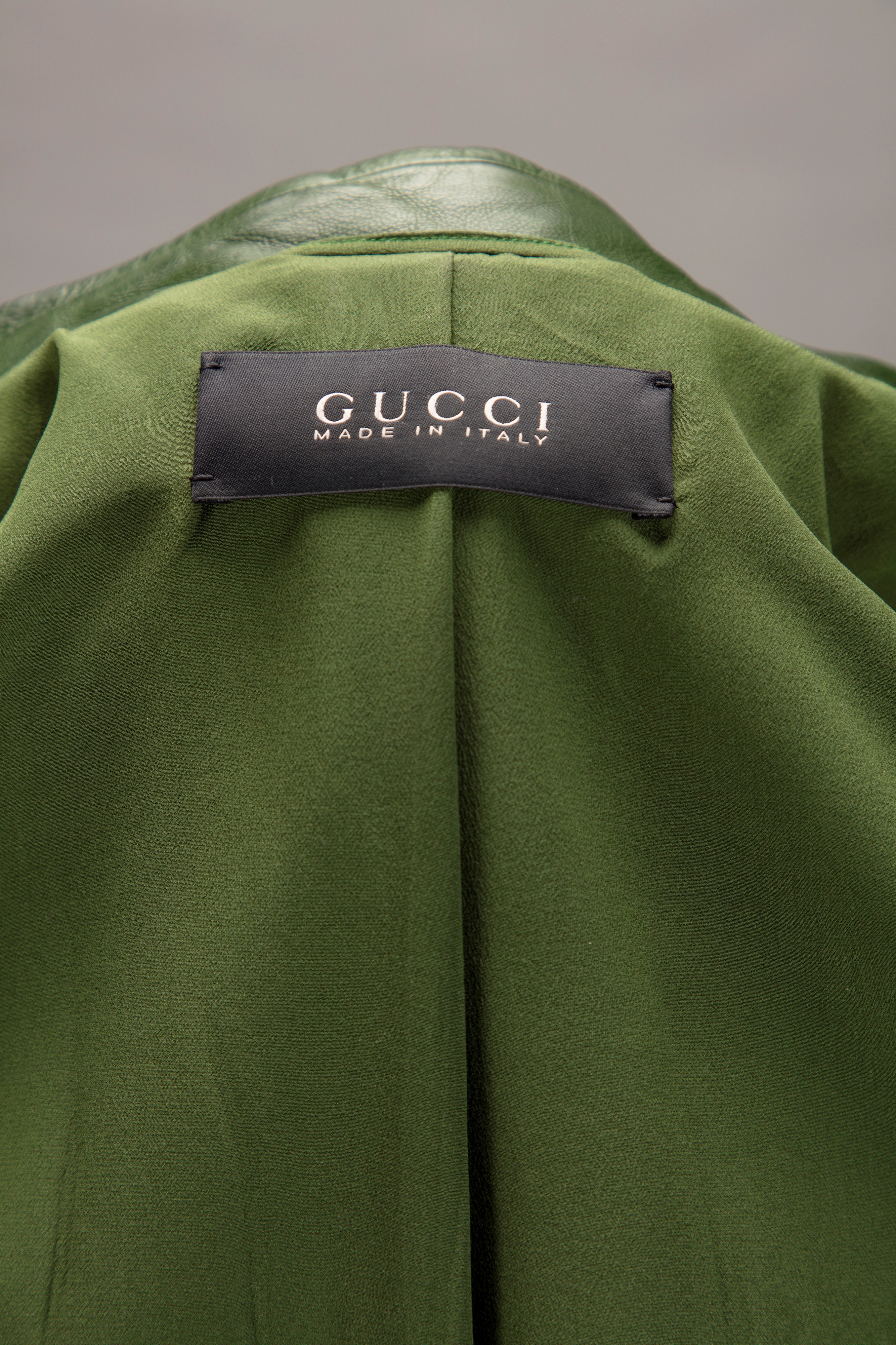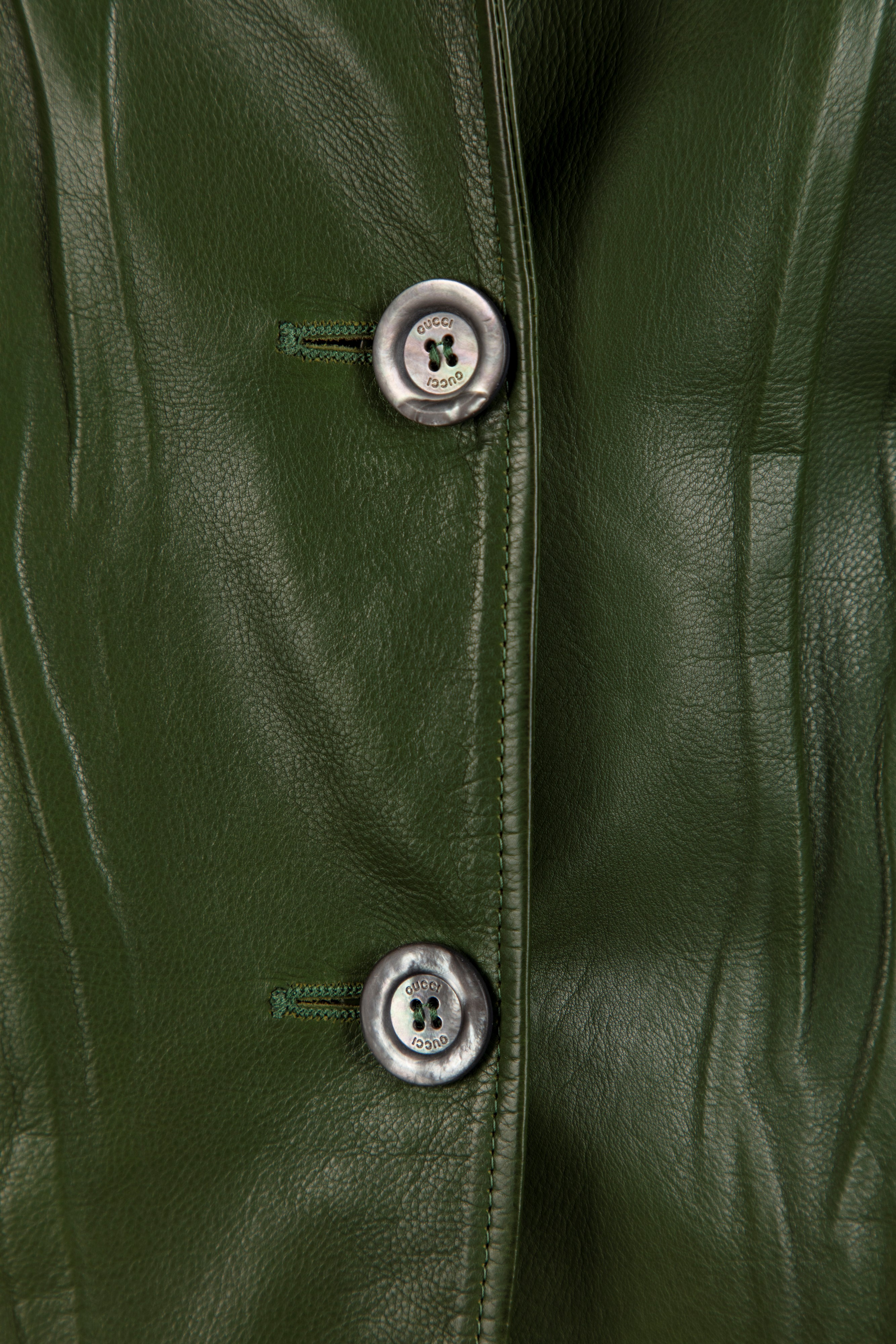 in pelle stropicciata color verde salvia, bottoni in madreperla logati, fodera in seta, taglia 36 italiana, con custodia (lievissimi difetti)