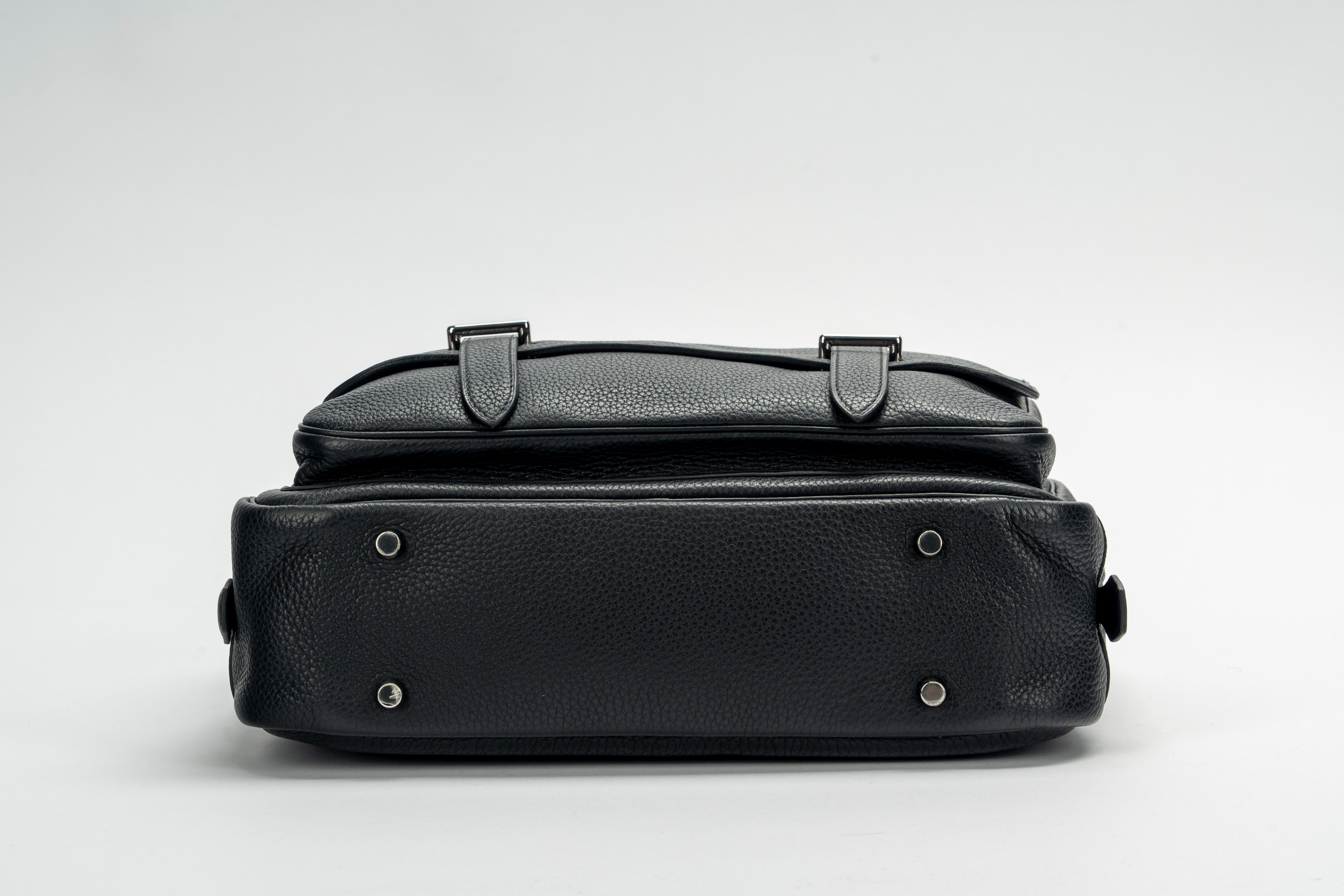 in pelle taurillon clémence color nero, doppi manici, interno in tessuto, dettagli in palladio, con tracolla staccabile, cm 35