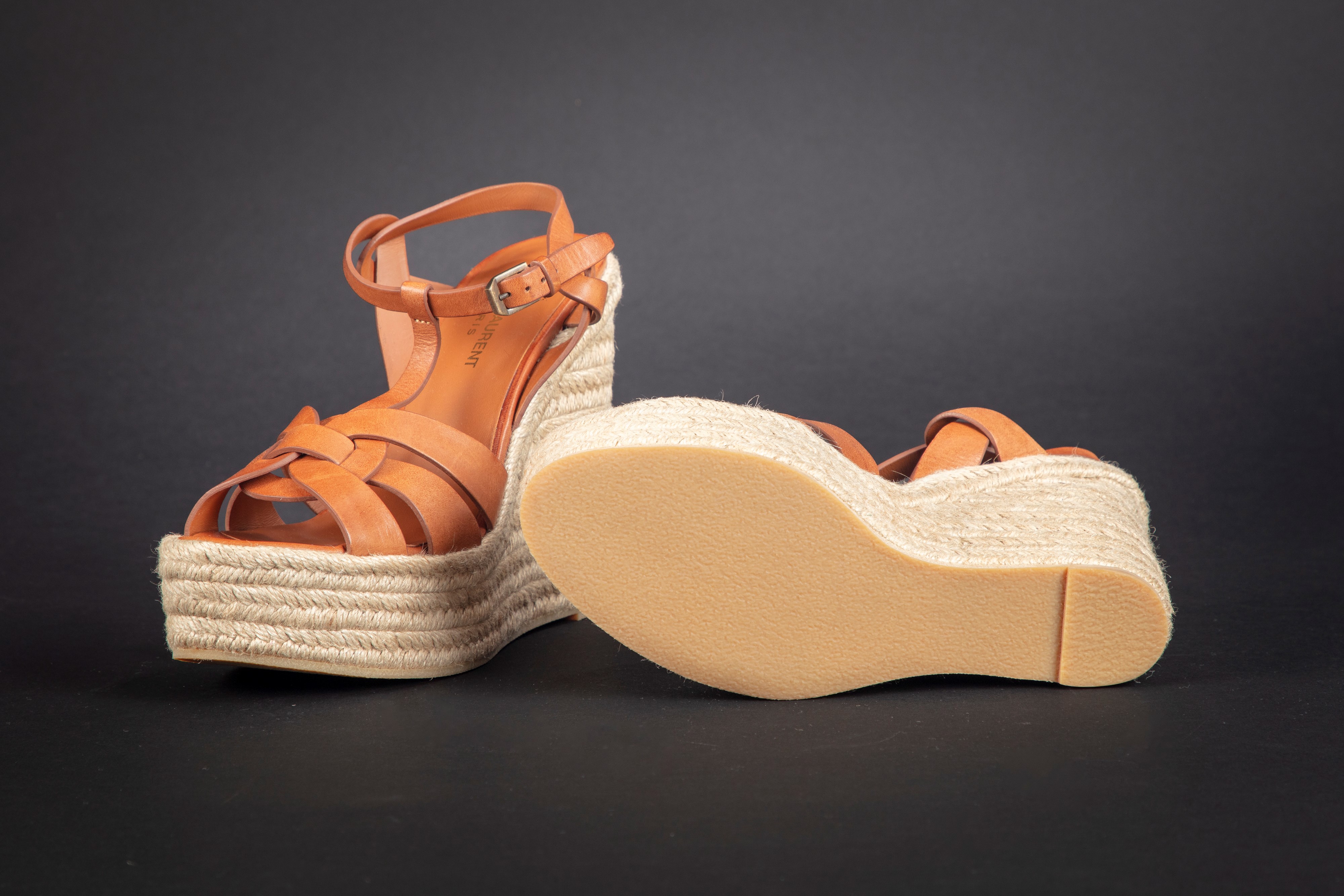 in cuoio e corda, misura 39,5, tacco cm 14, con sacchetto (nuovi e mai usati)Base d'asta