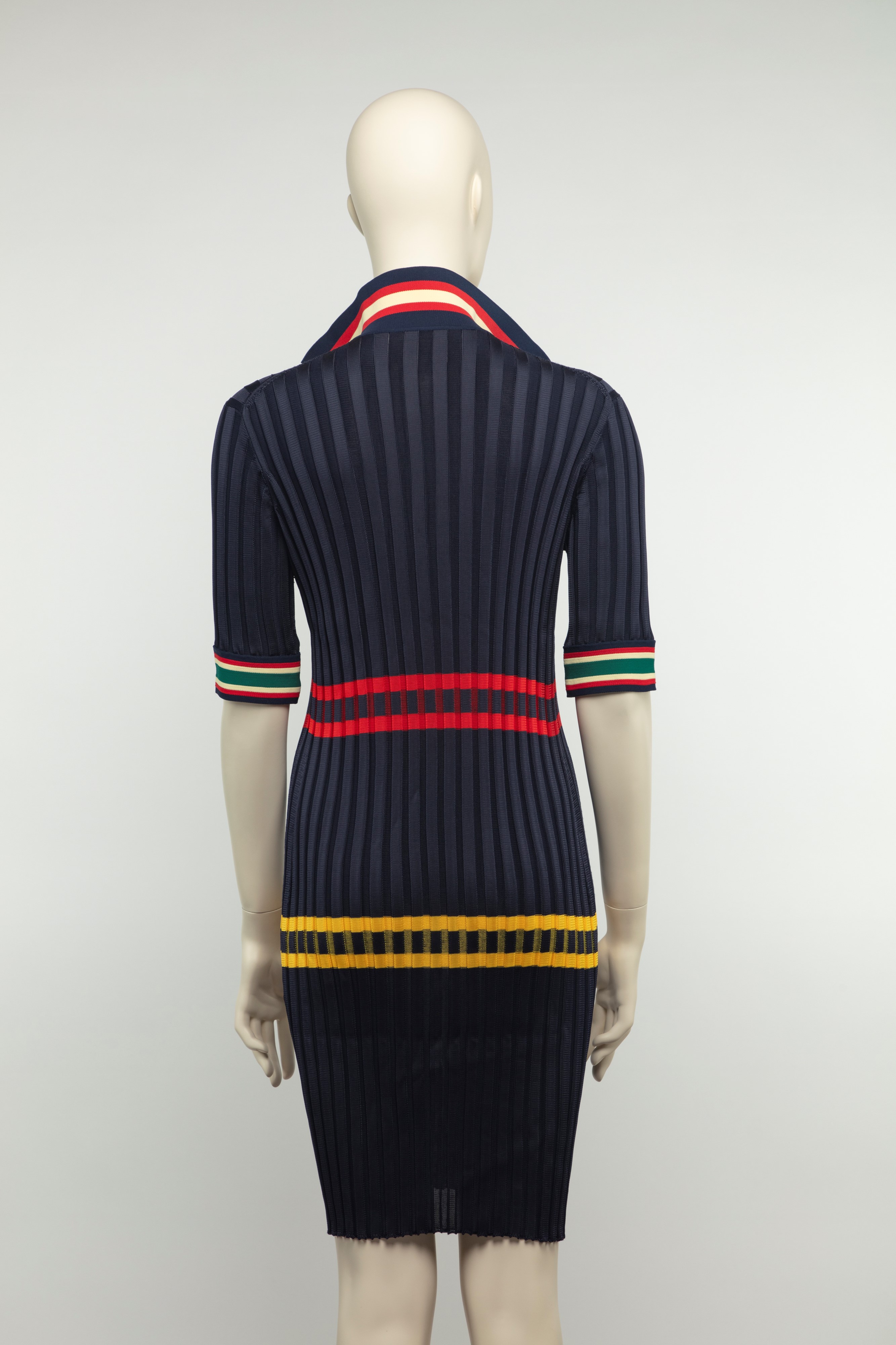 a manica corta in maglina di seta e cotone a costine color blu, inserti a bande in colori diversi, chiusura a zip, taglia S