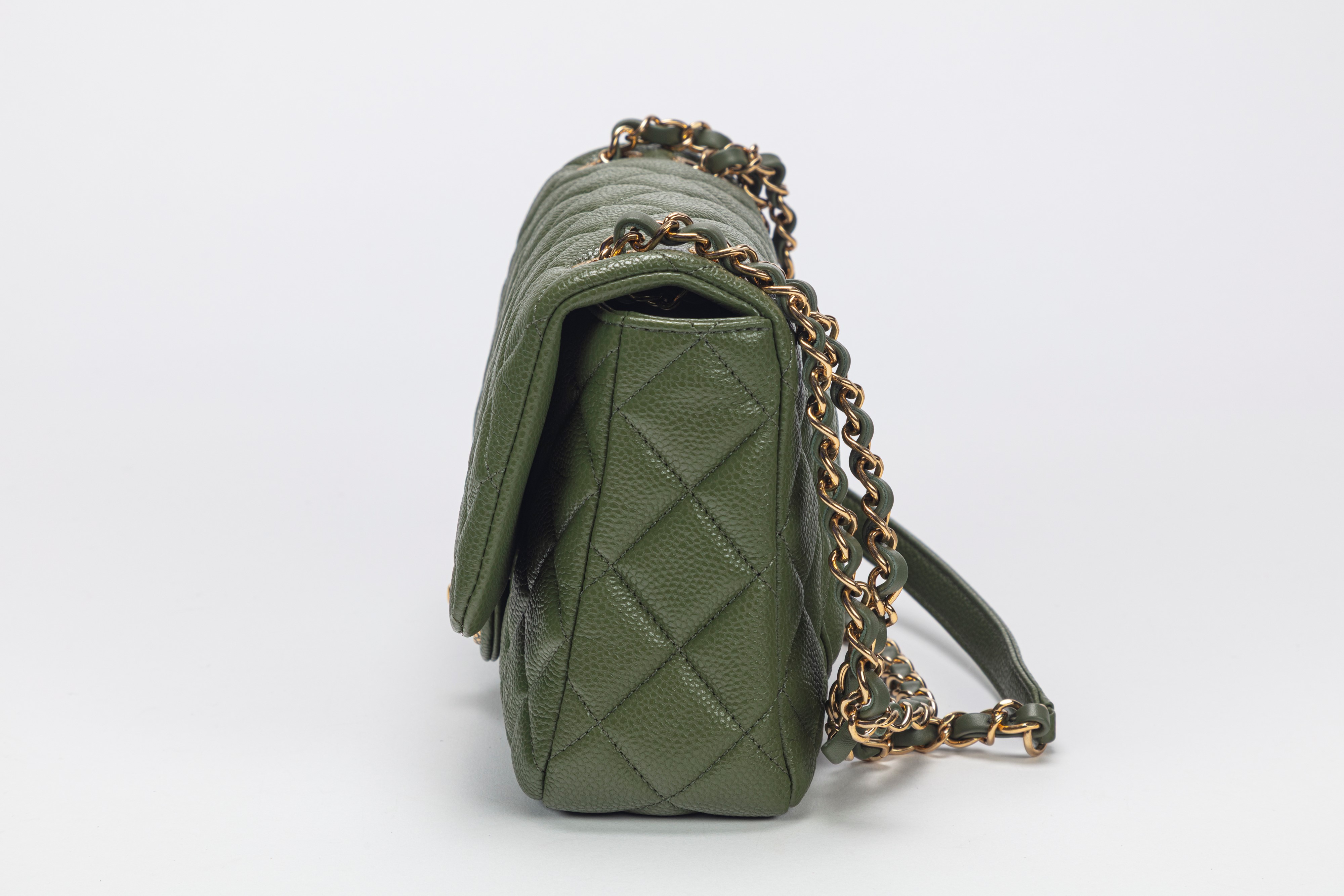 in pelle caviar matelassé color verde salvia, tracolla a catena, dettagli in metallo dorato e smalto, cm 24, con sacchetto