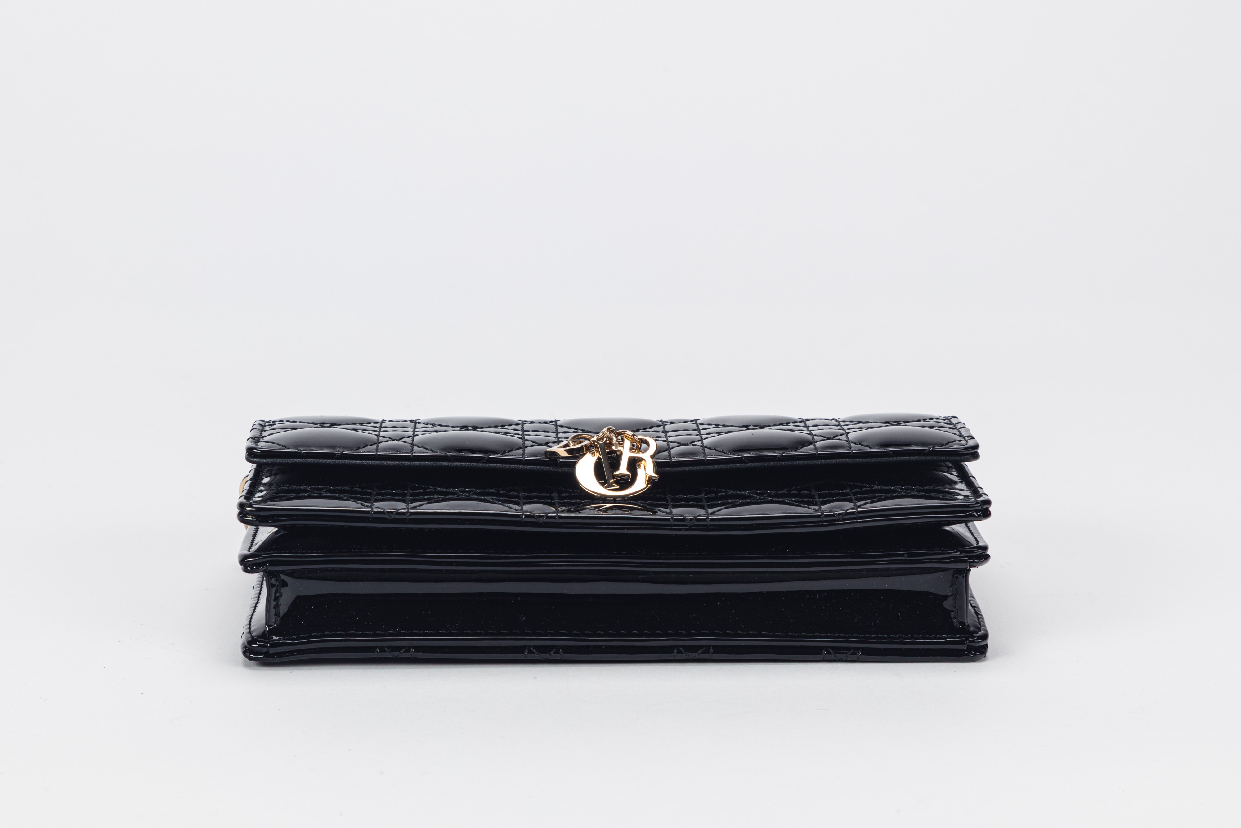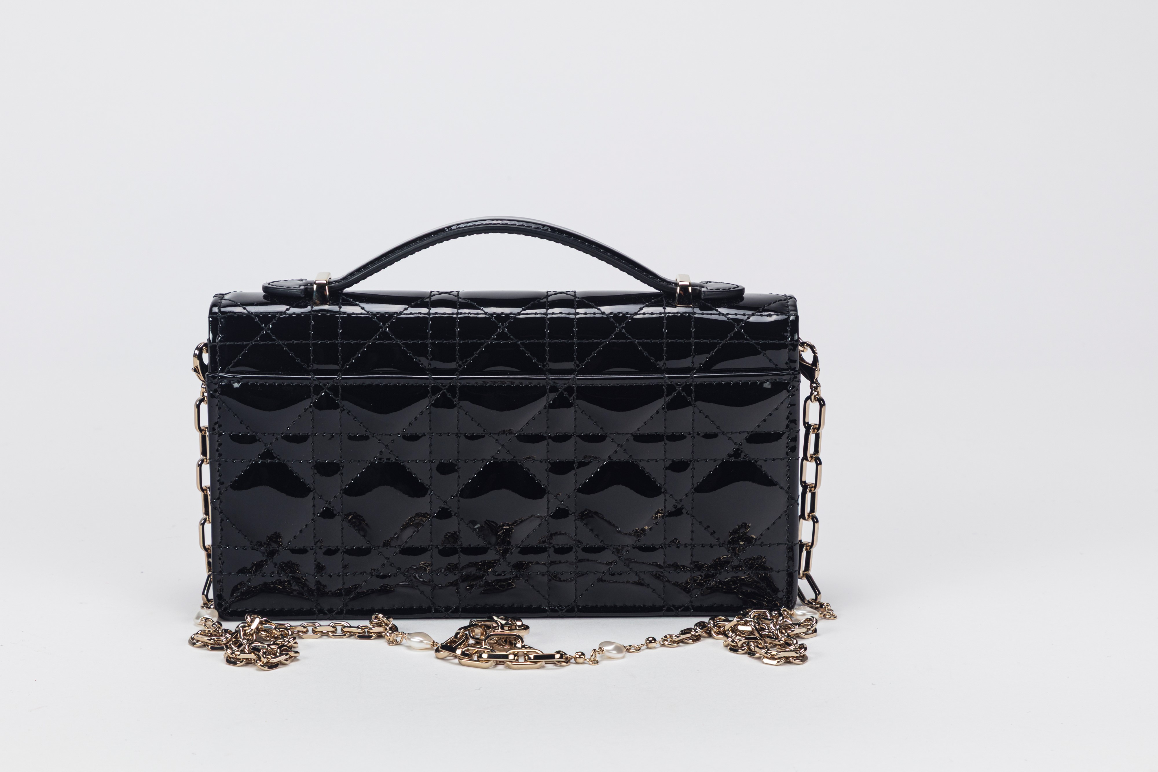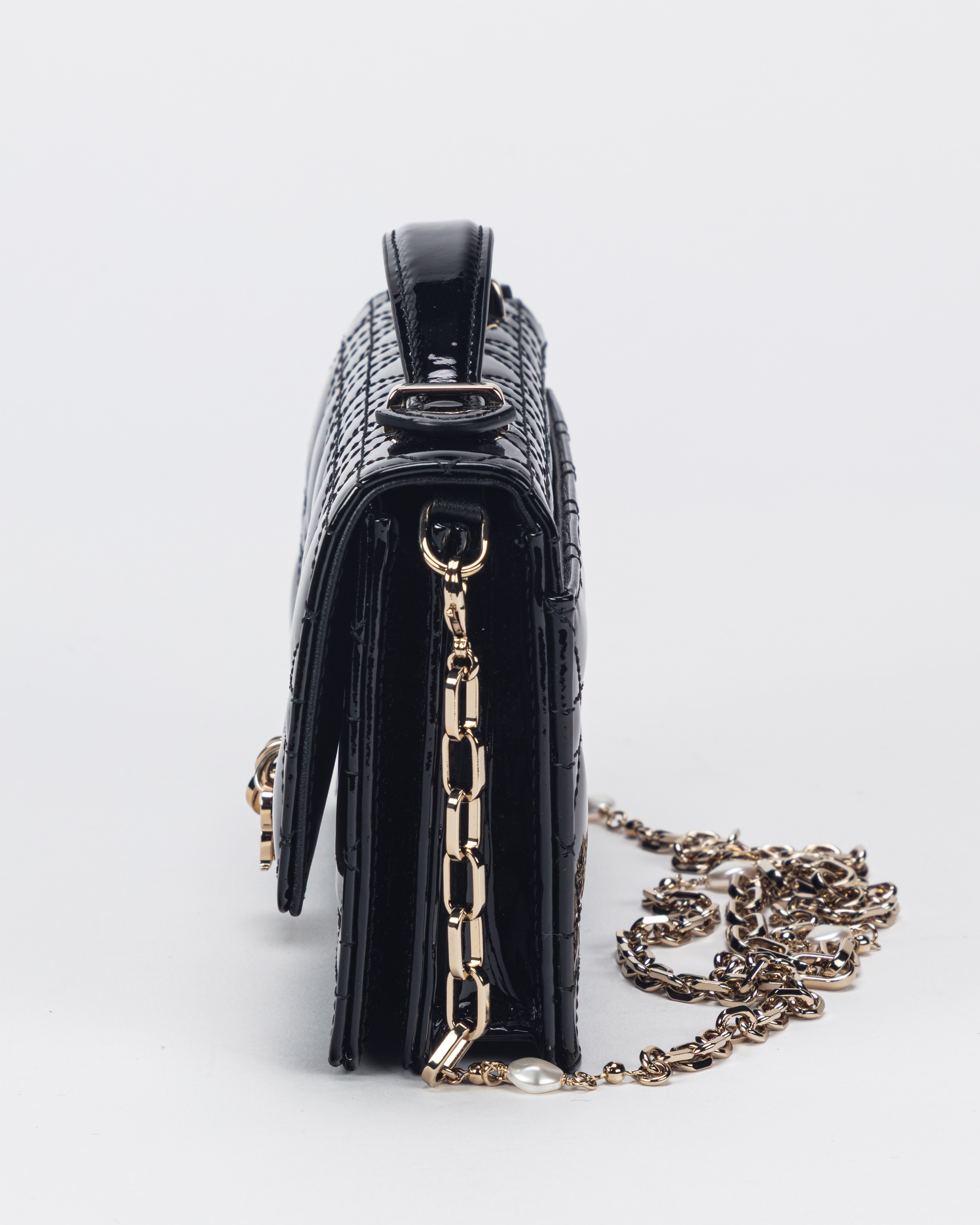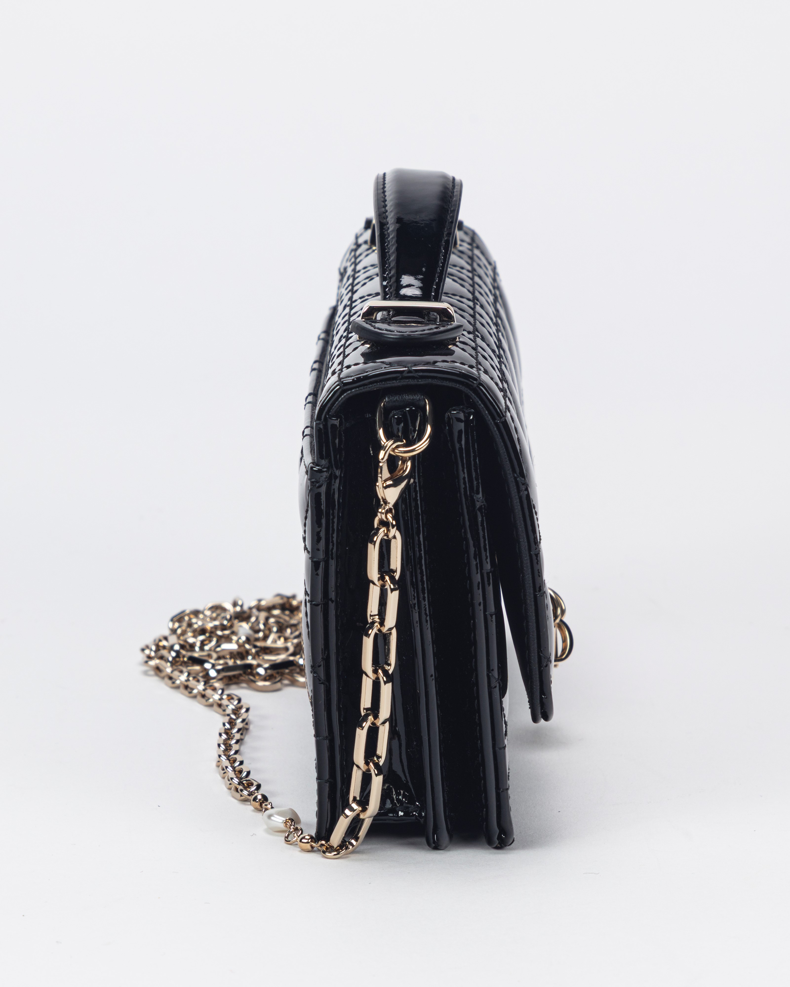 in vernice cannage color nero, dettagli in metallo, tracolla a catena staccabile, cm 21, con sacchettoBase d'asta