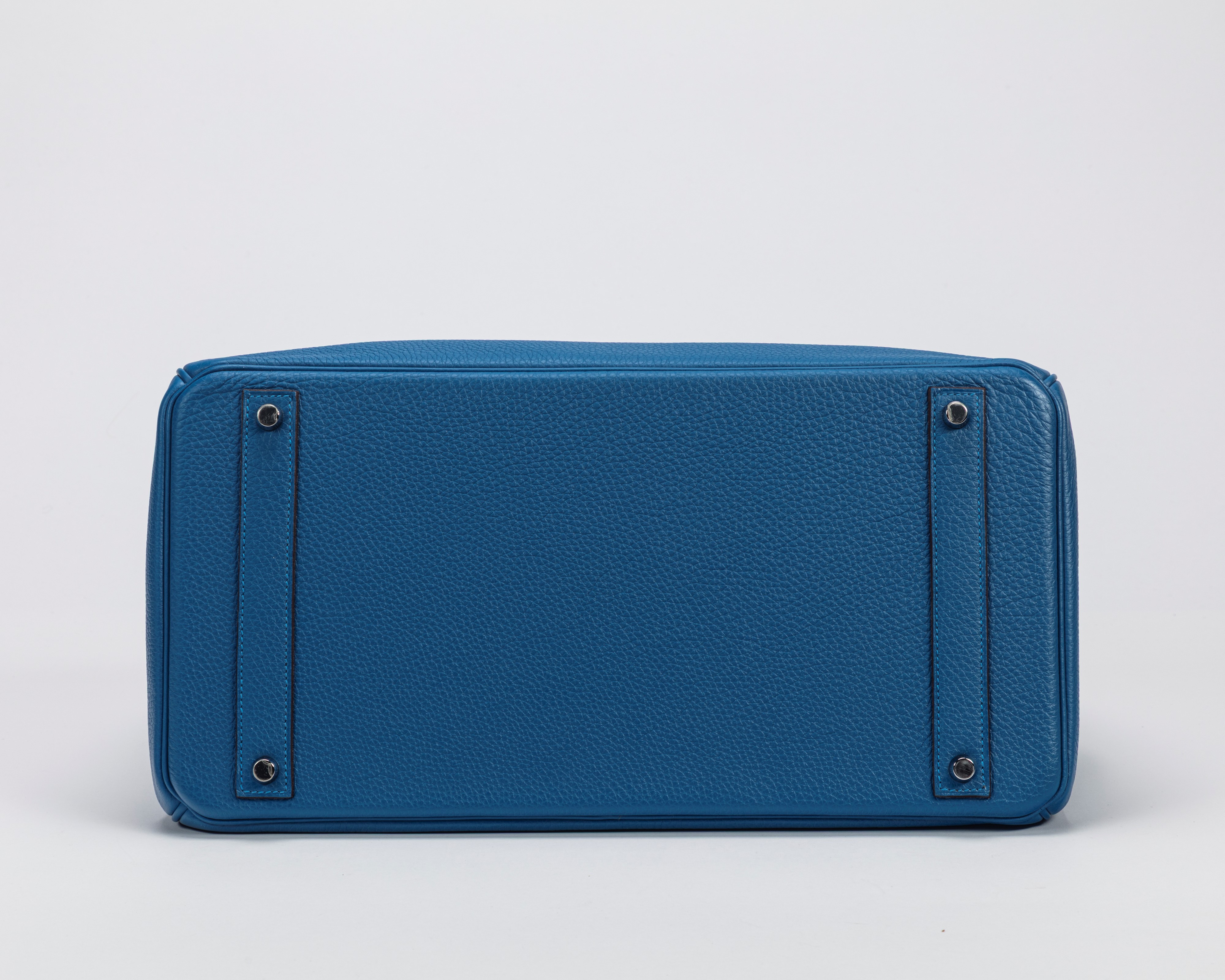 in pelle togo color bleu de Malte, dettagli in palladio, cm 40, con sacchetto (lievissimi segni d'uso)Base d'asta