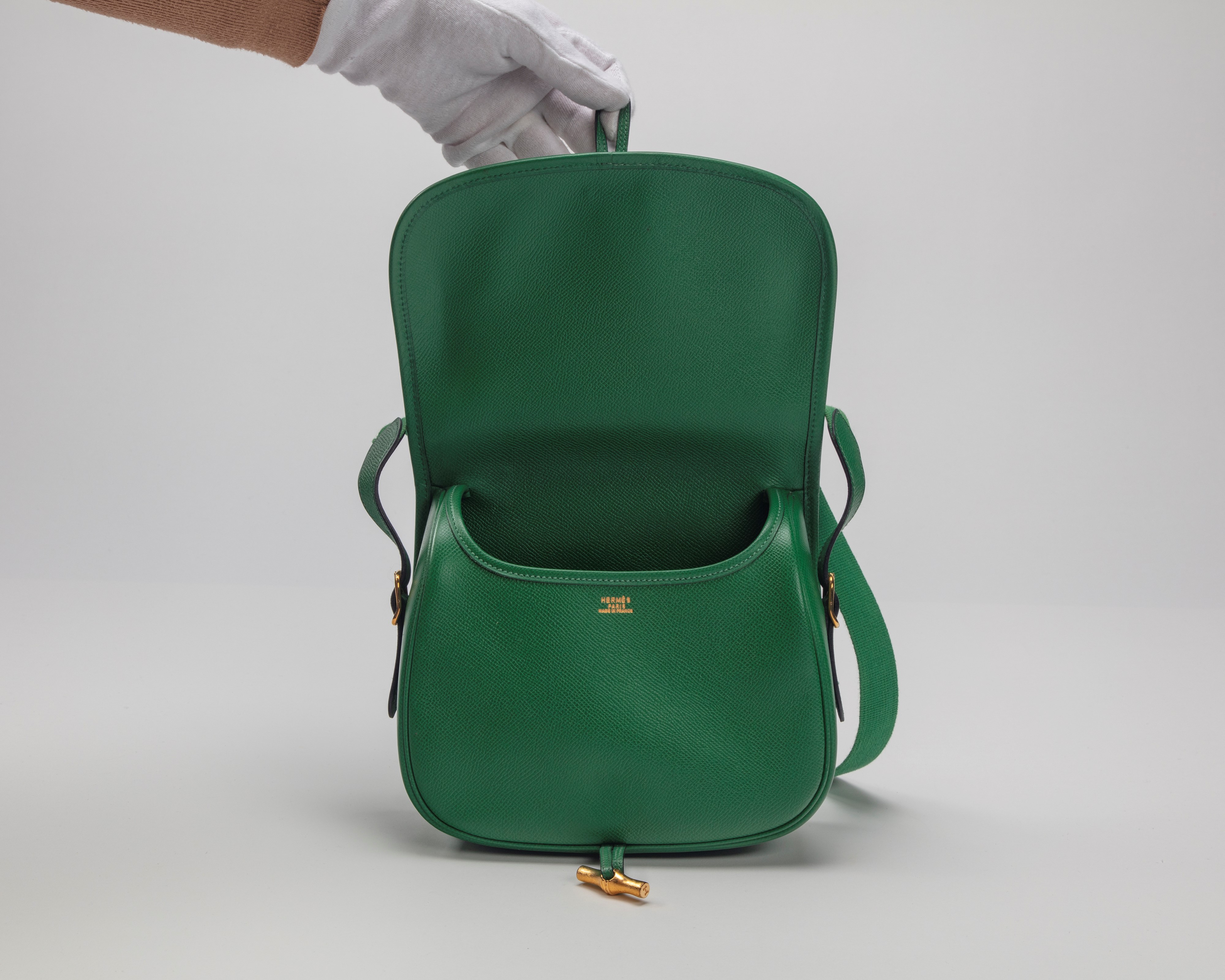 in pelle courchevel color verde, tracolla in tessuto, dettagli in metallo dorato, cm 22, con sacchetto (lievissimi segni d'uso)Base d'asta
