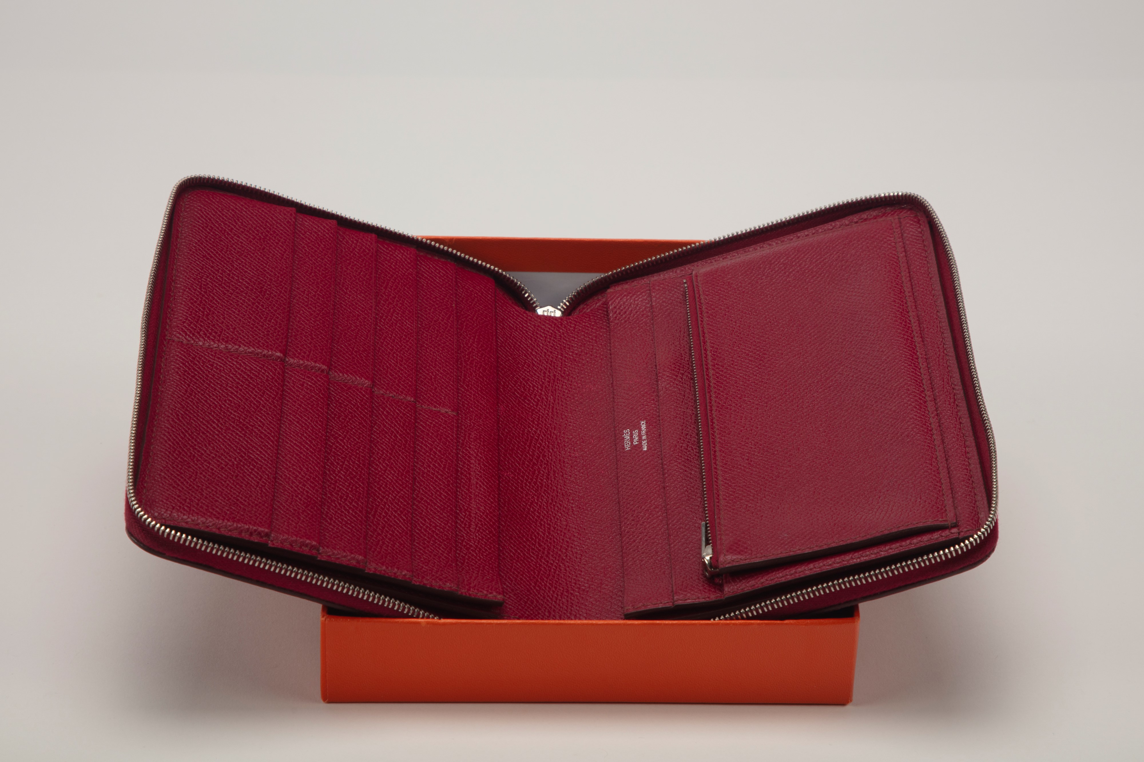 in pelle epsom color rosso, dettagli in palladio, cm 13 x 19 (chiuso), con scatola (lievi segni d'uso)Base d'asta