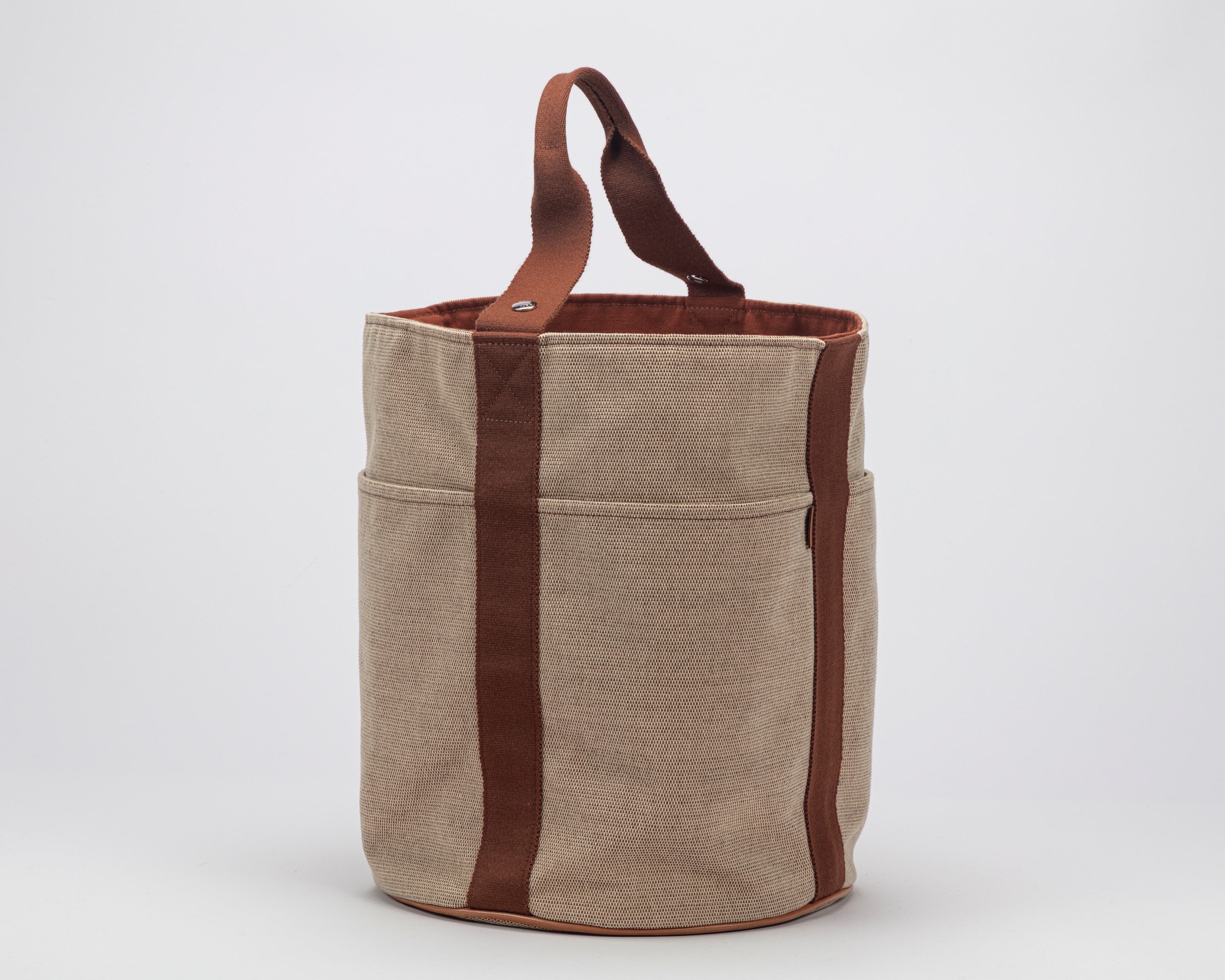 in tela color sabbia, interno in tela color nocciola, dettagli in metallo Clou de Selle, altezza cm 35, diametro cm 29