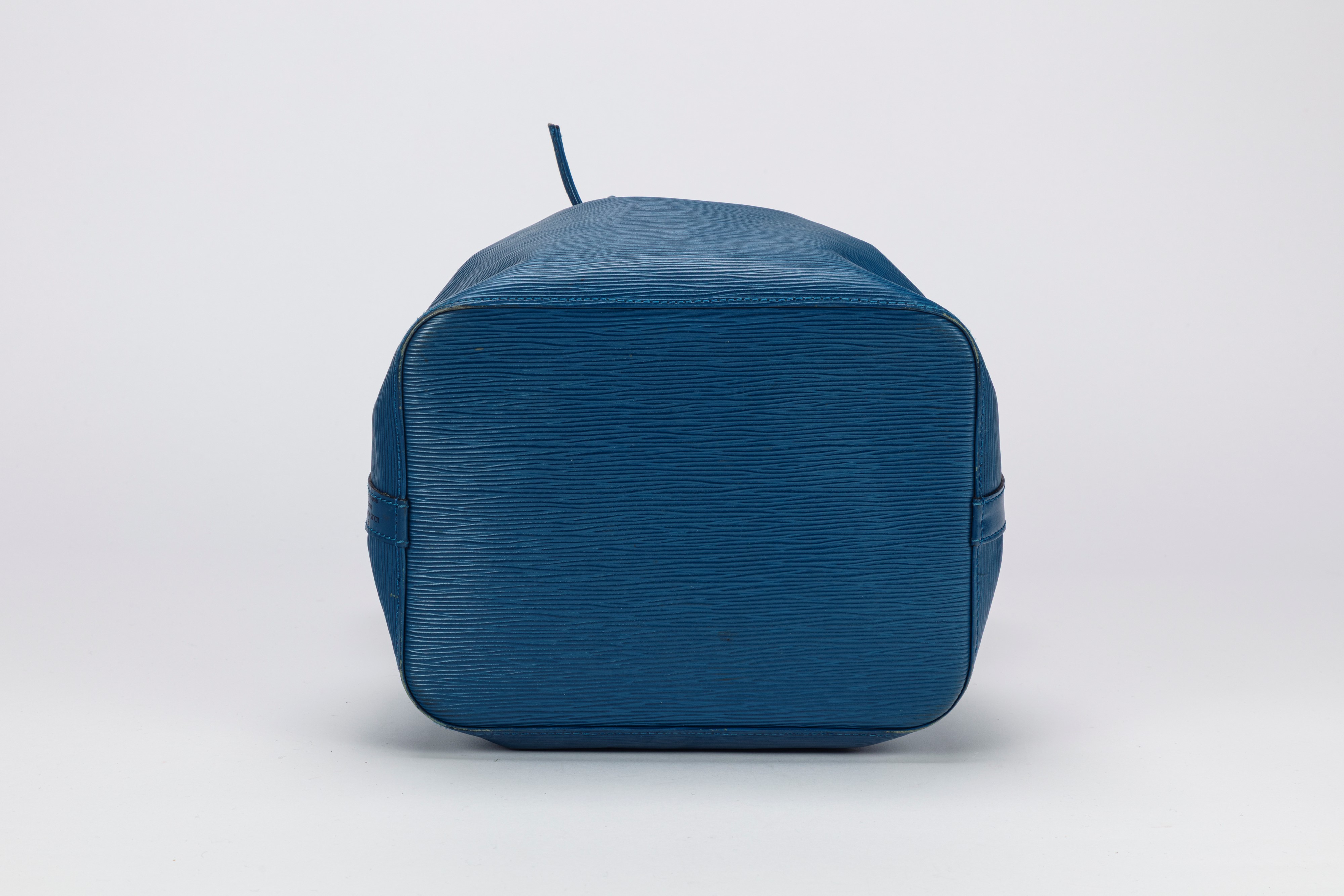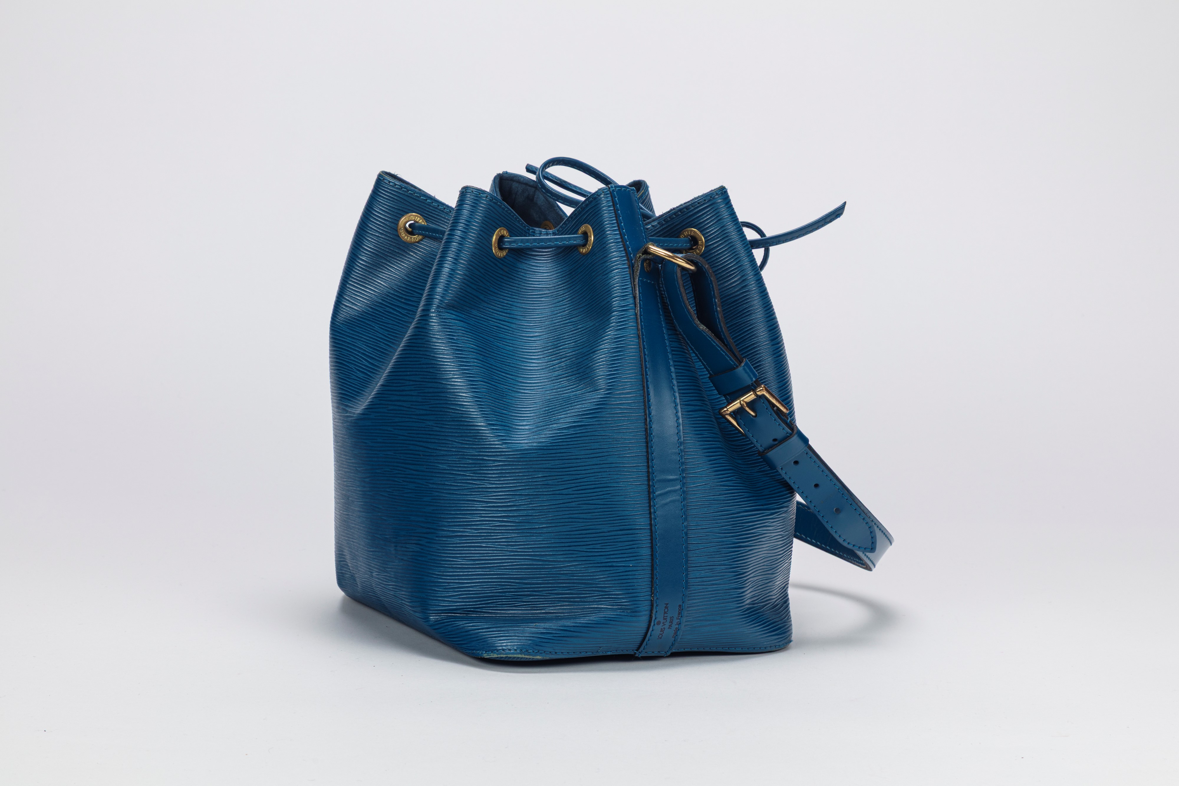 in cuir épi color blu, con tracolla regolabile, dettagli in metallo dorato, base cm 25 x 19 (segni d'uso)Base d'asta