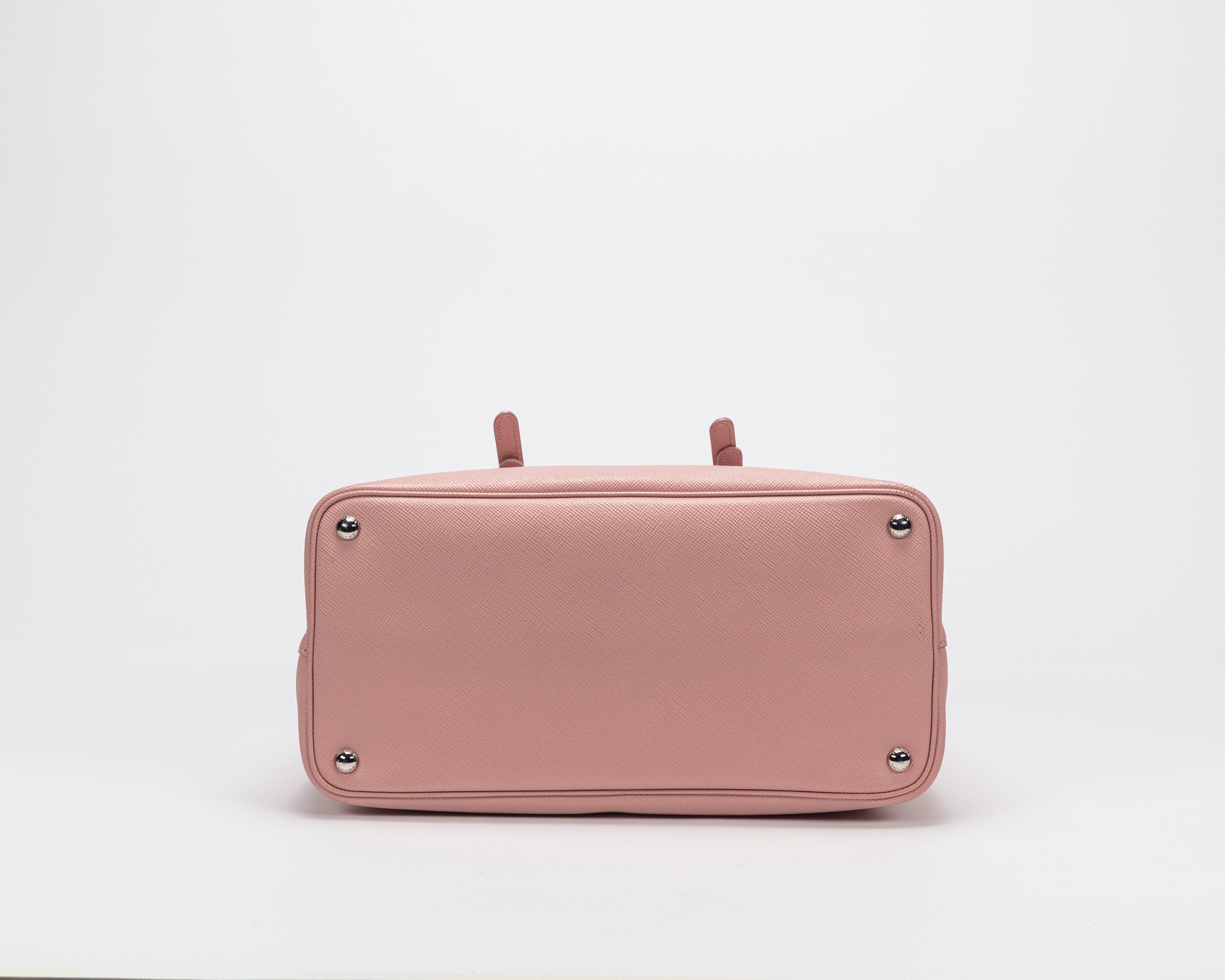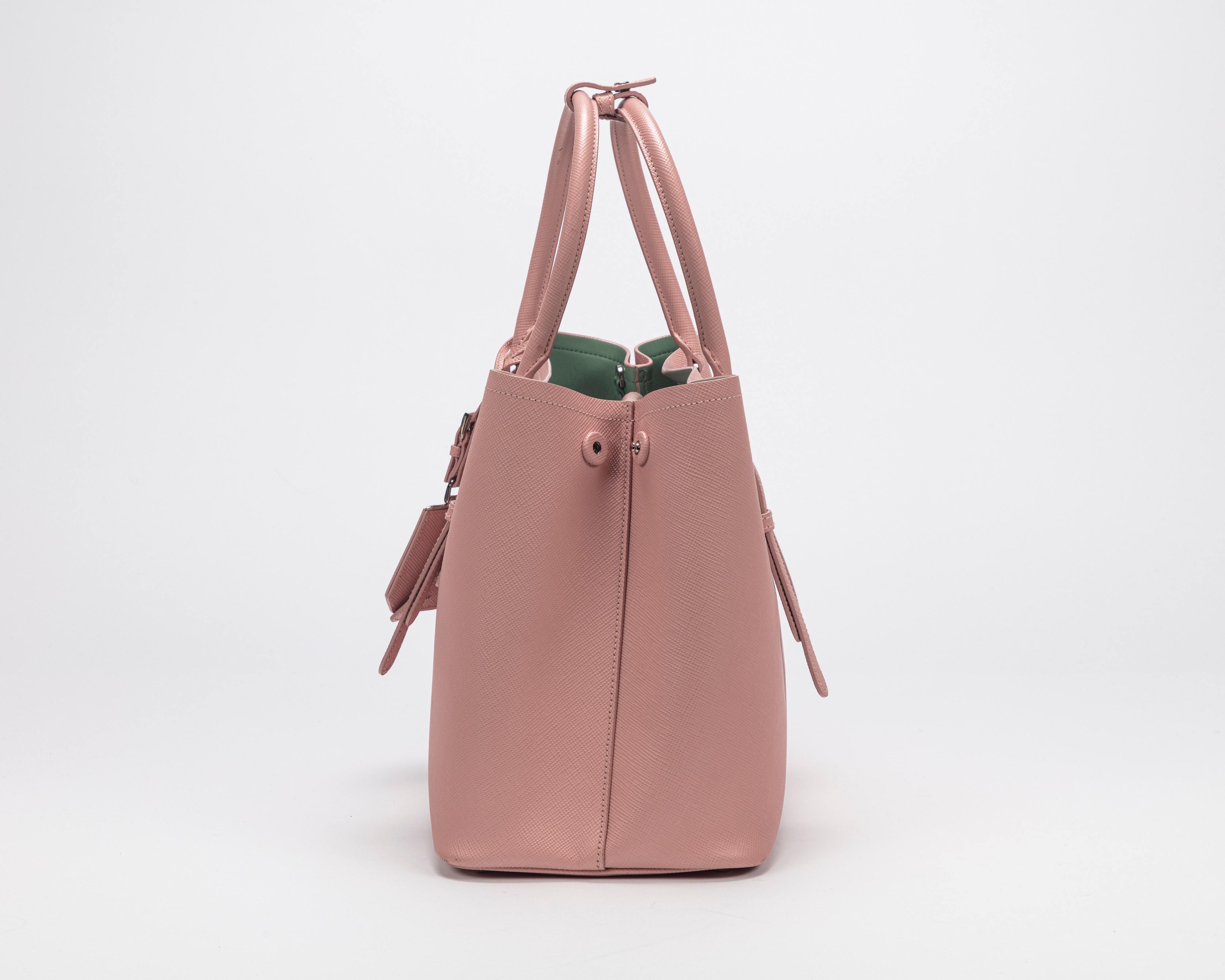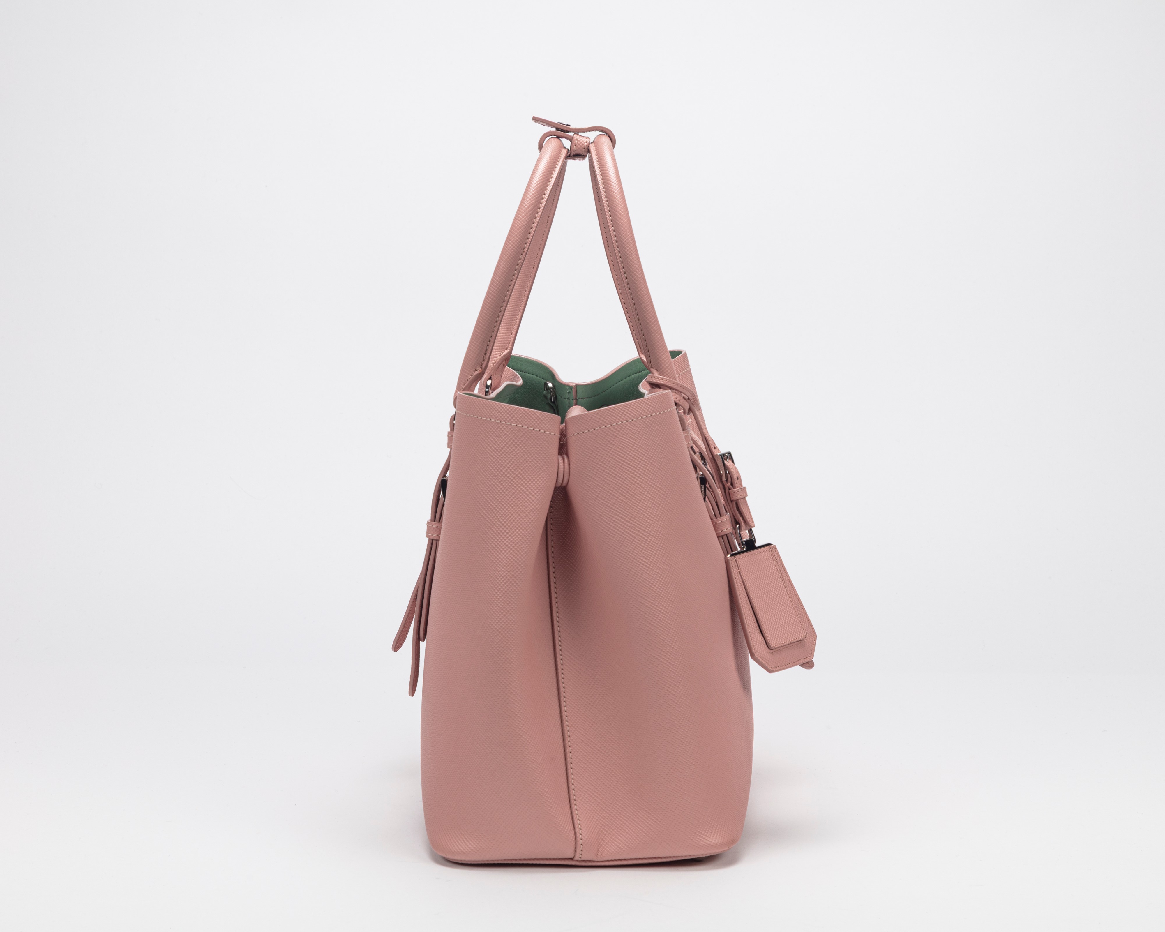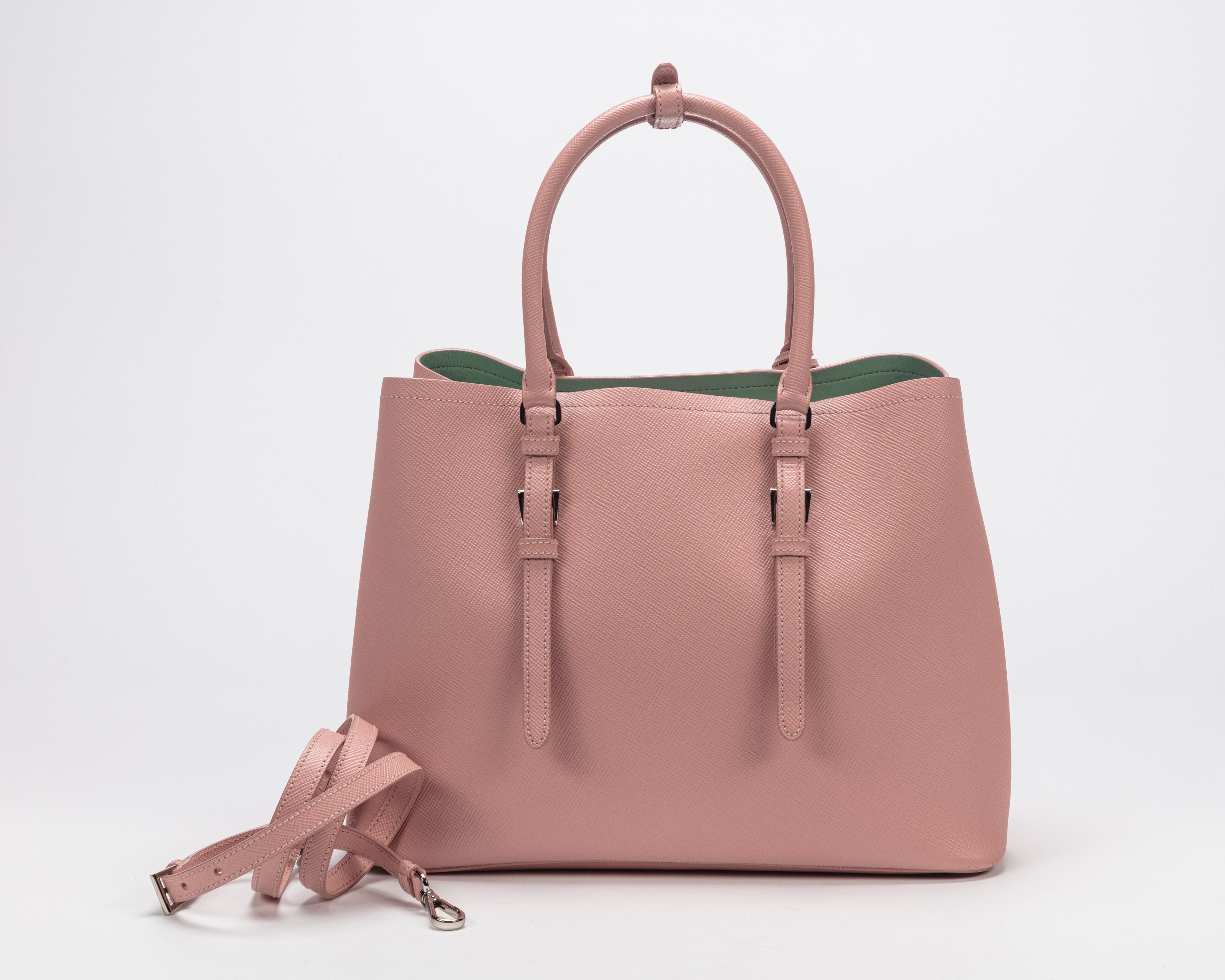 con doppi manici in pelle saffiano color rosa, interno in pelle verde menta, tracolla staccabile, dettagli in metallo, cm 36, con sacchetto (segni d'uso)Base d'asta