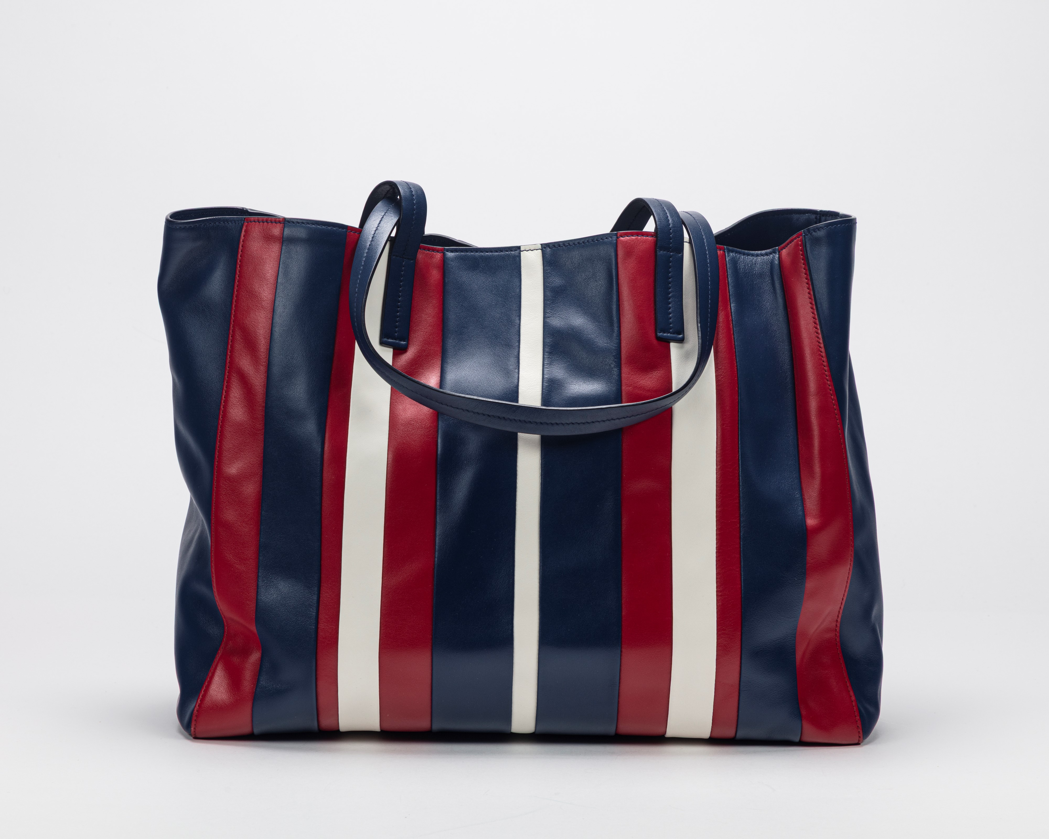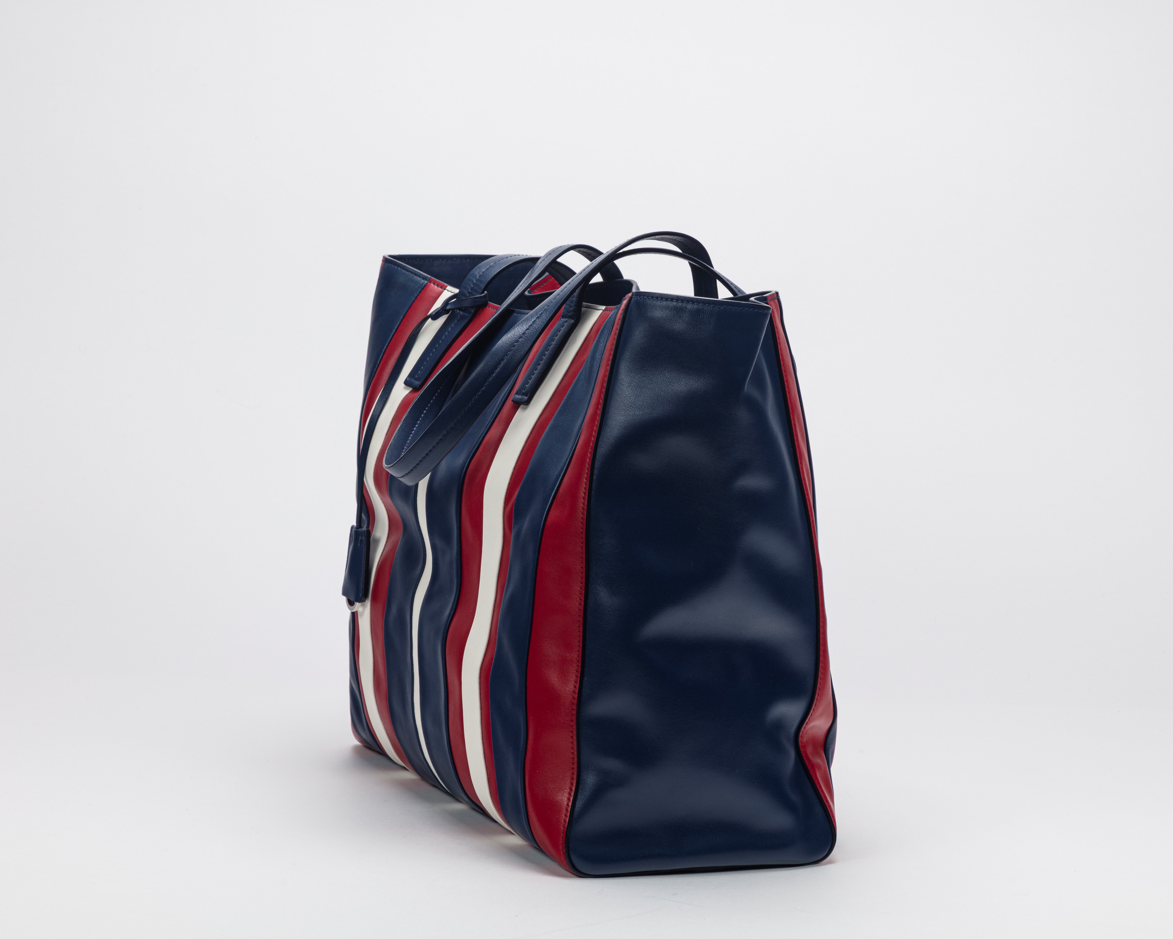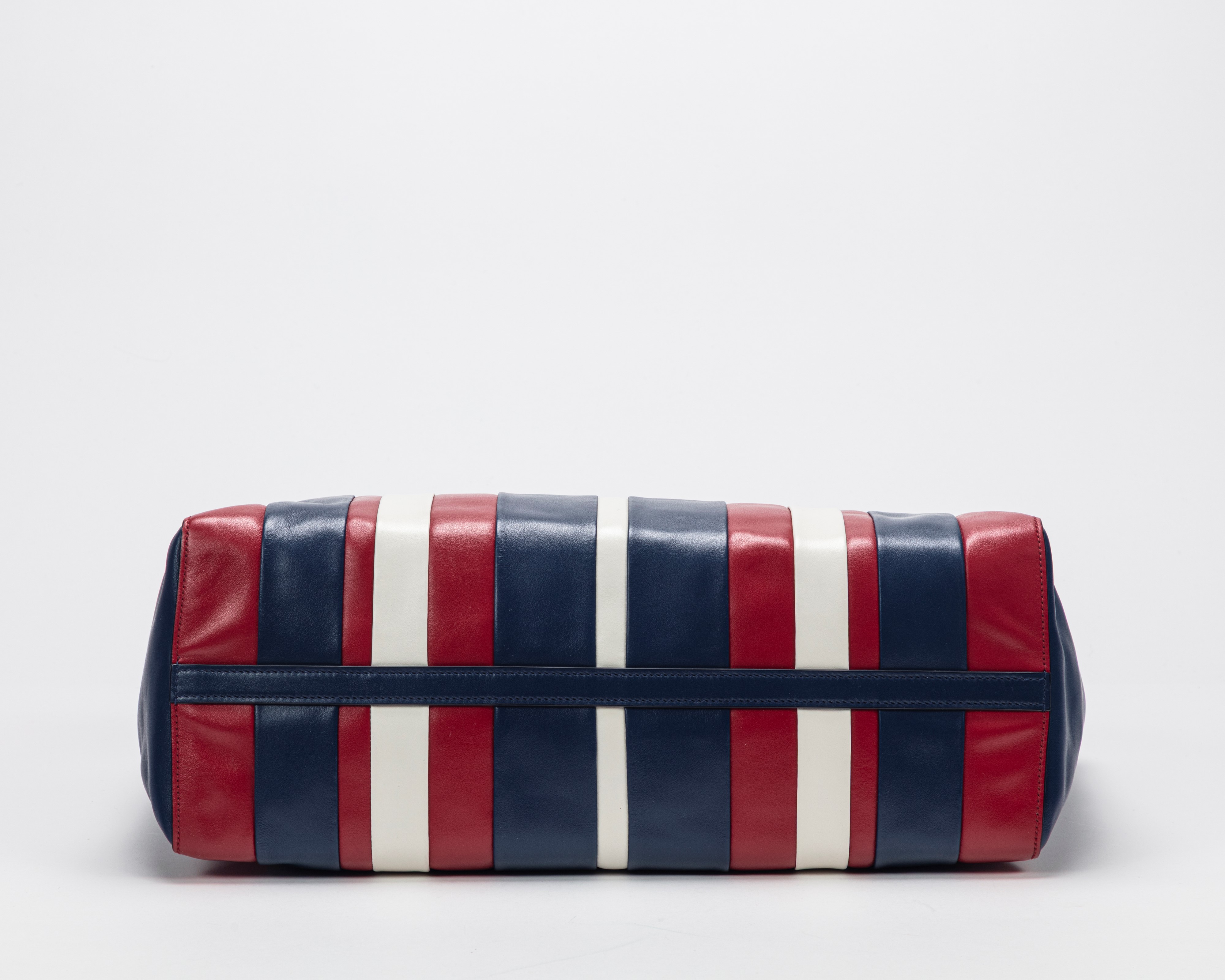 in pelle color blu, rosso e bianco, interno in tessuto logato, doppia tracolla, cm 40Base d'asta