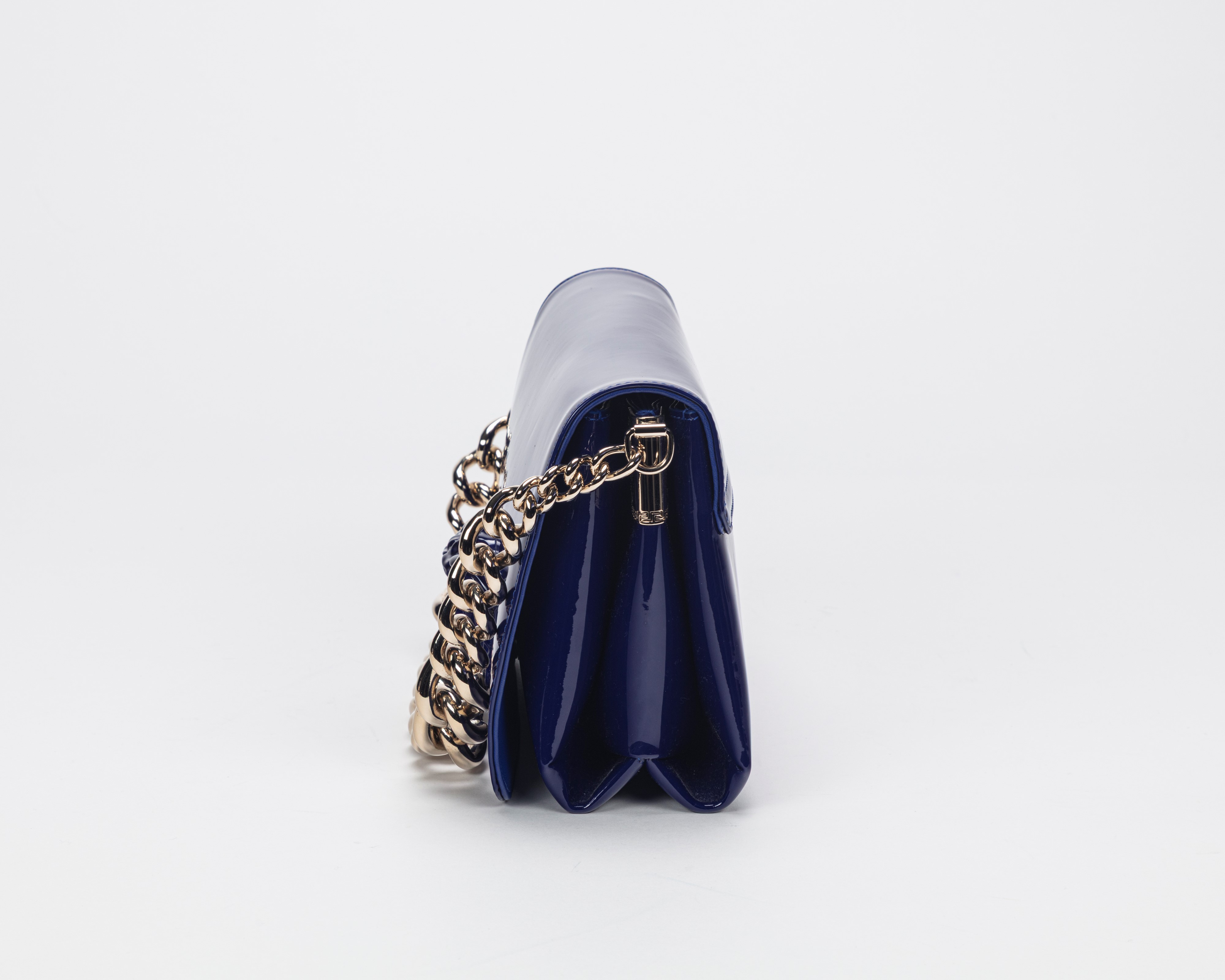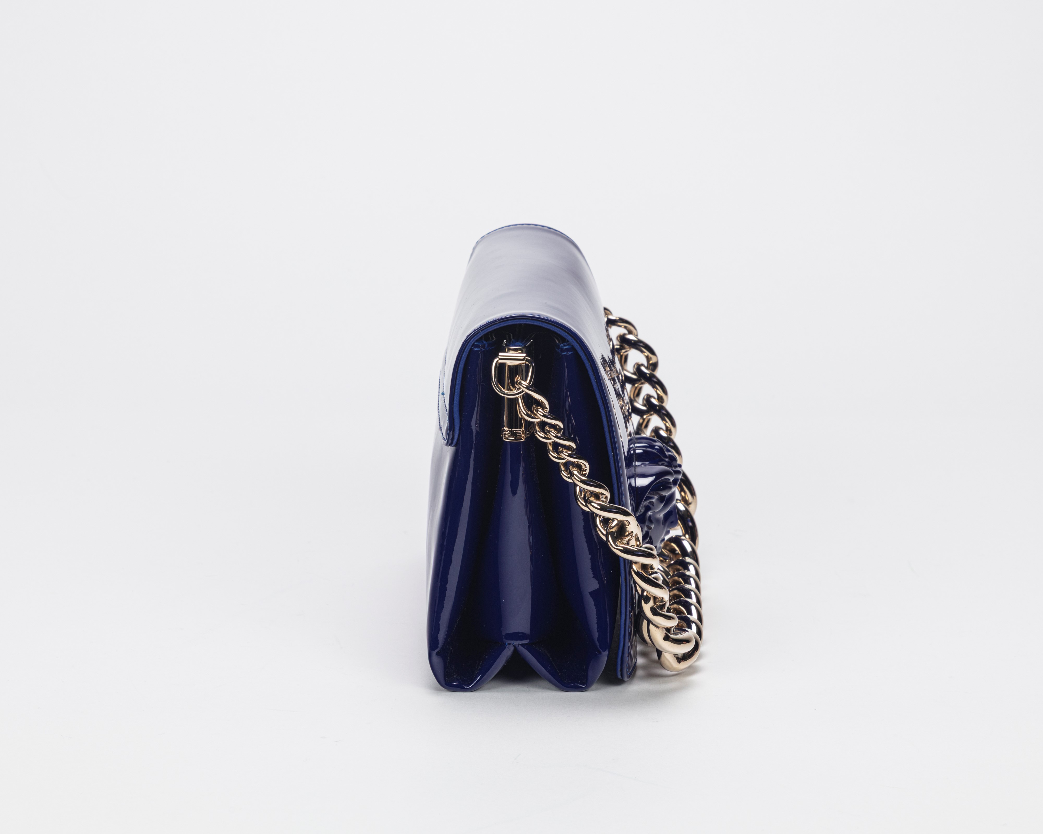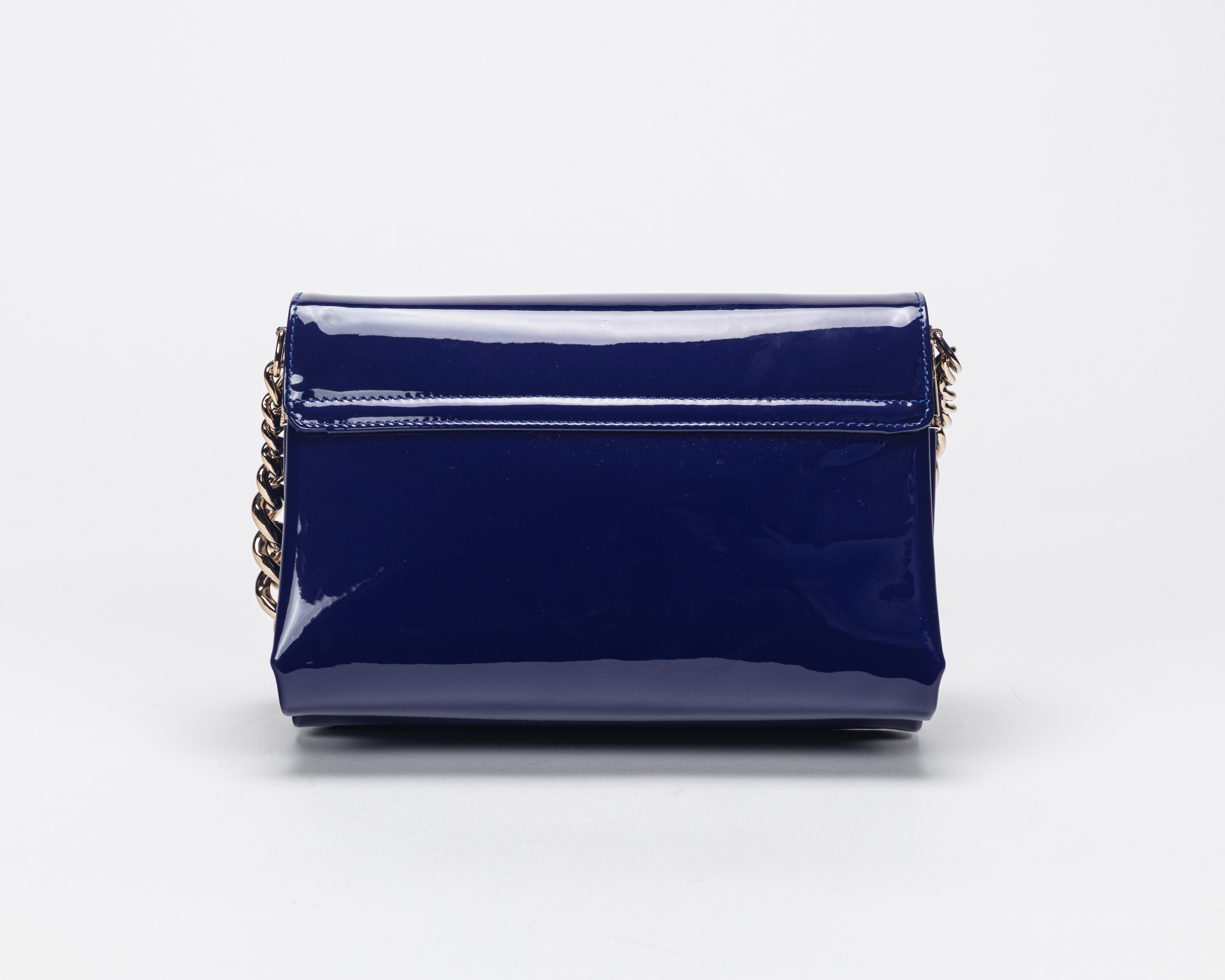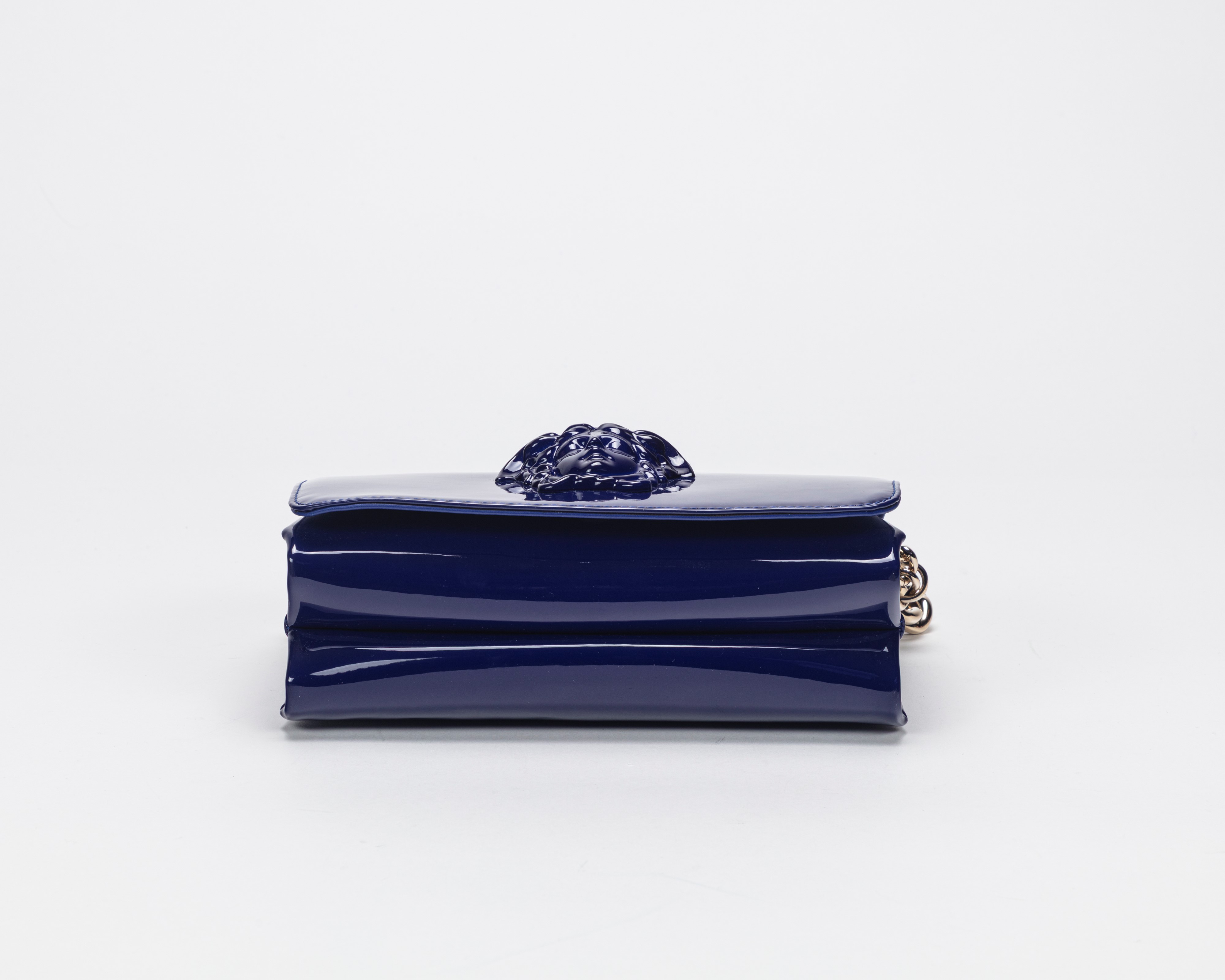 in vernice color viola, chiusura con Medusa in rilievo, tracolla a catena dégradé in metallo dorato, cm 24, con sacchetto
