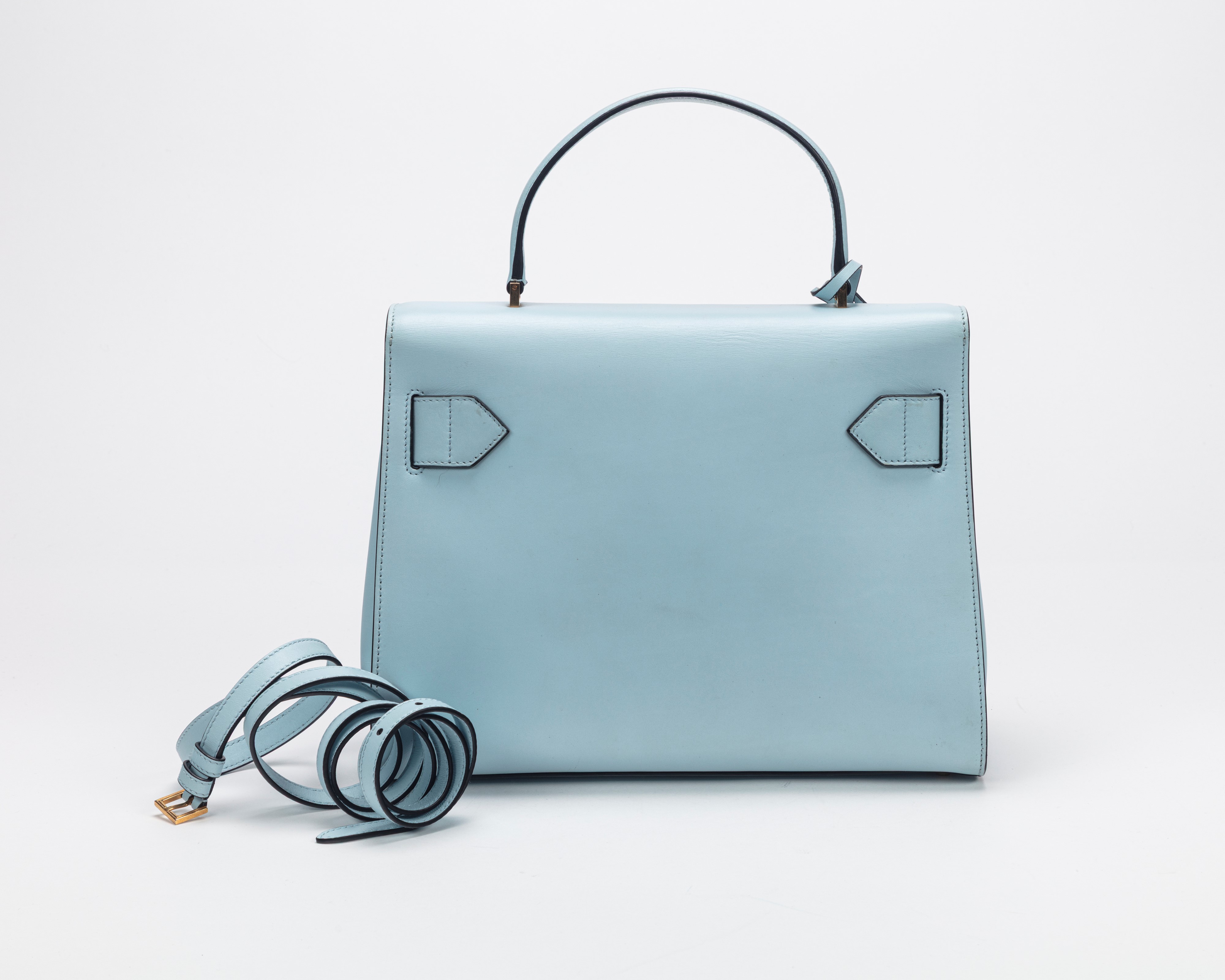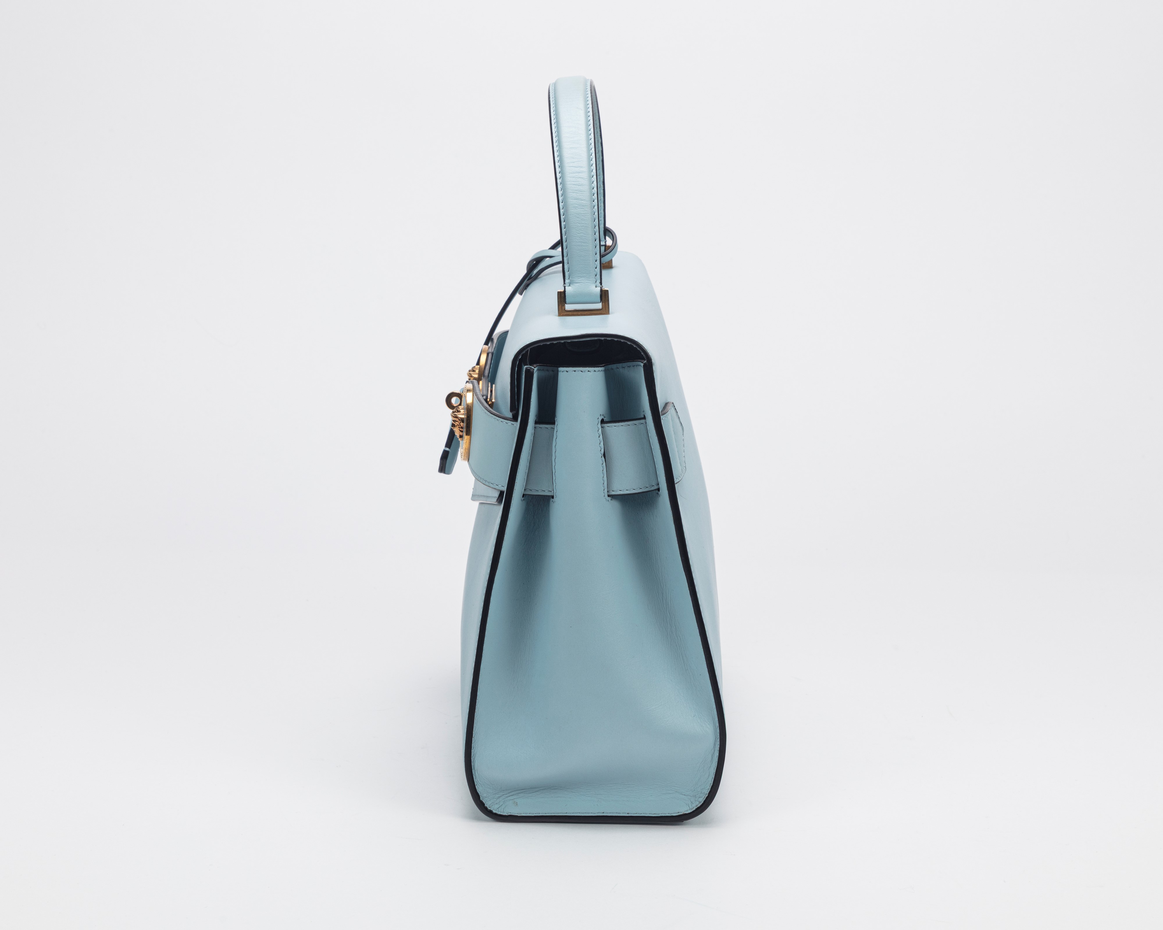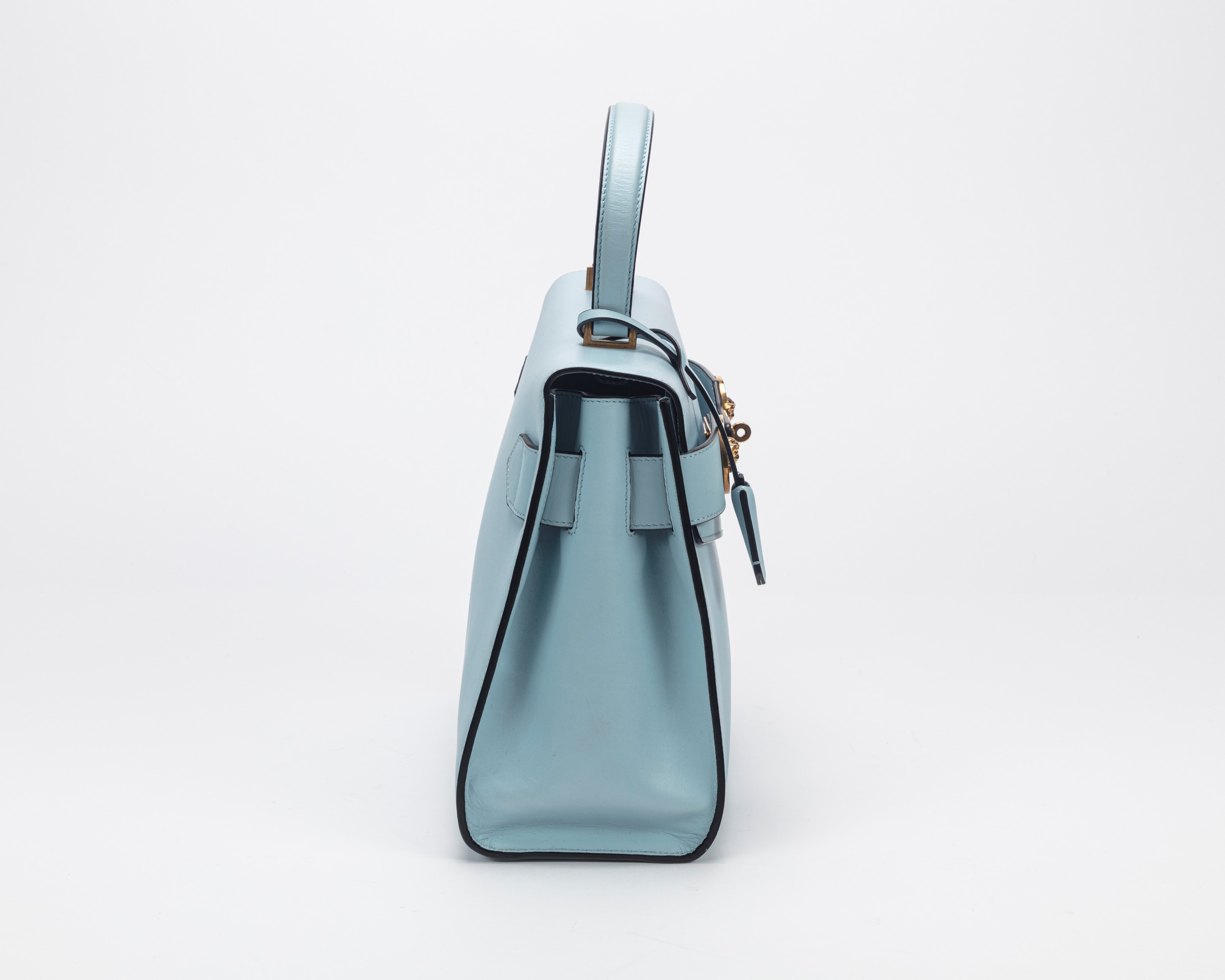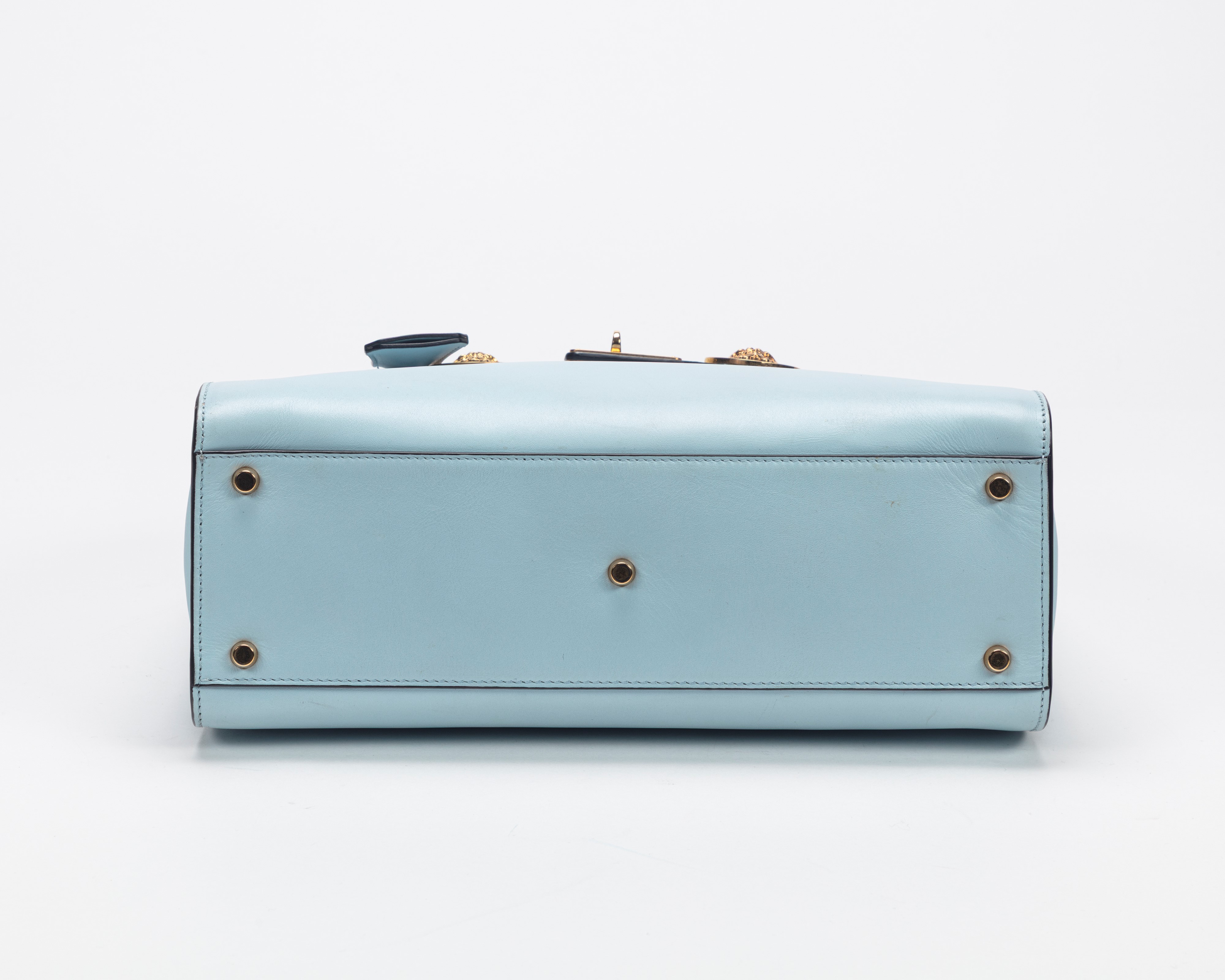 in pelle color azzurro, tracolla staccabile, dettagli in metallo dorato, borchie Medusa, cm 32, con sacchetto (lievissimi segni d'uso)Base d'asta