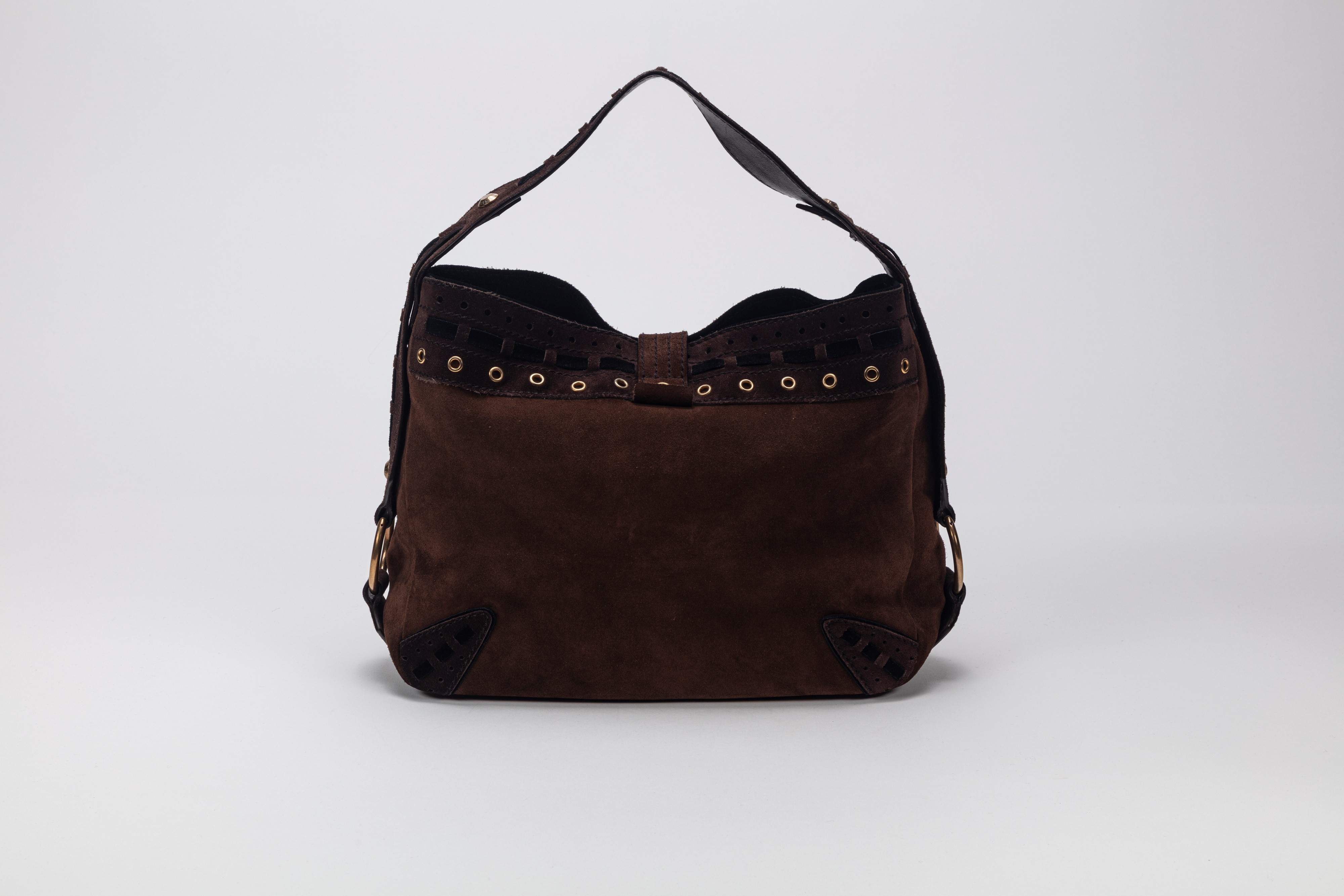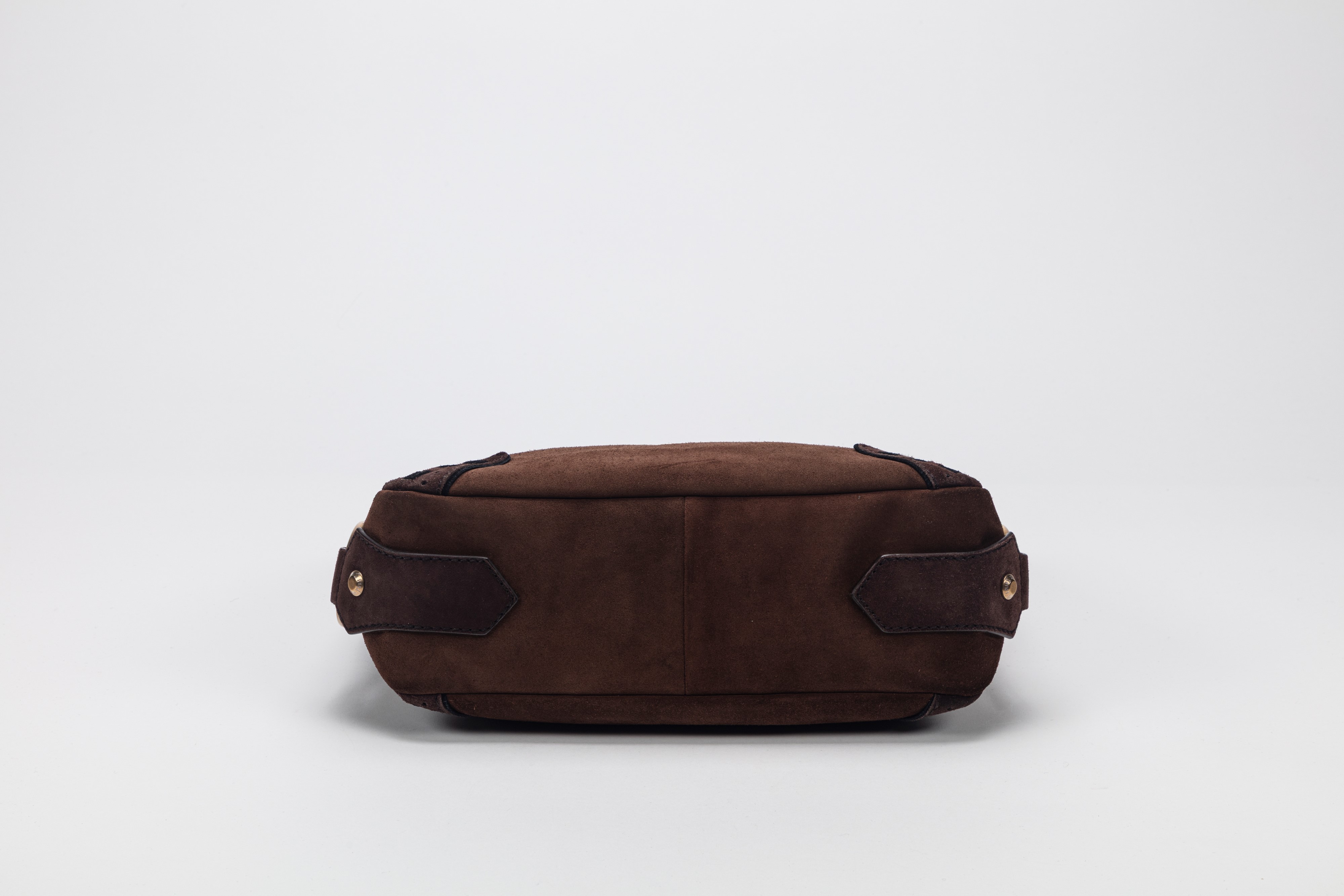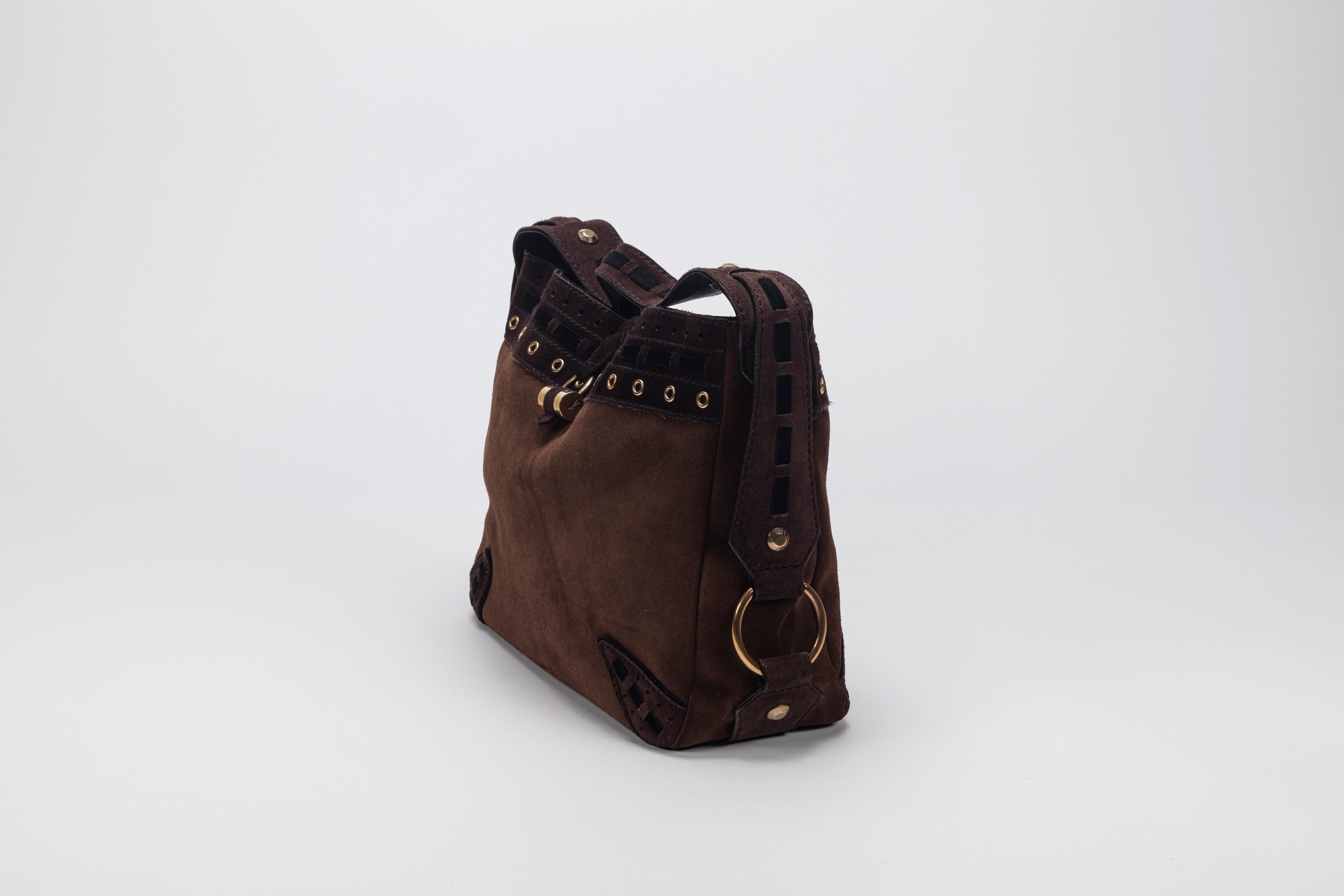 in camoscio color marrone e nero, dettagli in metallo dorato, cm 30, con sacchetto (lievi segni d'uso)