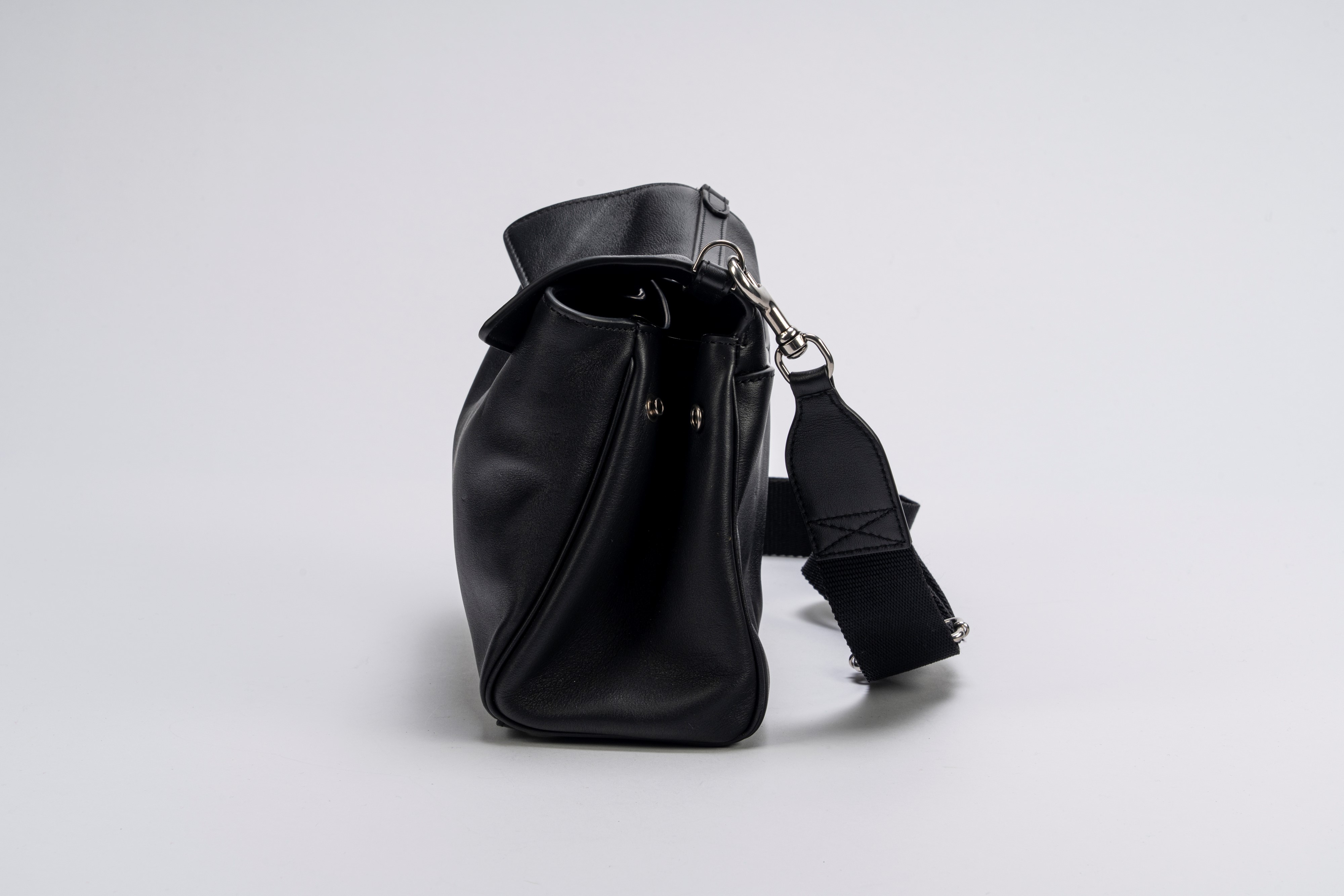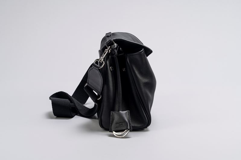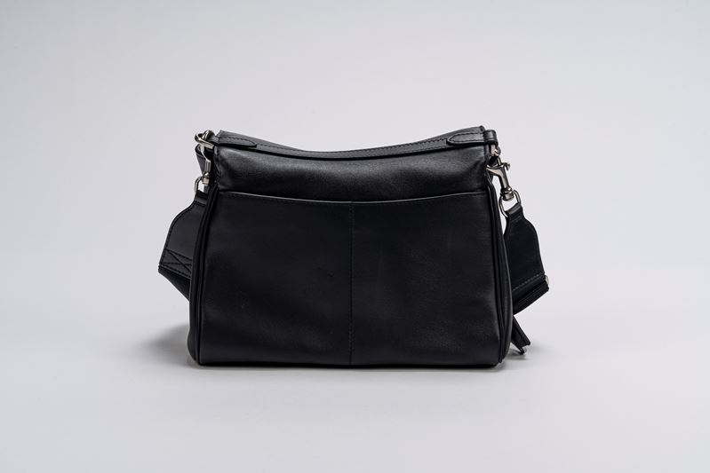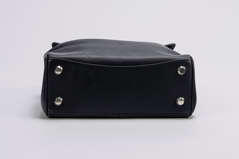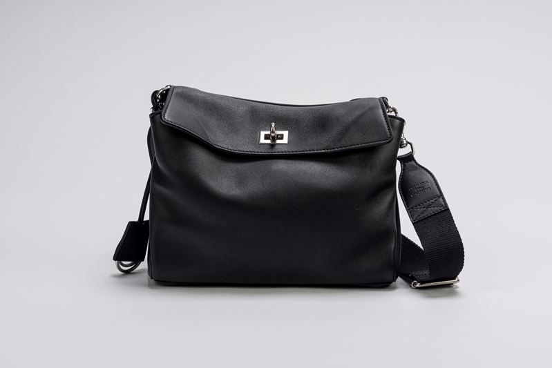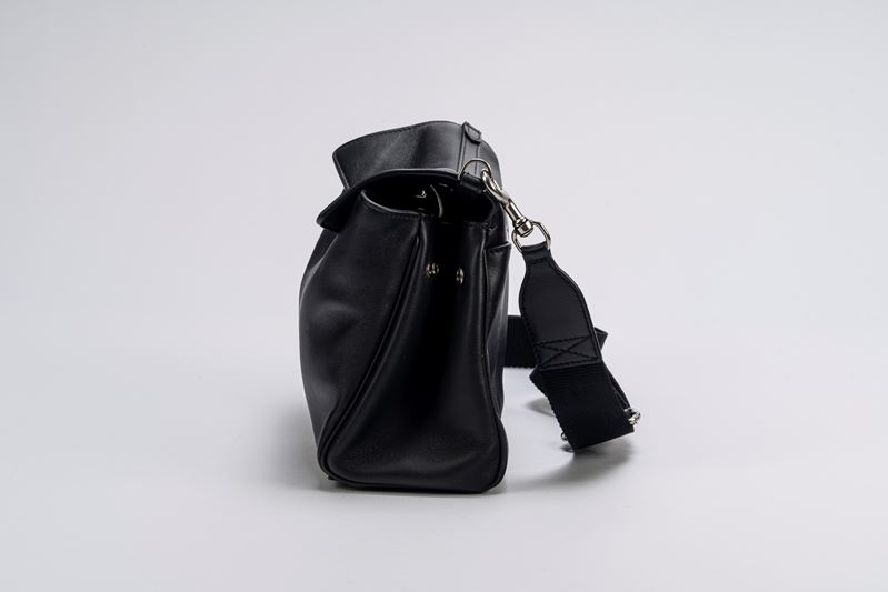 in pelle color nero, con tracolla staccabile e regolabile in tessuto, dettagli in metallo, cm 25, con sacchetto (lievi segni d'uso)Base d'asta