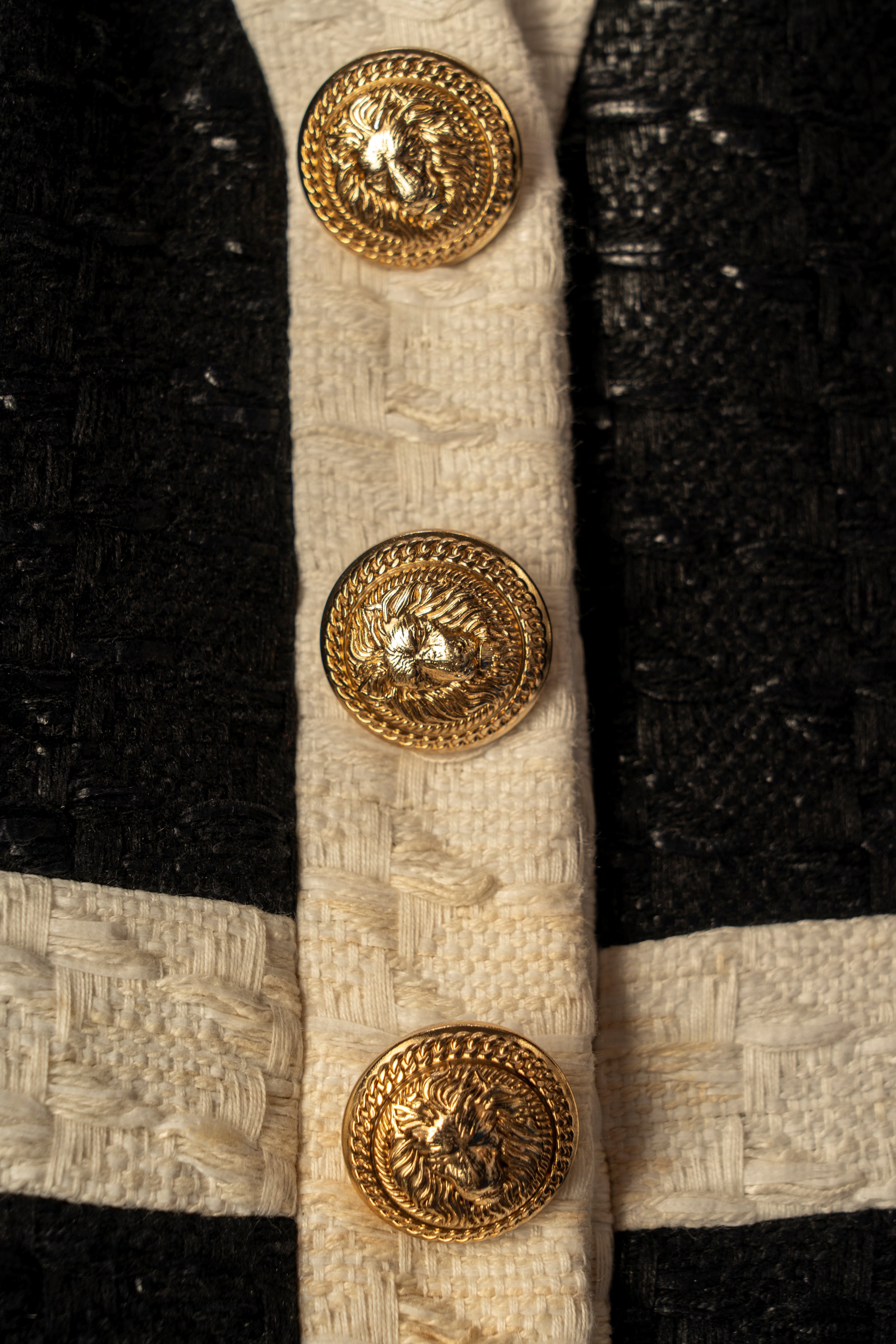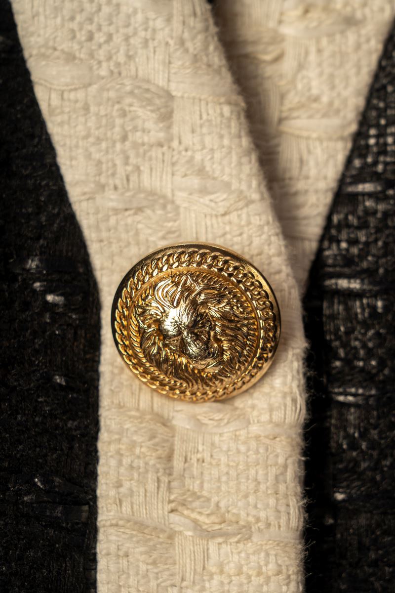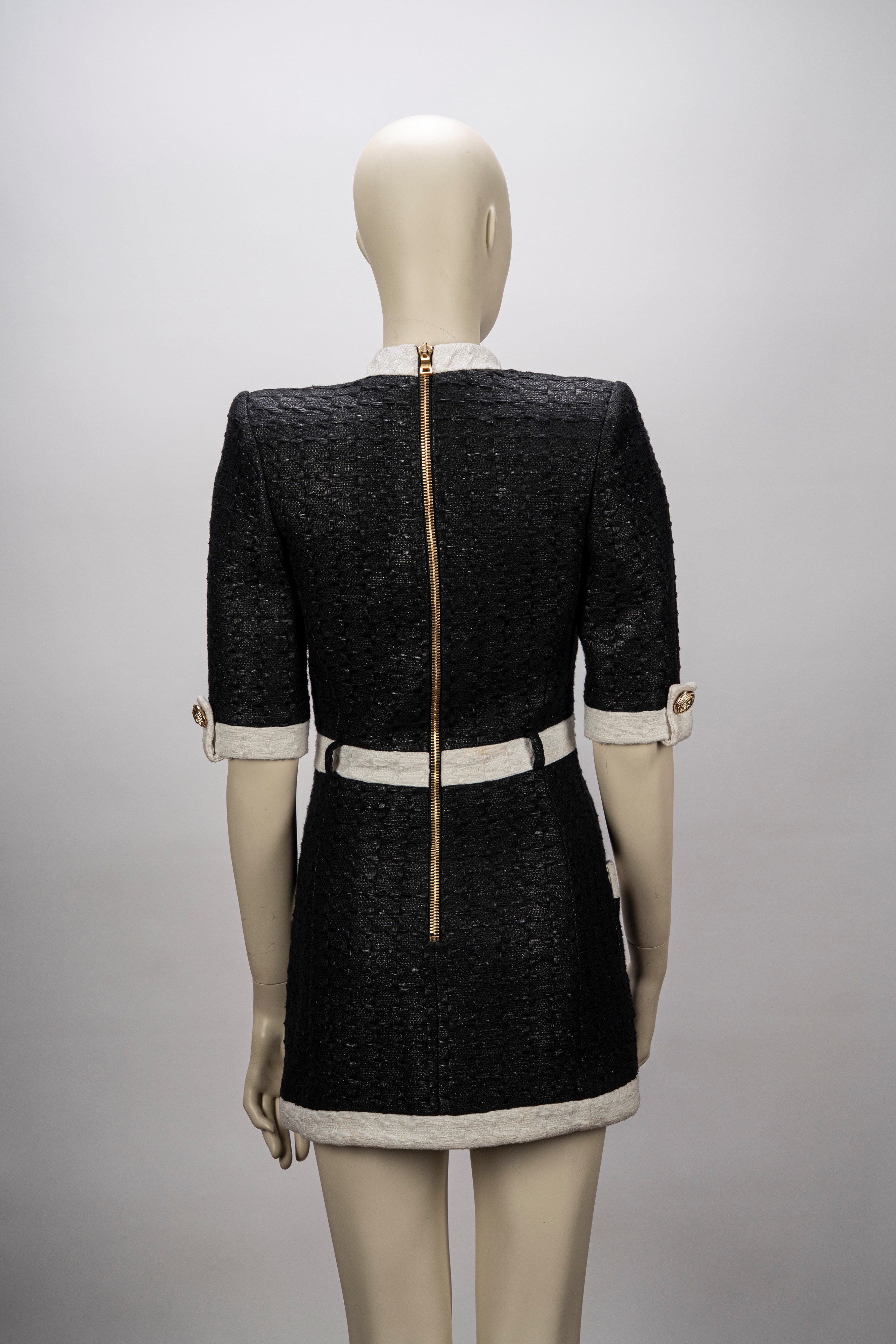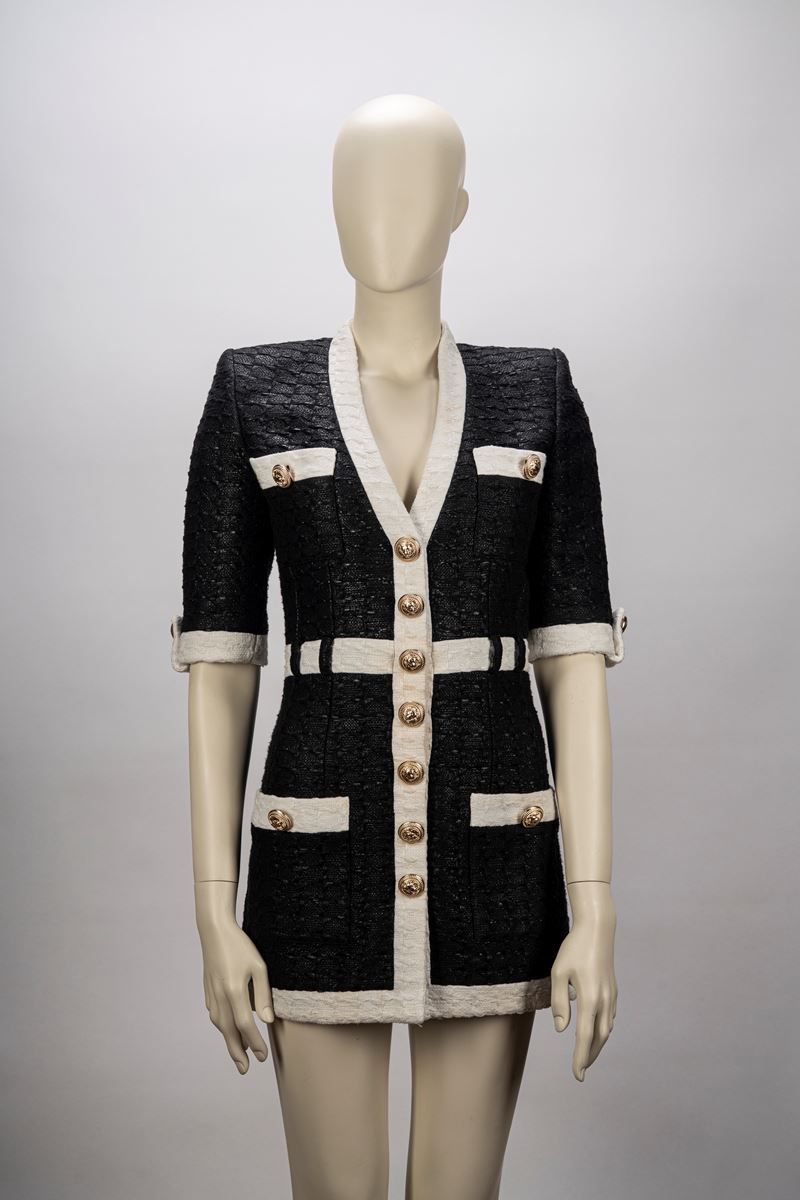 in tessuto operato misto cotone color nero, manica corta, profili color panna, bottoni gioiello in metallo dorato, chiusura a cerniera sul retro, taglia 38 (mancante di cintura)Base d'asta