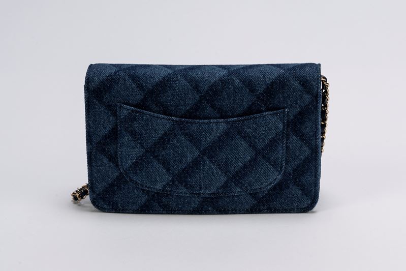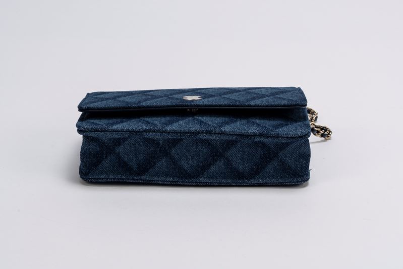in tela denim color blu con stampa matelassé, tracolla a catena, cm 19, con sacchetto