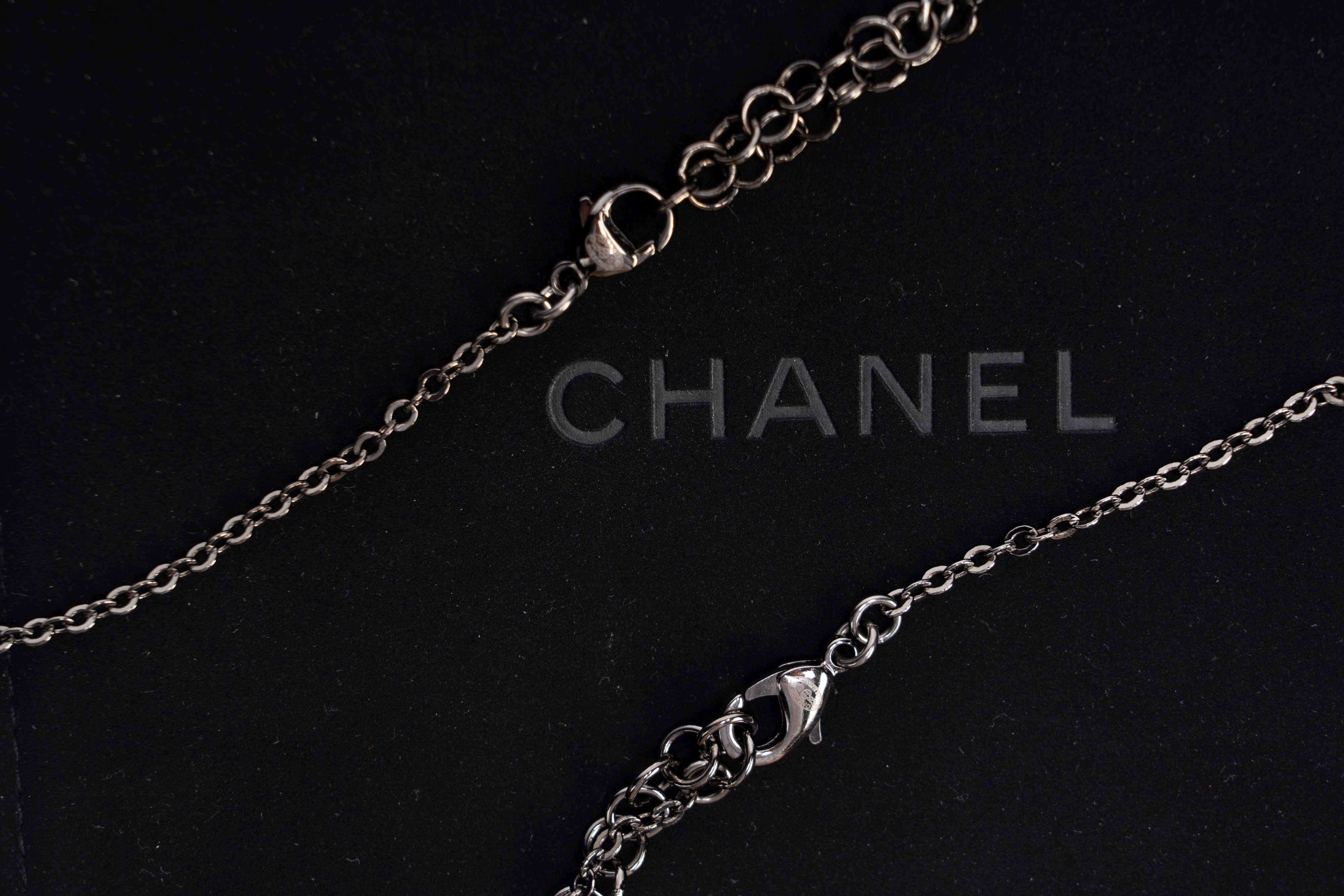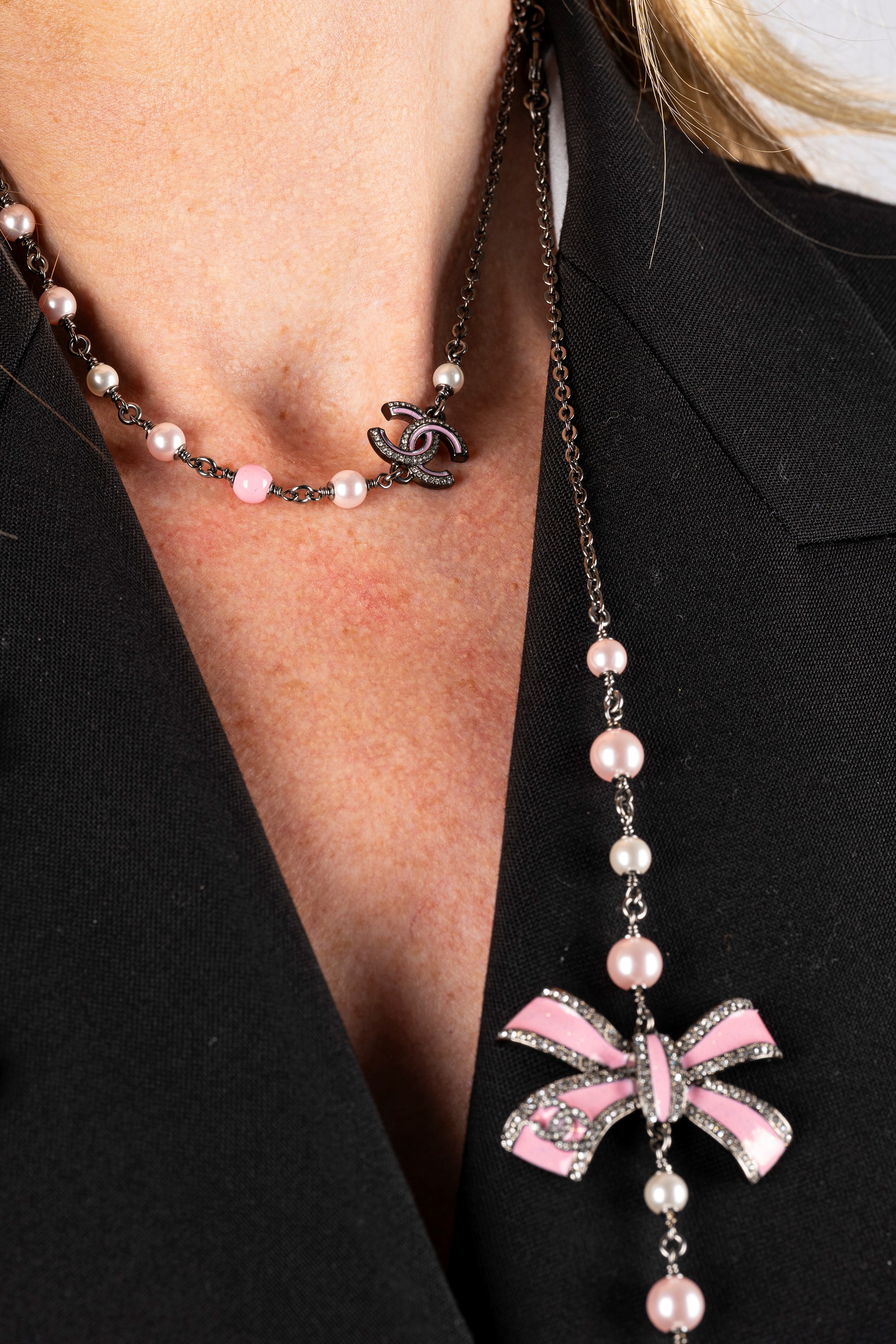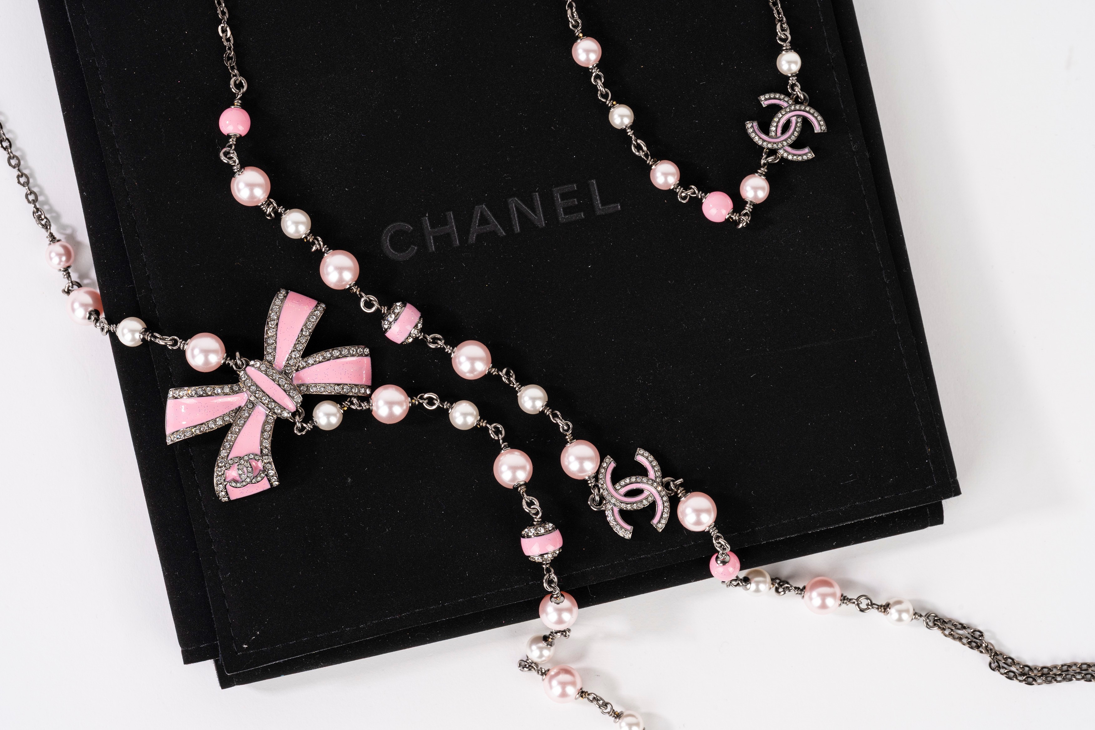 a catena in rutenio, perle fancy e smalto color rosa, cm 100 e cm 40, con custodiaBase d'asta