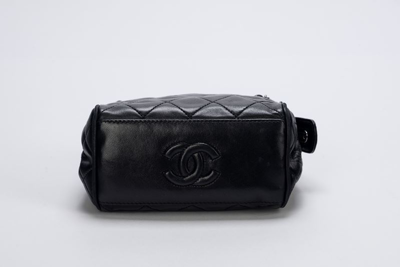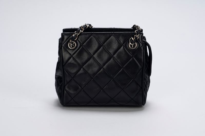 in pelle matelassè color nero, dettagli in metallo, doppi manici a catena, cm 15 (lievi segni d'uso)