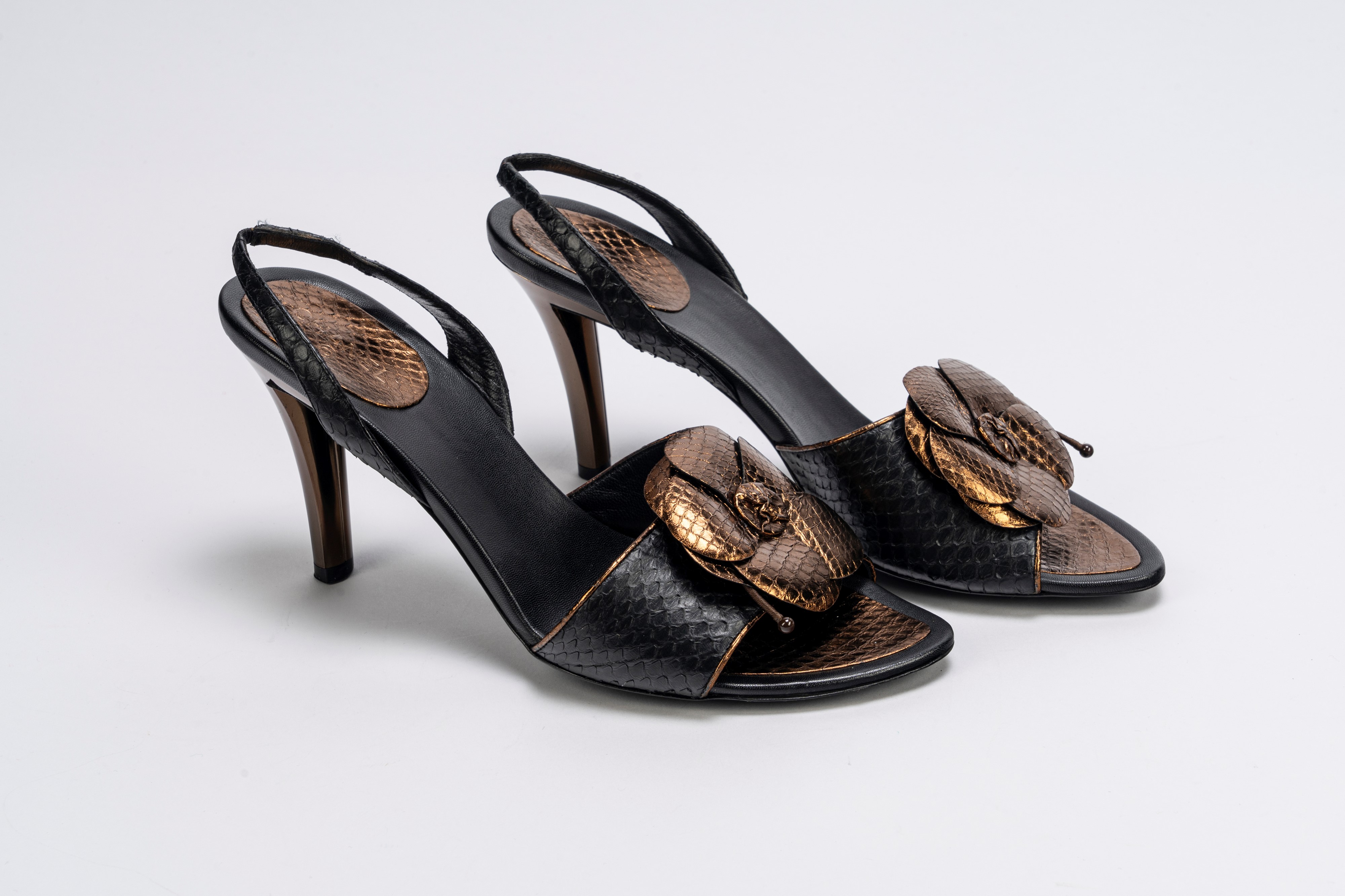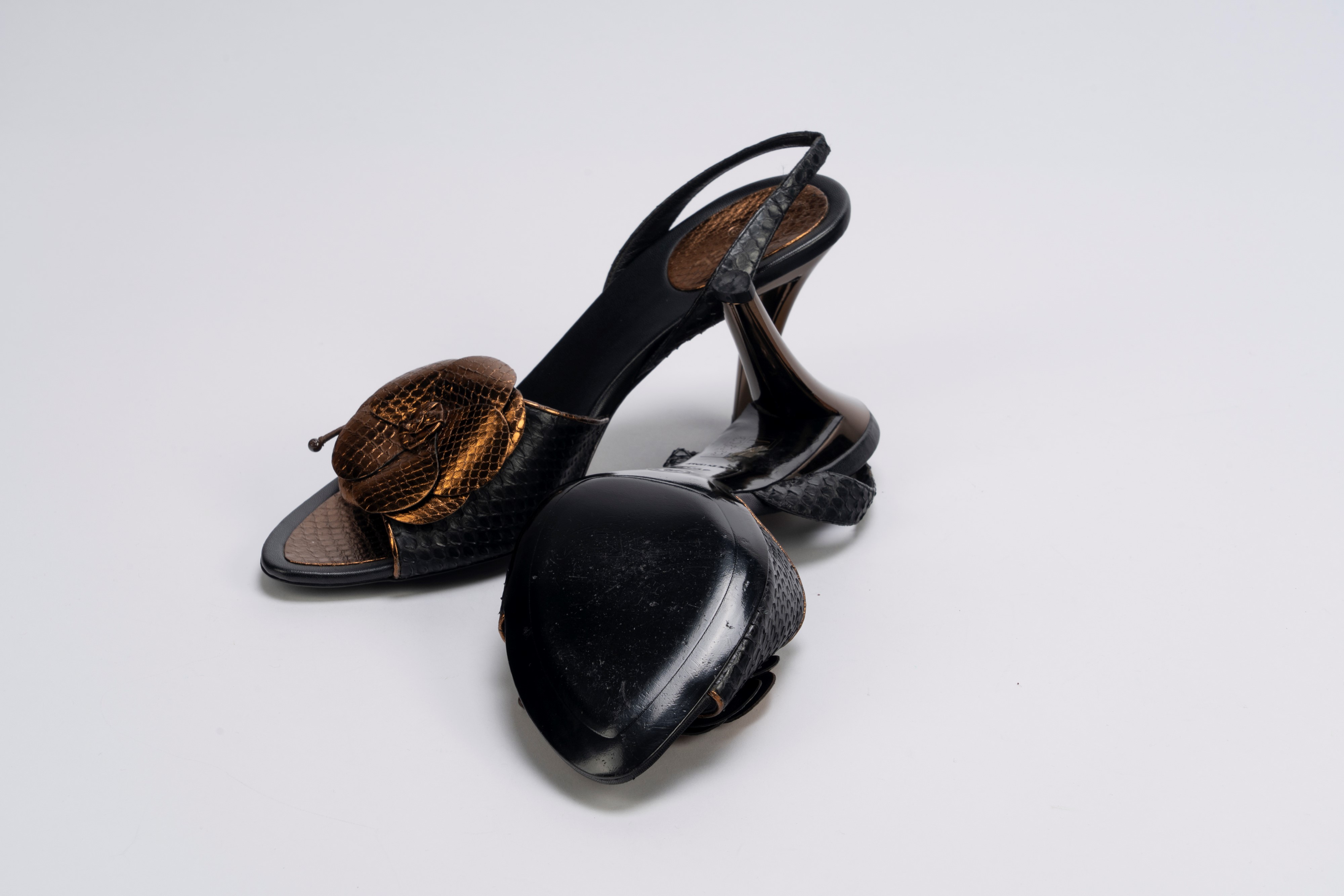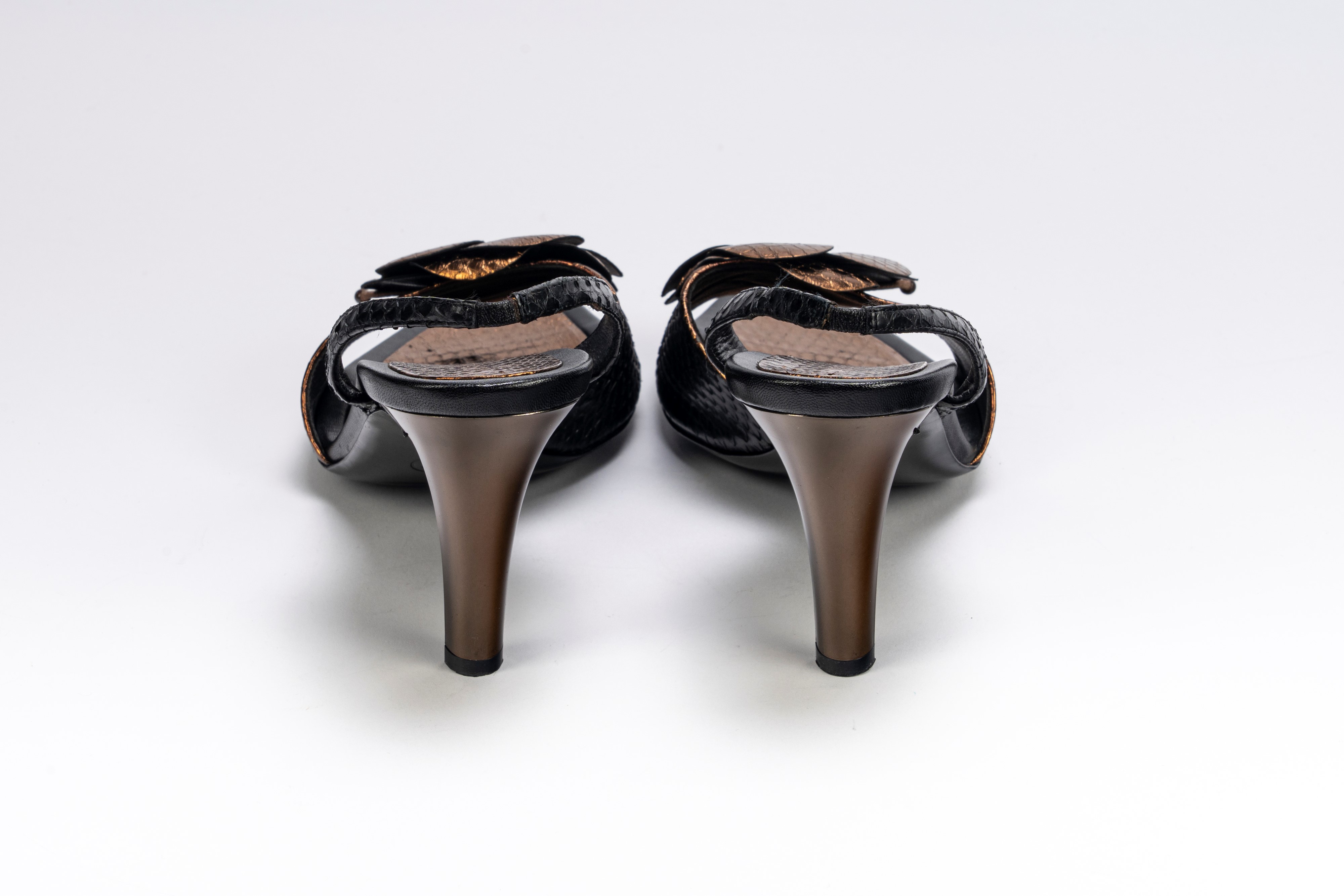 in pelle color nero e bronzo, misure 39 1/2, con sacchetto, tacco cm 10 (lievi segni d'uso),Base d'asta