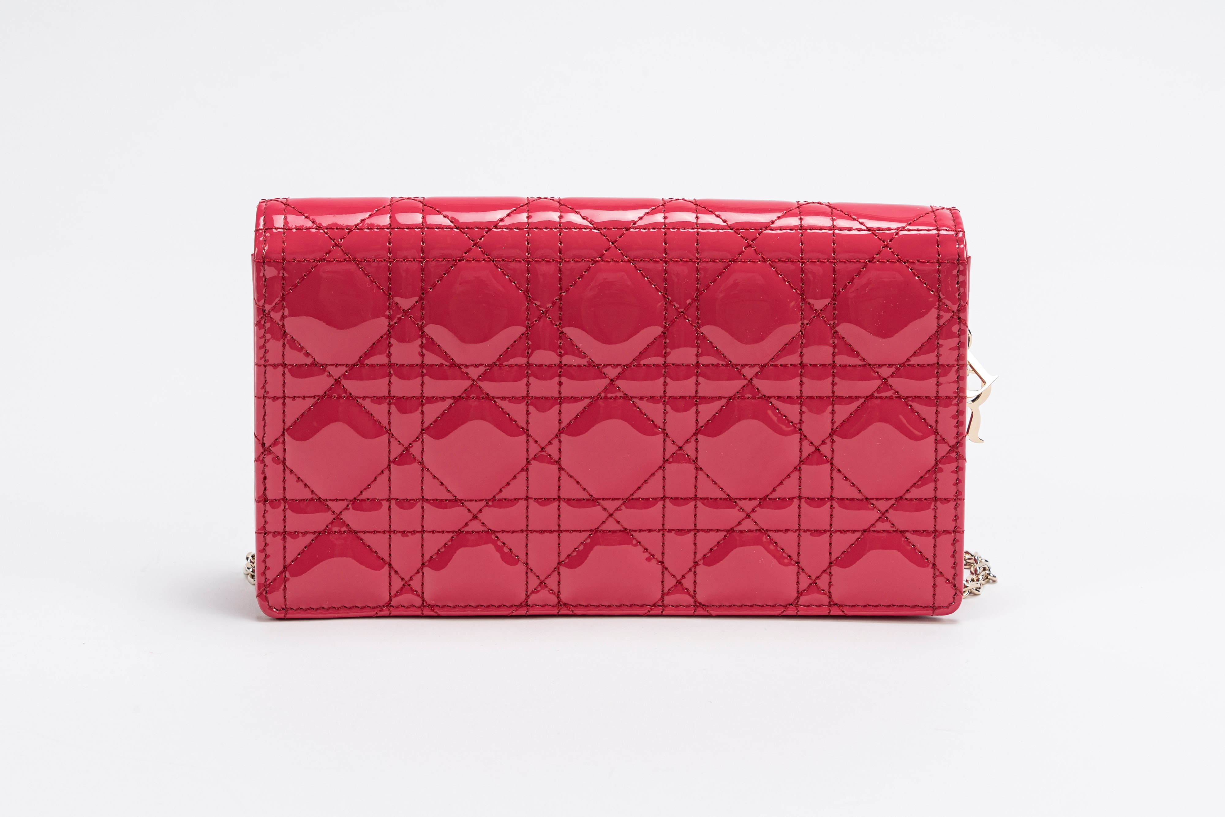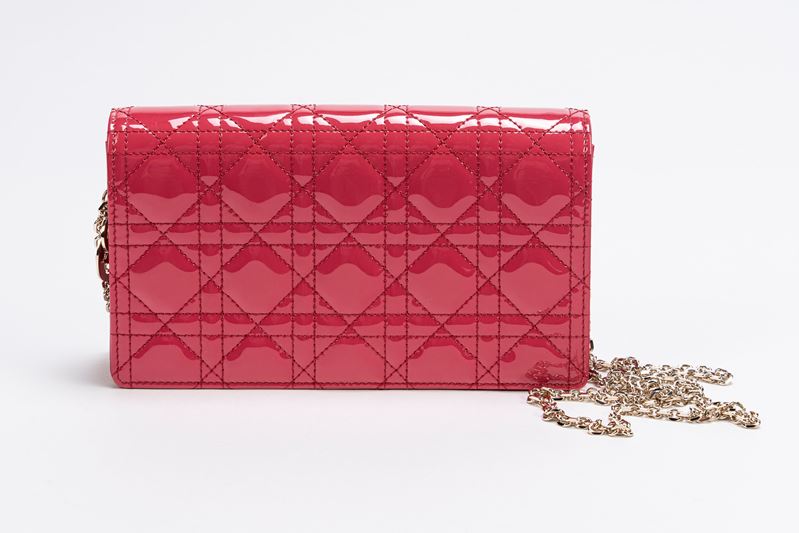 in pelle cannage verniciata color fucsia, tracolla a catena staccabile, dettagli in metallo, cm 22, con sacchetto, due bustine all'internoBase d'asta